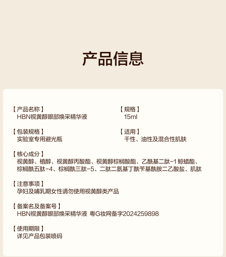 商品名称:HBN视黄醇眼部焕采精华液15ml YJH2001