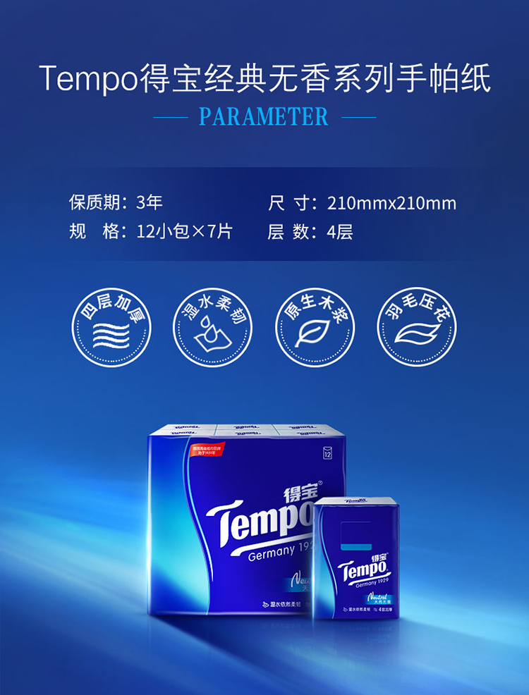 商品名称:Tempo/得宝迷你无香手帕纸4层7张*12包