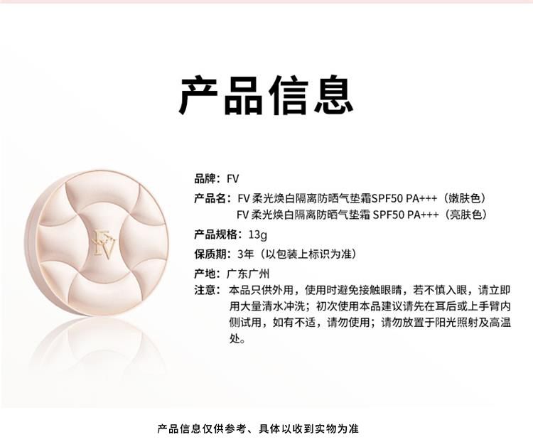 商品名称:FV 柔光焕白气垫防晒气垫霜 13g 面部防紫外线隔离遮瑕四效合一 赠替换装*2+粉扑*1+卸妆油*3