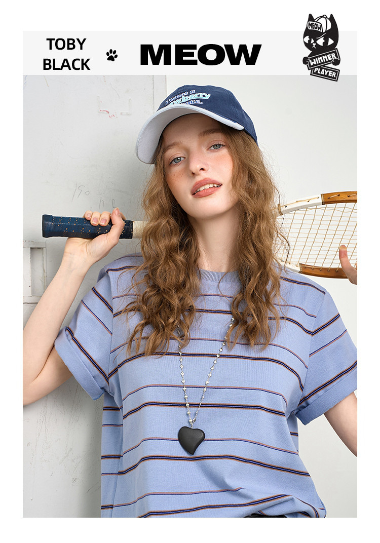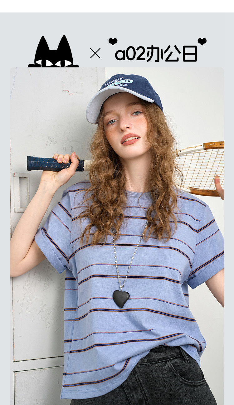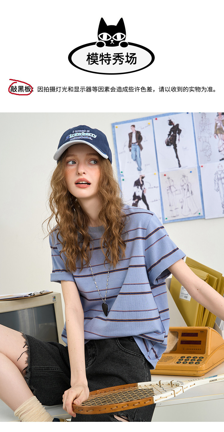商品名称:条纹撞色慵懒小个子百搭短袖上衣2025夏季休闲宽松女式T恤 745309