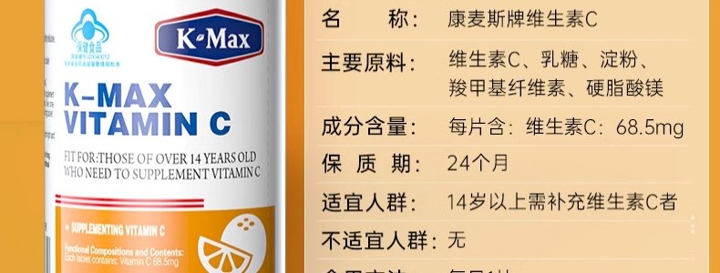 商品名称:美国 康麦斯(K-Max) 维生素C咀嚼片 60片