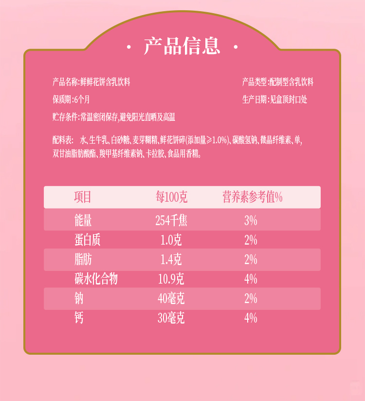商品名称:新希望雪兰鲜鲜花饼牛奶饮品