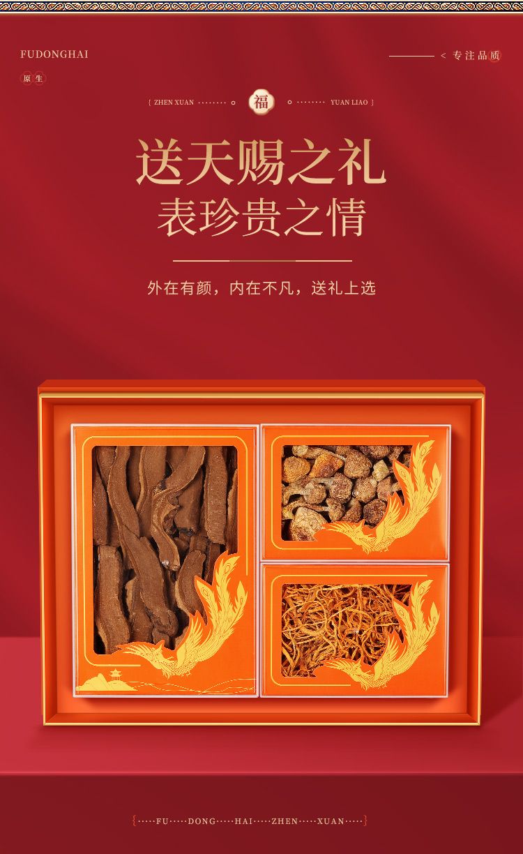 【福东海】灵芝片姬松茸虫草花三拼礼盒200克/盒-灵芝片100克(大盒)+姬松茸50克(小盒)+虫草花50克(小盒)