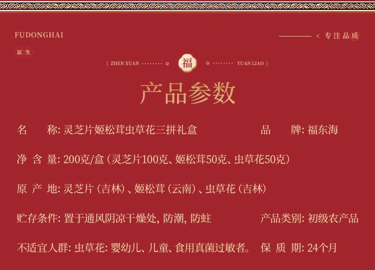 商品名称:【福东海】灵芝片姬松茸虫草花三拼礼盒200克/盒-灵芝片100克(大盒)+姬松茸50克(小盒)+虫草花50克(小盒)