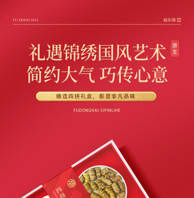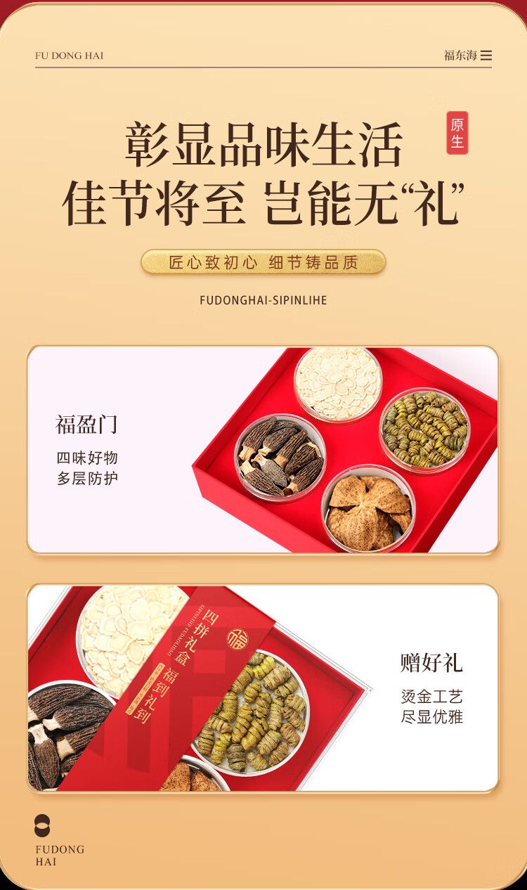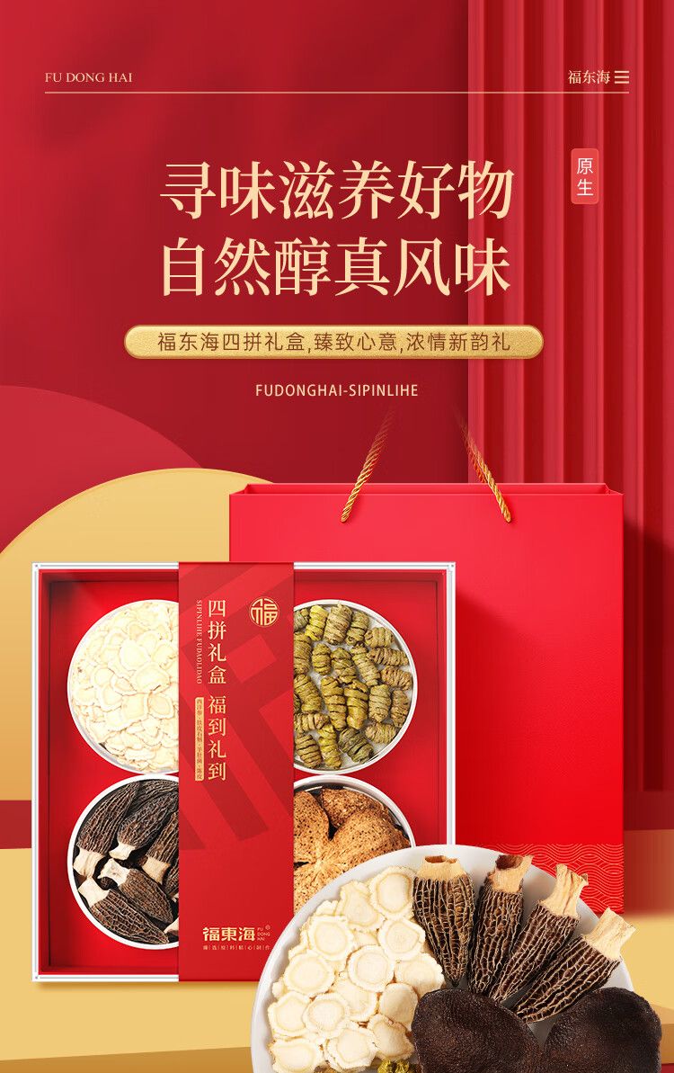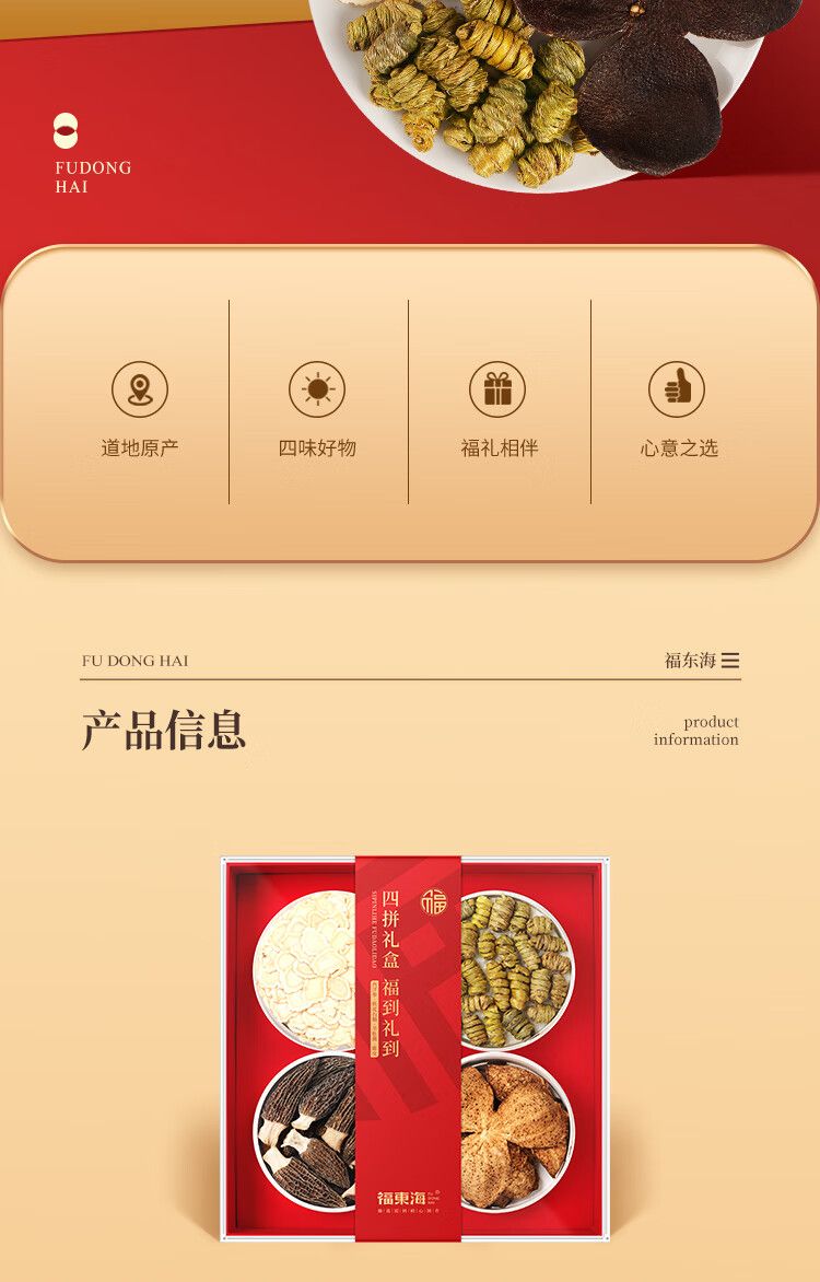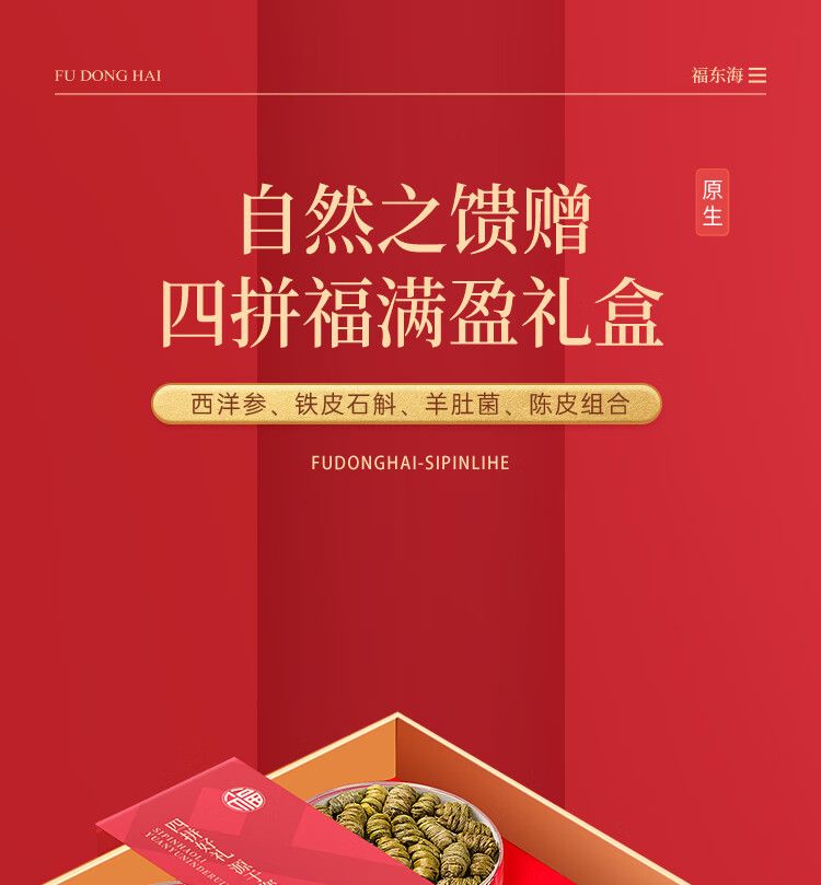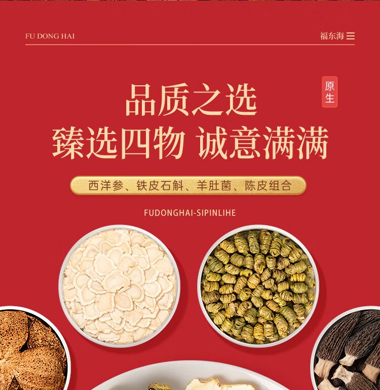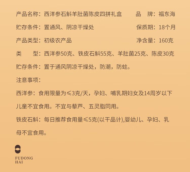 商品名称:【福东海】四拼礼盒160克/盒(西洋参50克+铁皮石斛55克+羊肚菌25克+陈皮30克)