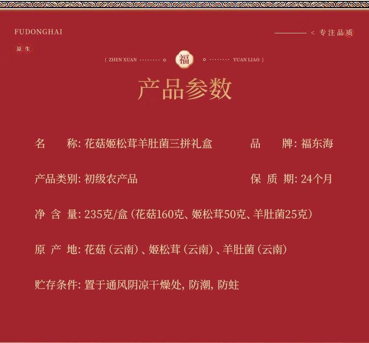 商品名称:【福东海】花菇姬松茸羊肚菌三拼礼盒235克/盒(花菇160克(大盒)+羊肚菌25克(小盒)+姬松茸50克(小盒)