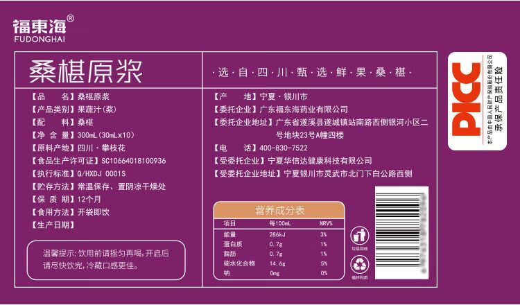 商品名称:【福东海】桑葚原浆300毫升(30ml*10)/盒