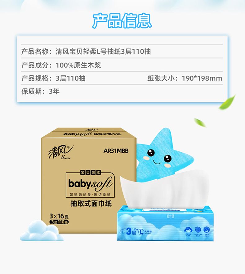 商品名称:清风 宝贝亲柔L号抽纸 3包*1提