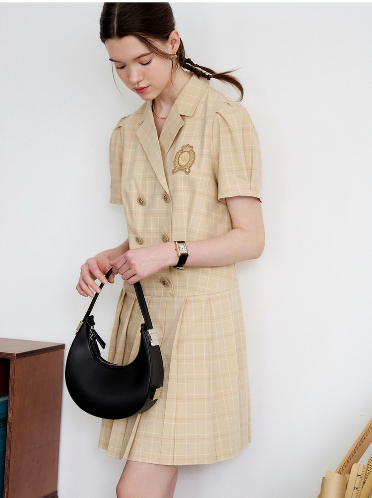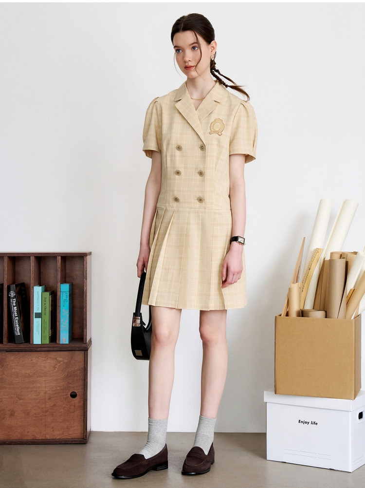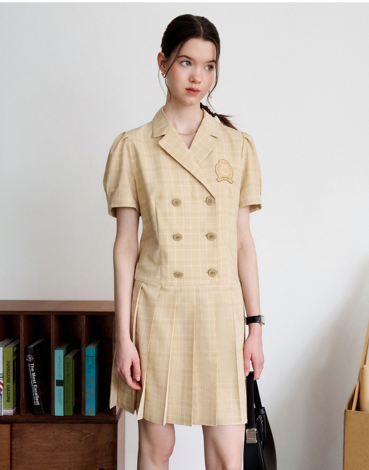 连衣裙女夏季学院风双排扣复古西装领短袖百褶裙子女 410369