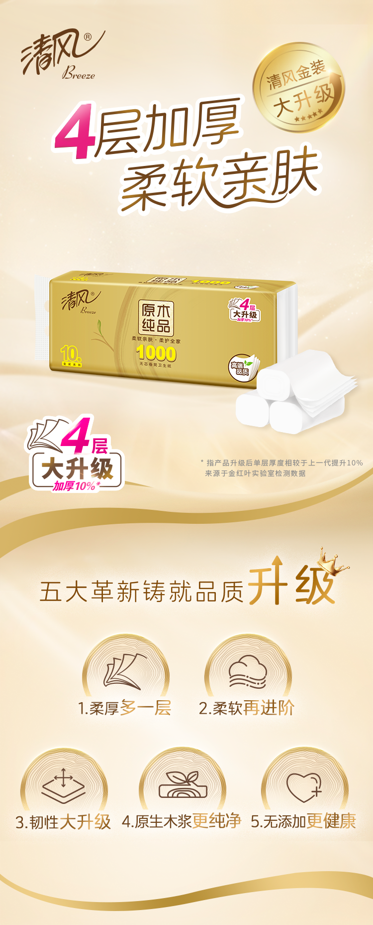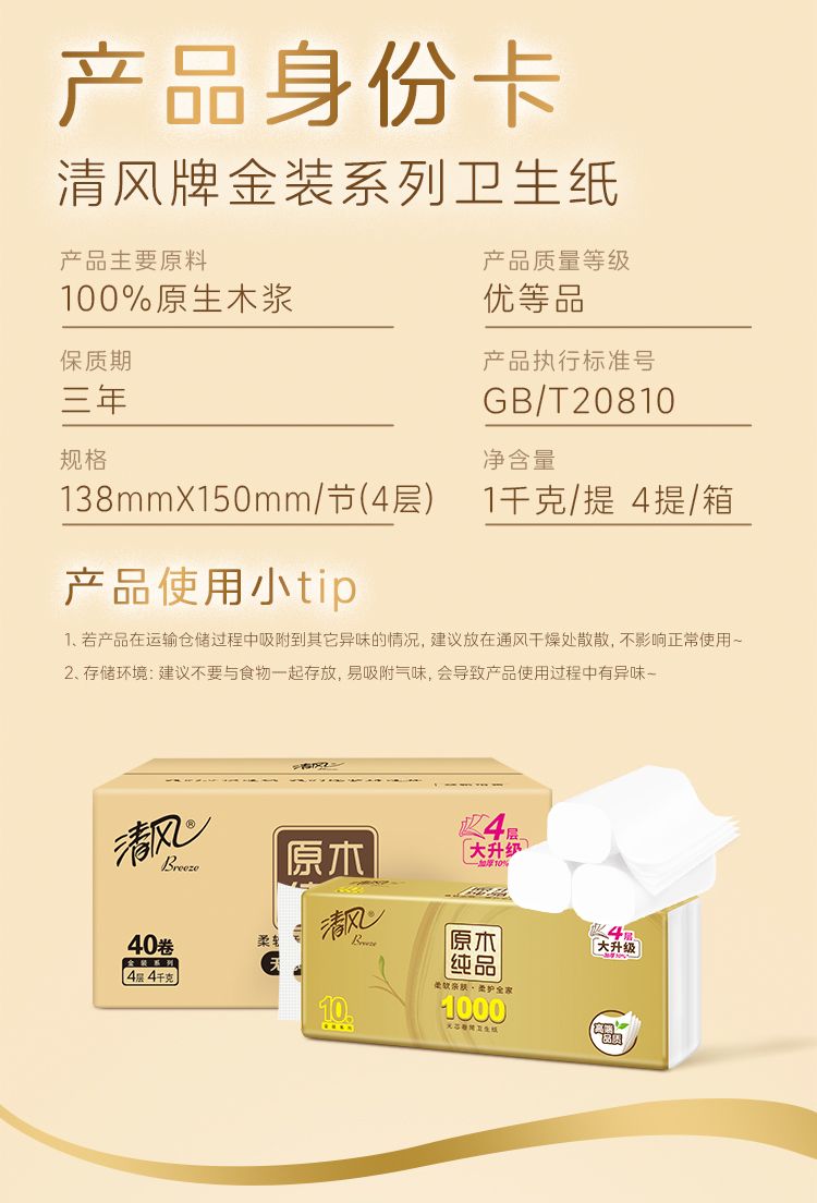 商品名称:清风 原木金装无芯卷纸 4层1000克*10卷*4提