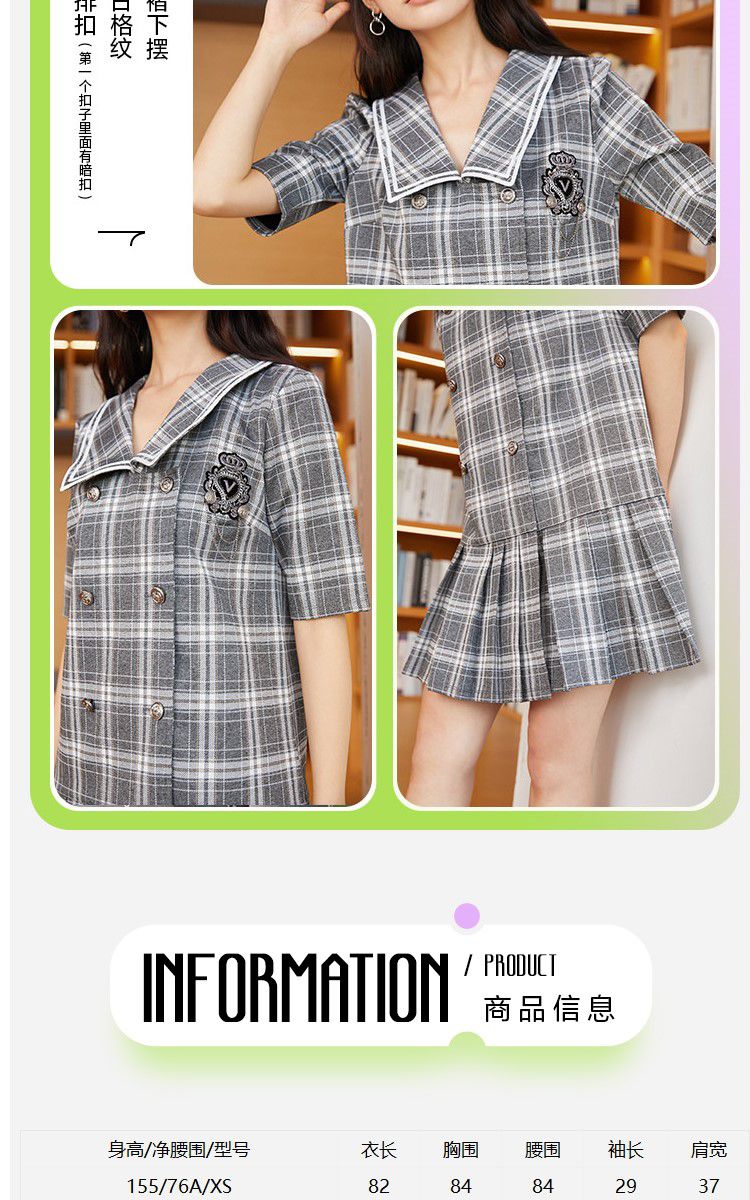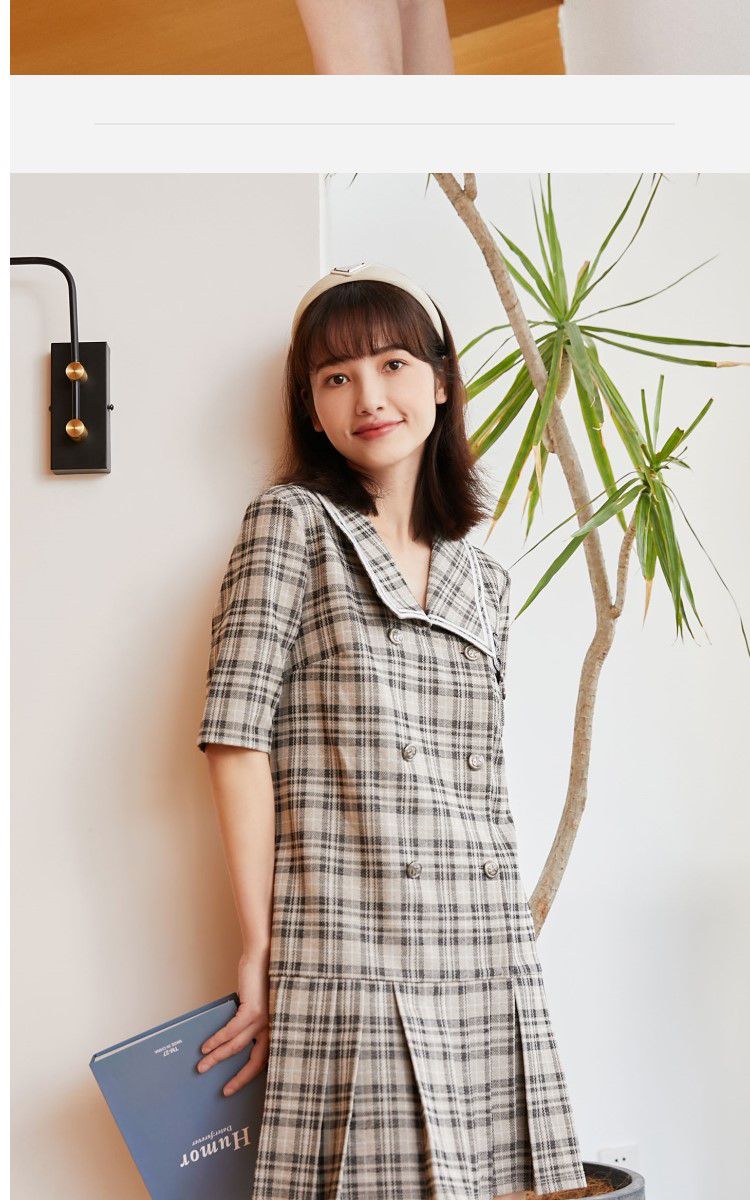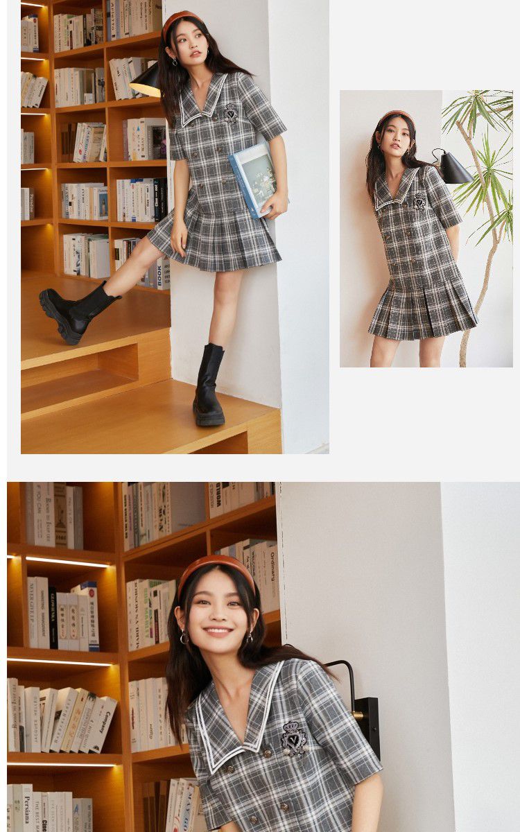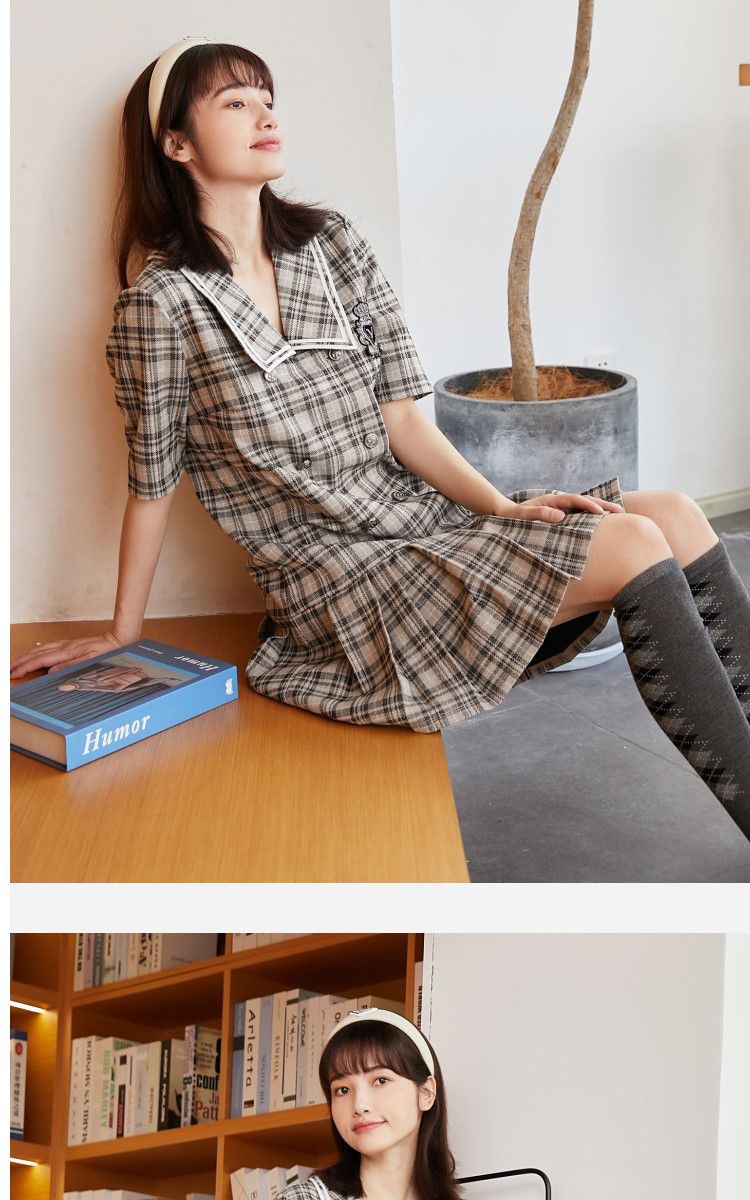 商品名称:【福利特卖款】春秋新学院风格纹大翻领百褶下摆连衣裙 014481