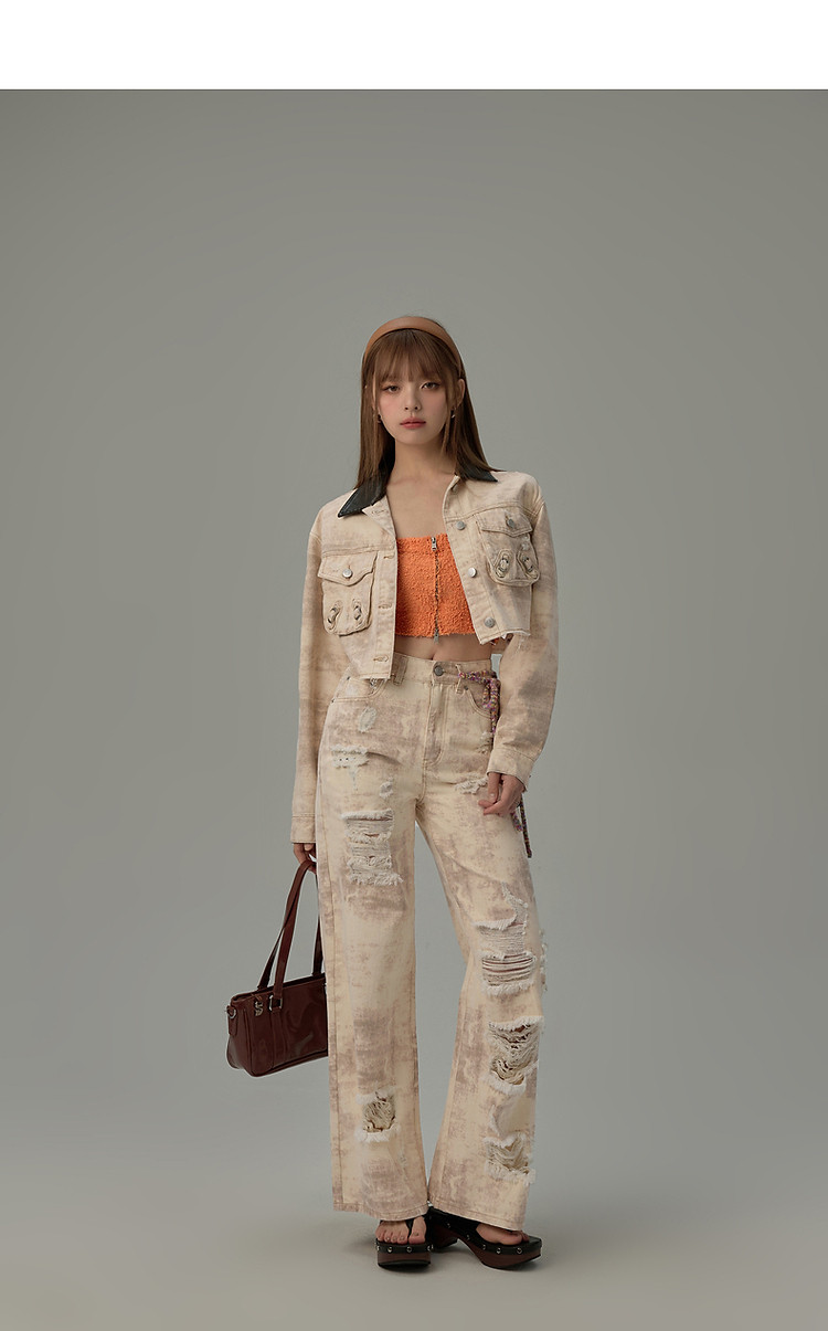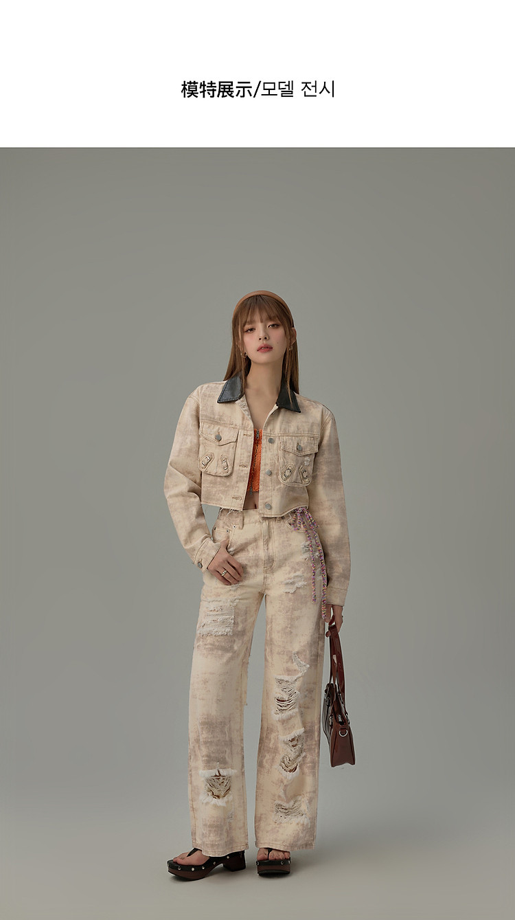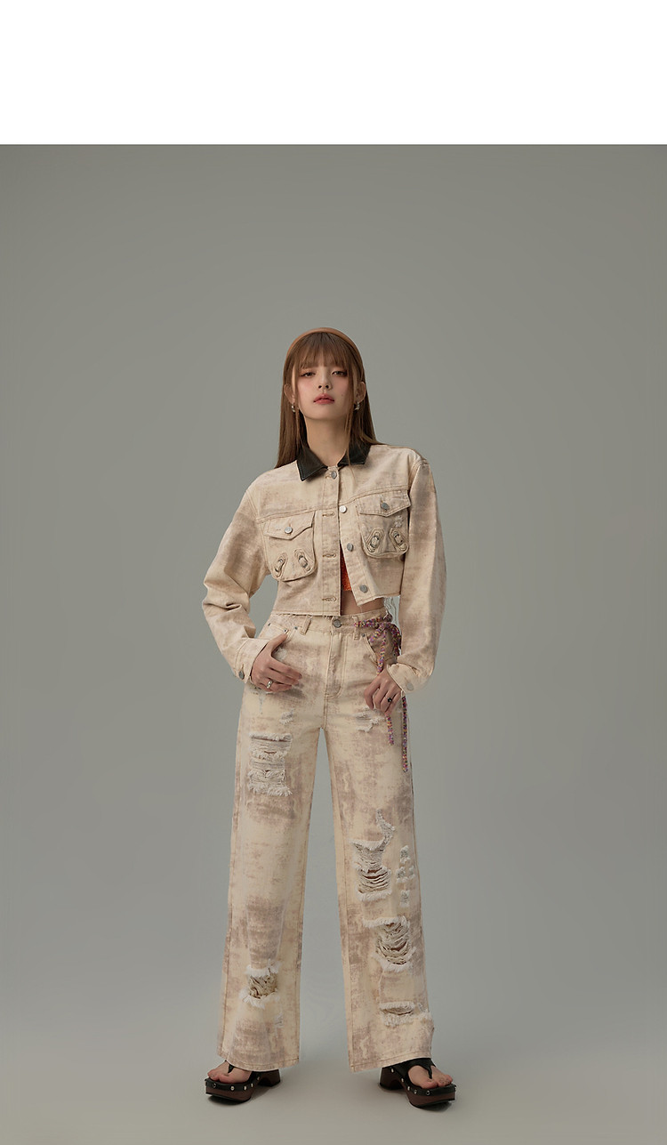 多口袋毛边长袖外套女2025夏沙漠破旧重工系列短款牛仔衣 632147