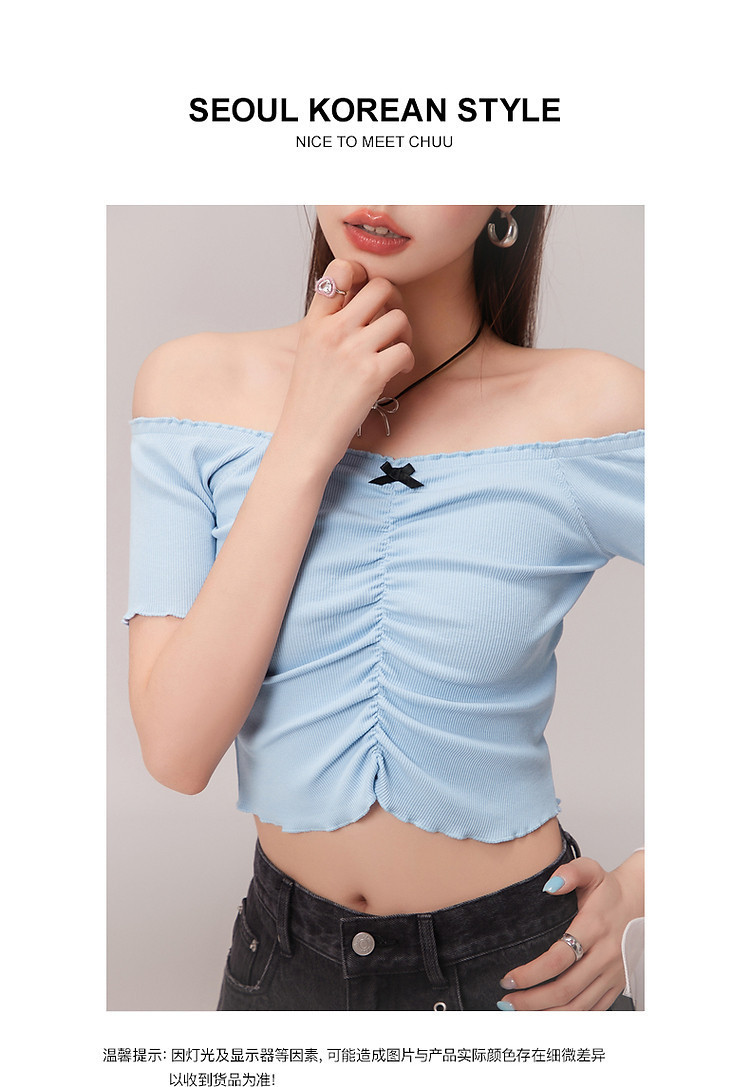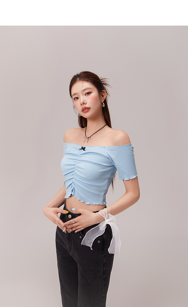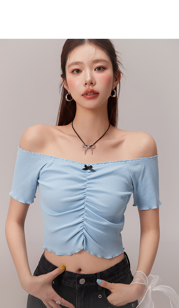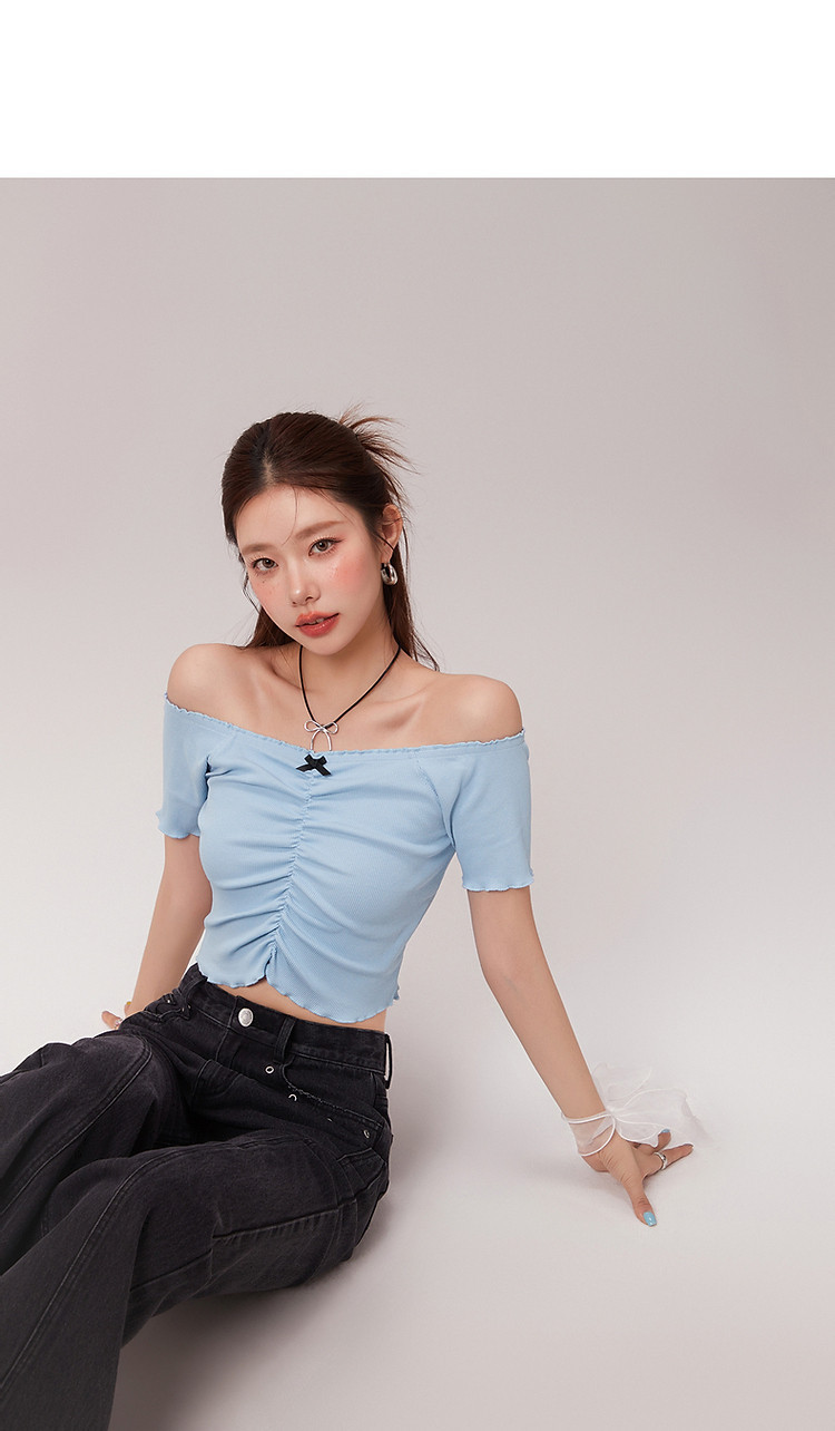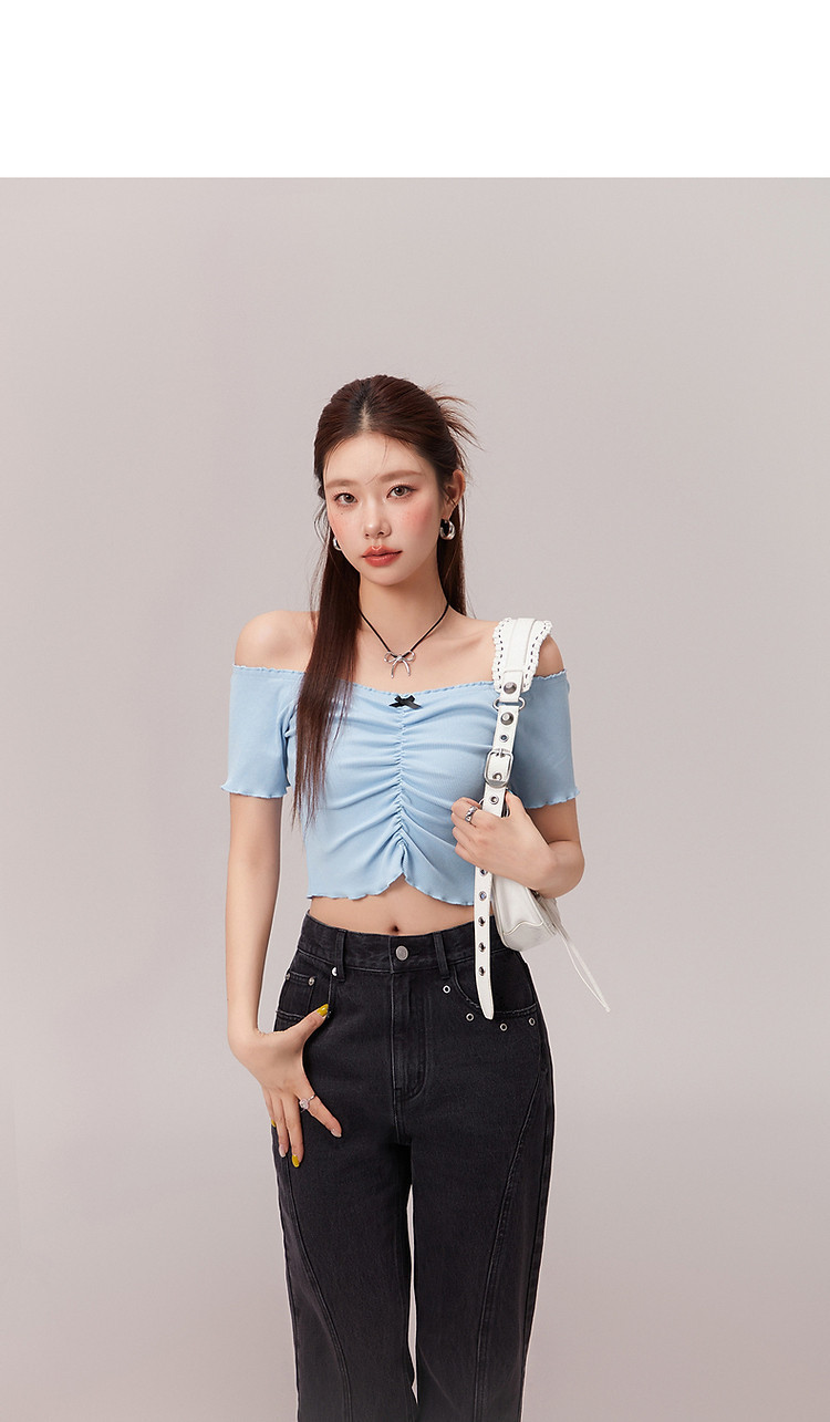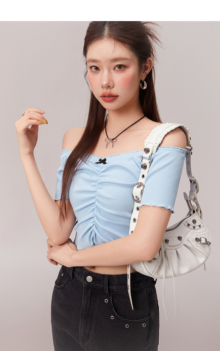 蝴蝶结褶皱一字肩T恤女2025夏辣妹性感baby蓝短袖上衣 119827