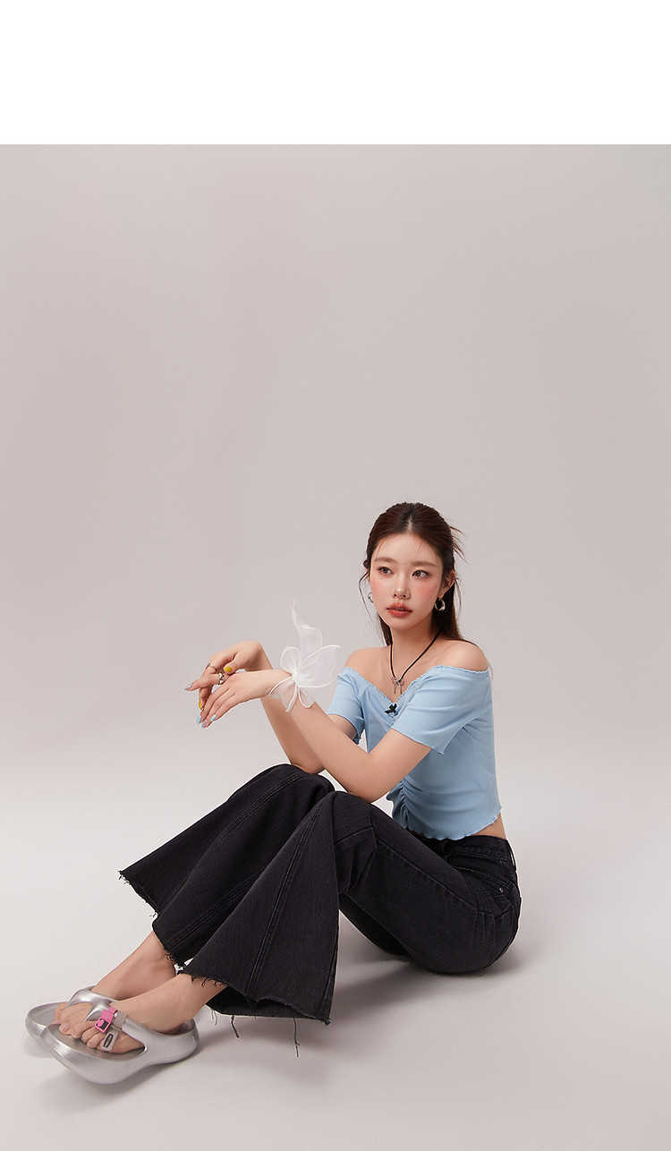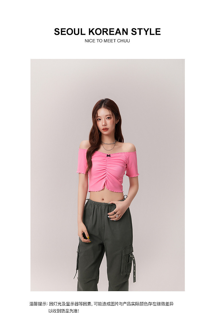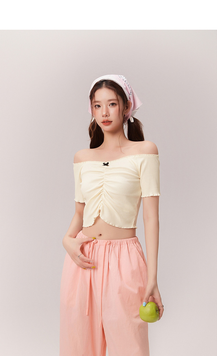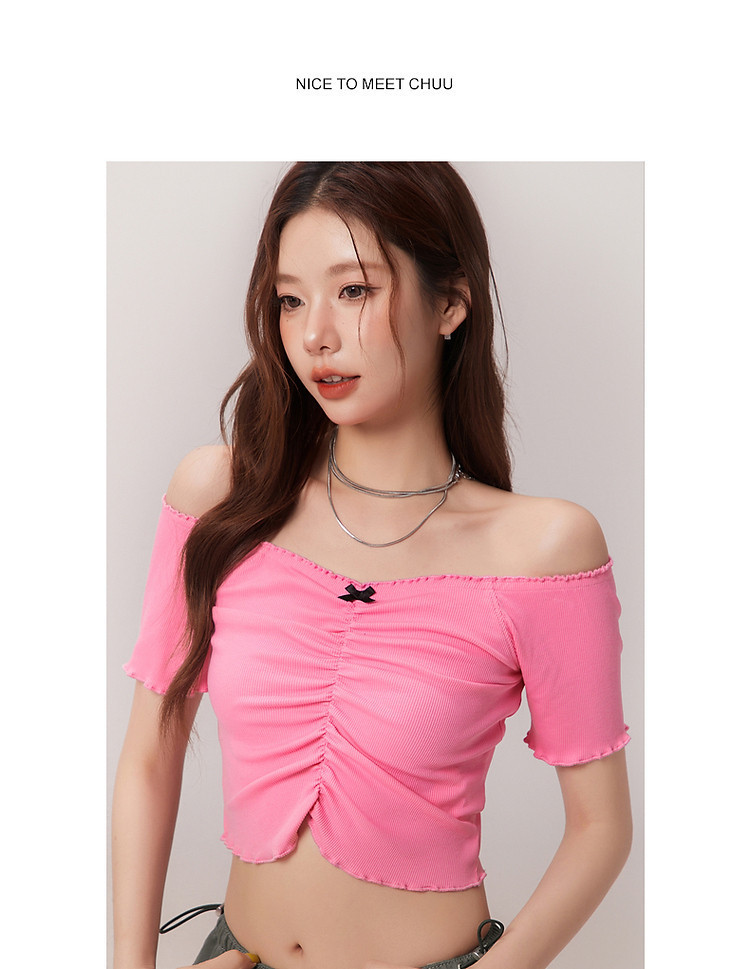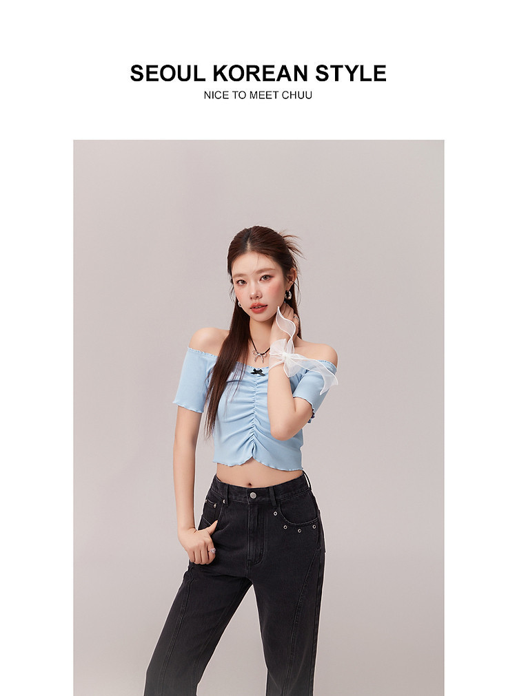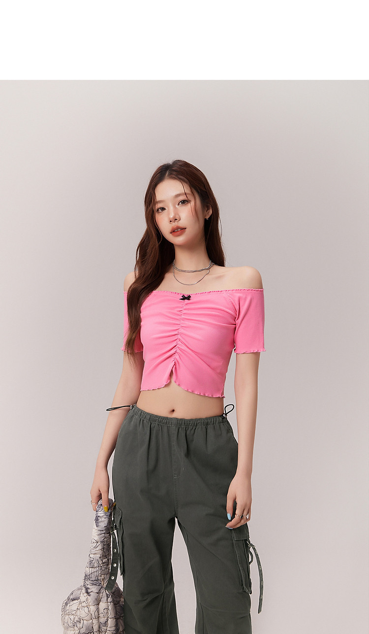 蝴蝶结褶皱一字肩T恤女2025夏辣妹性感baby蓝短袖上衣 119827