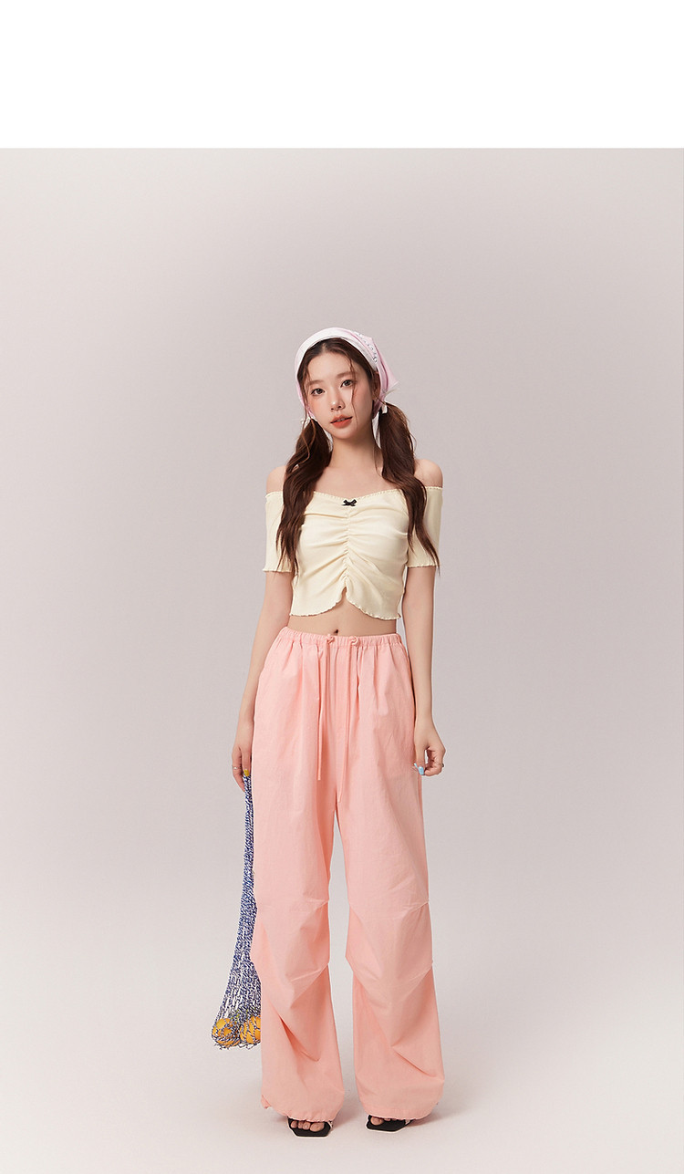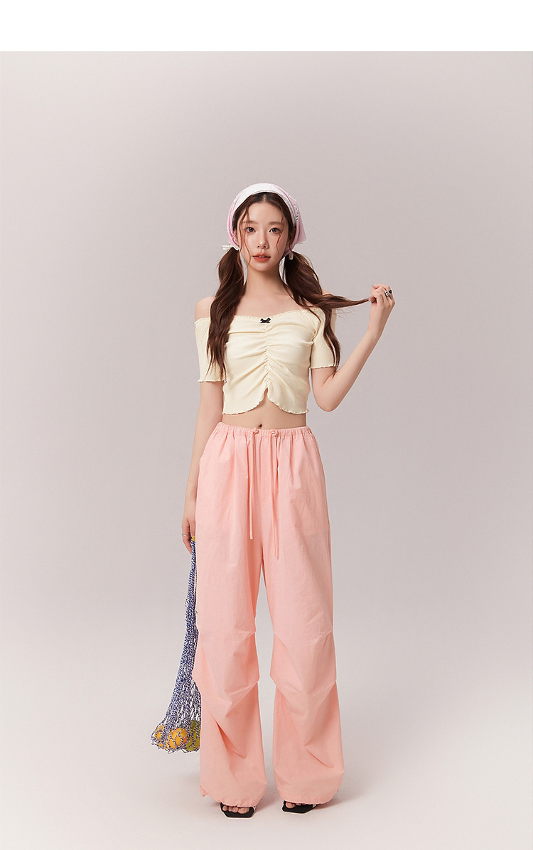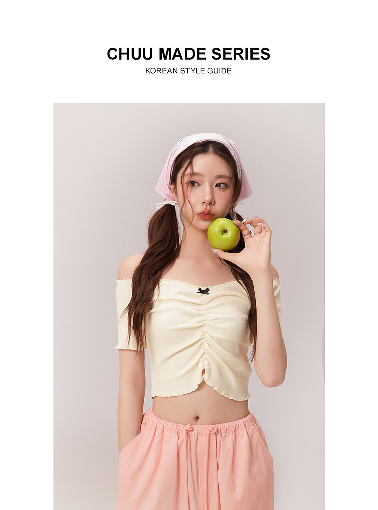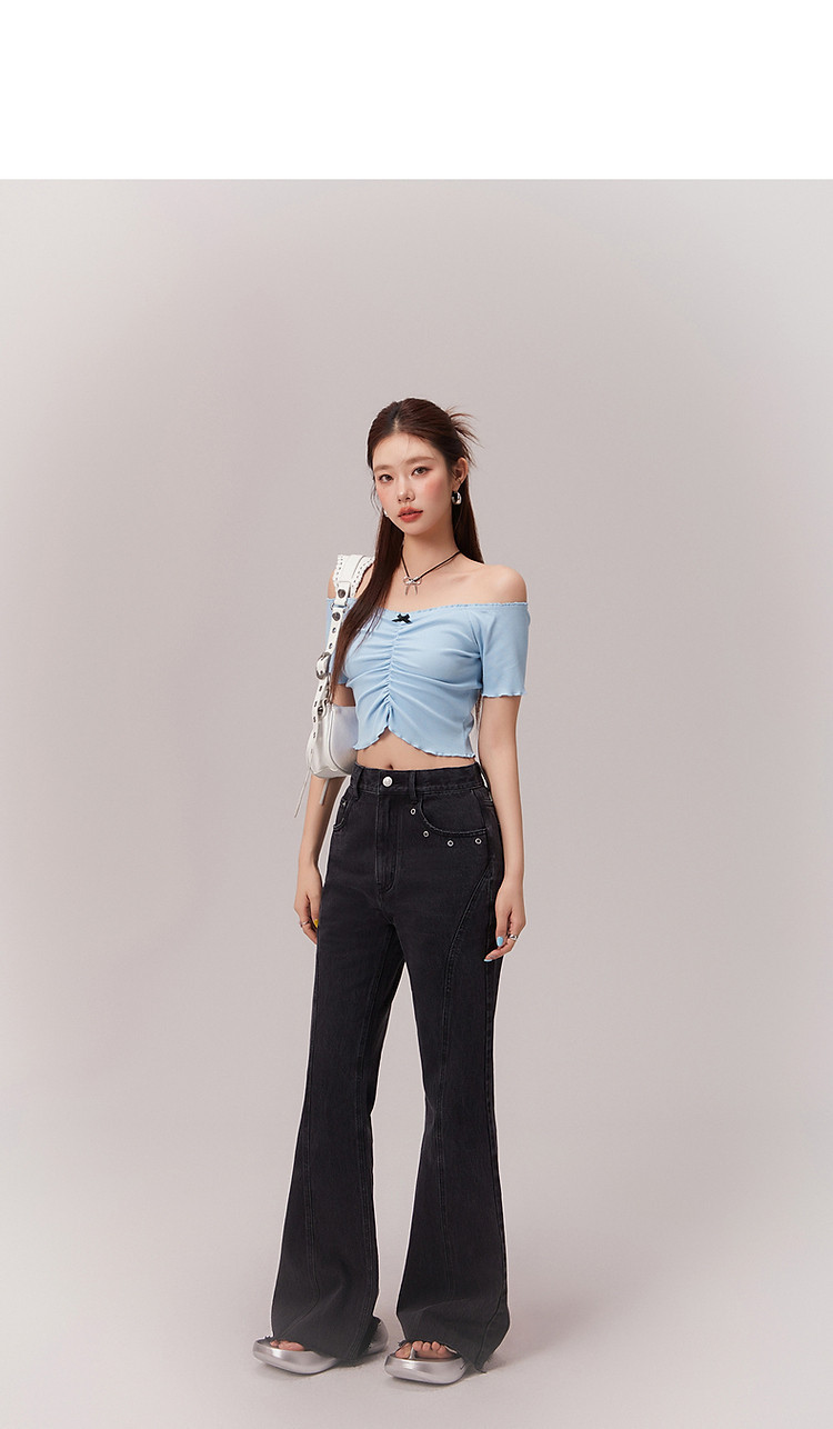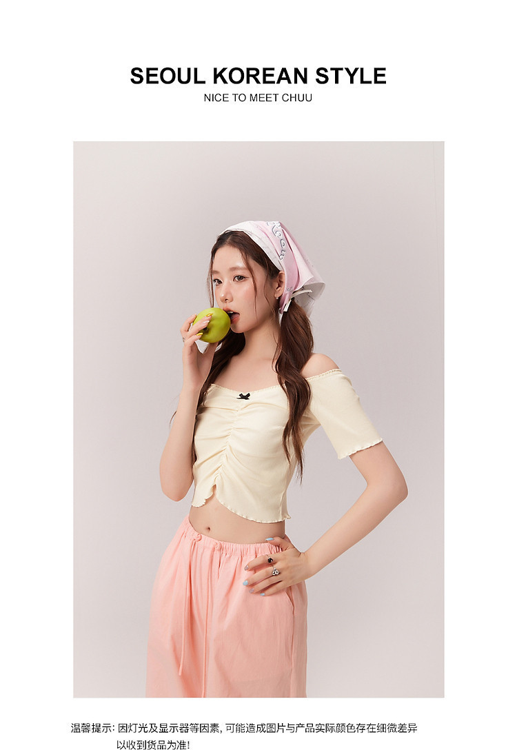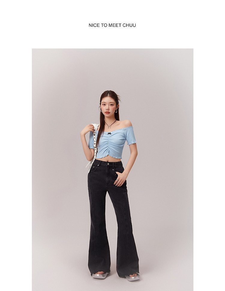 蝴蝶结褶皱一字肩T恤女2025夏辣妹性感baby蓝短袖上衣 119827