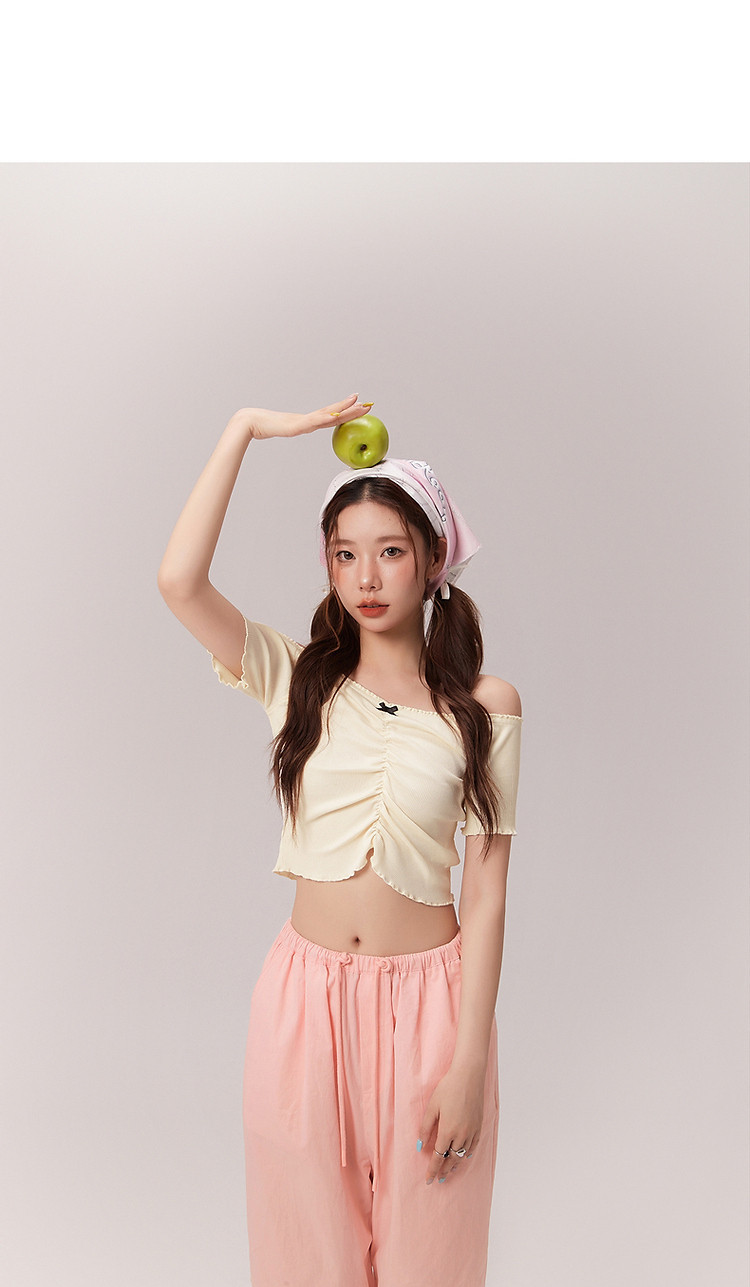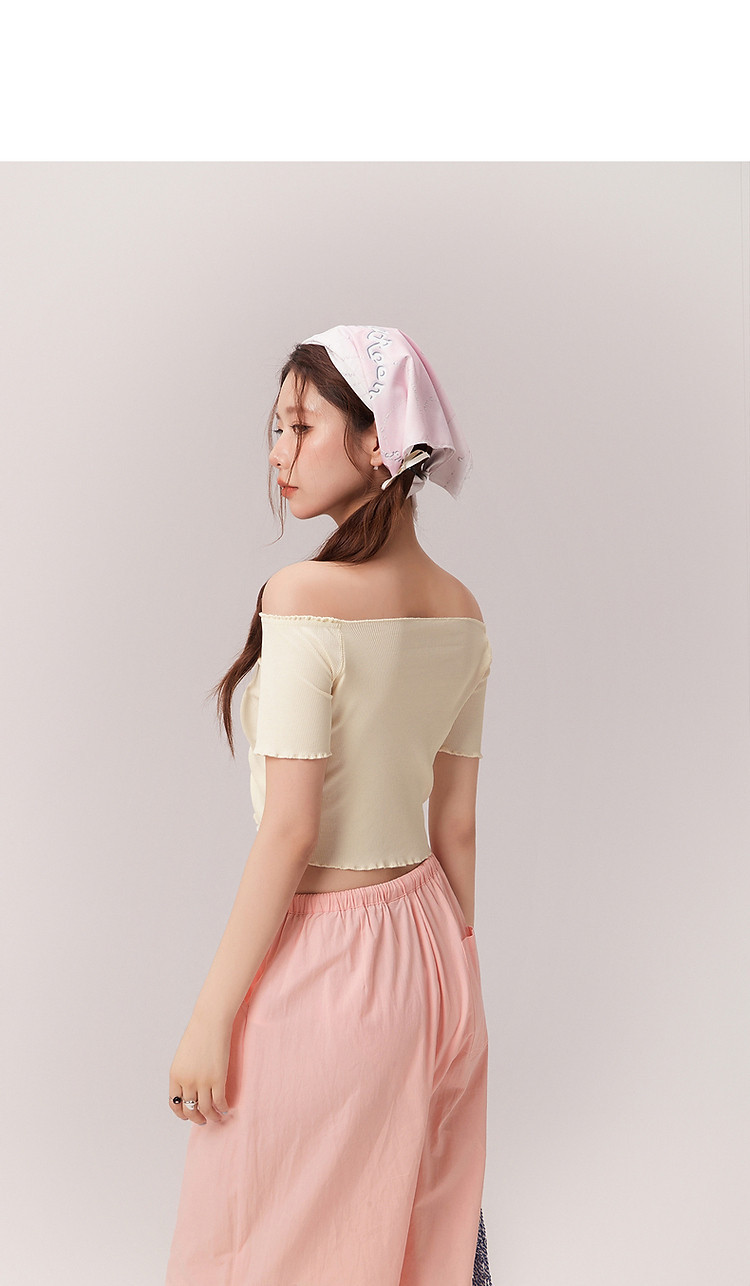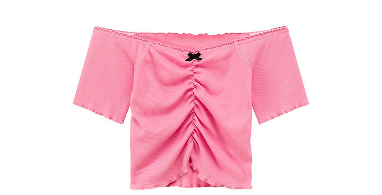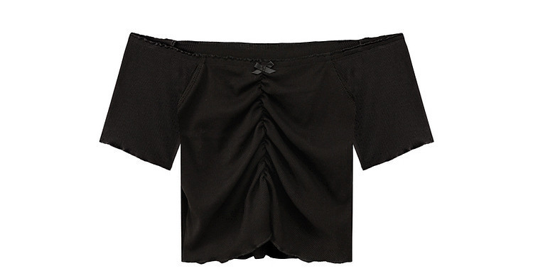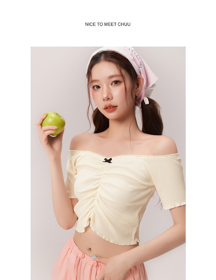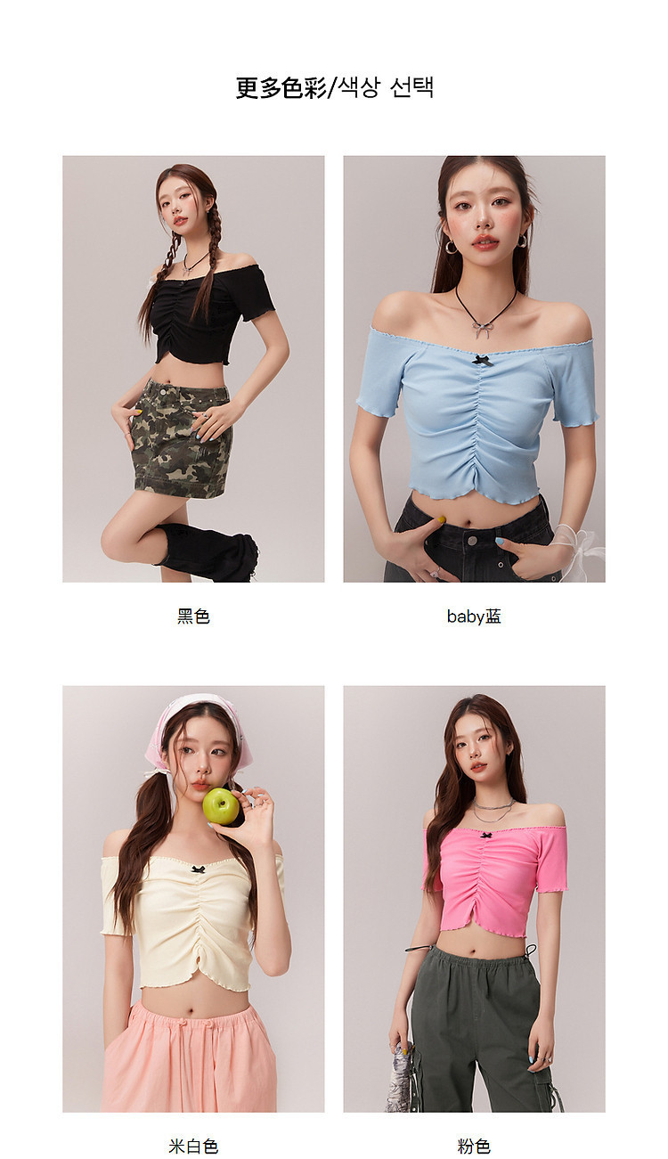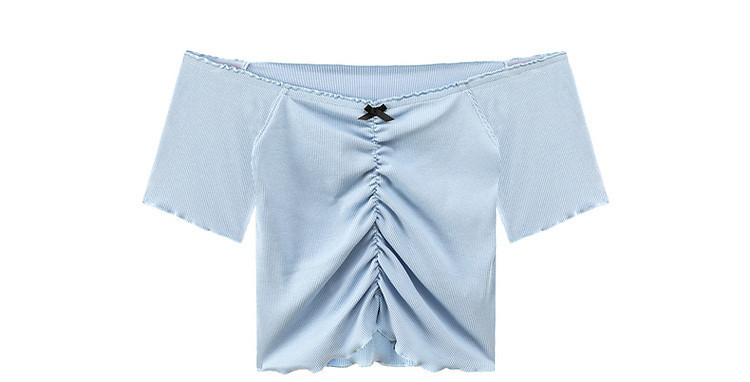 商品名称:蝴蝶结褶皱一字肩T恤女2025夏辣妹性感baby蓝短袖上衣 119827