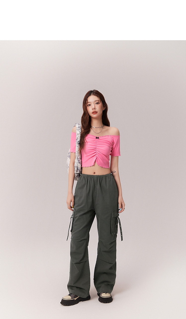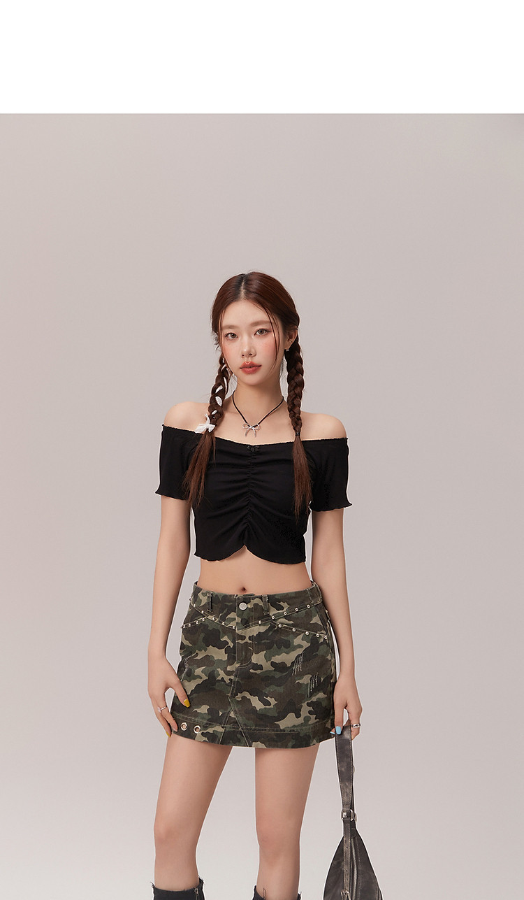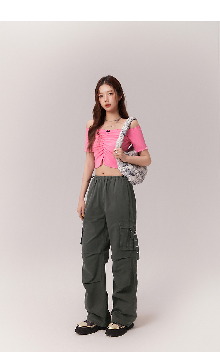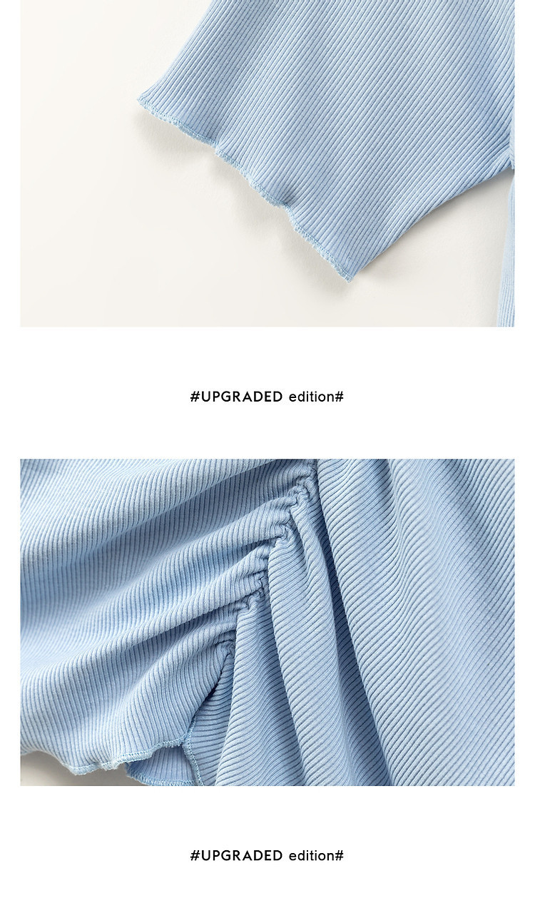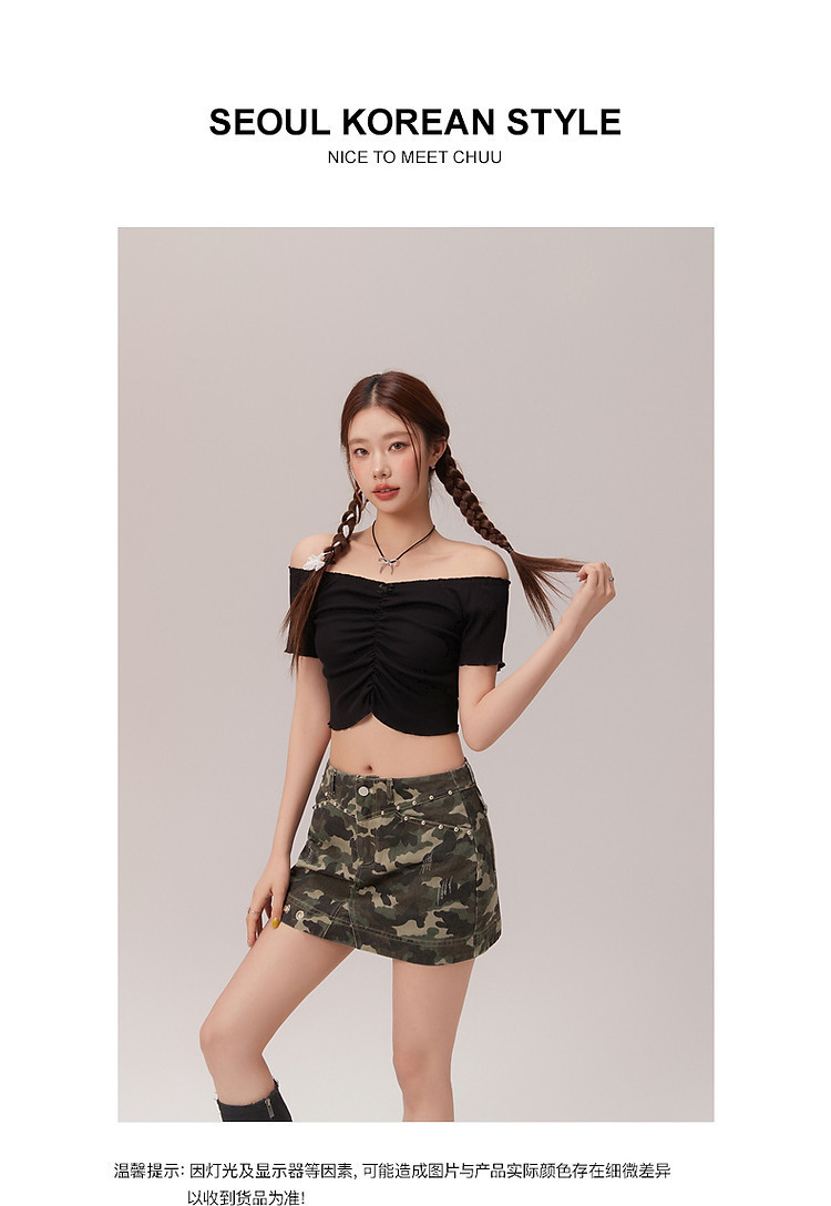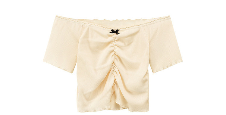 商品名称:蝴蝶结褶皱一字肩T恤女2025夏辣妹性感baby蓝短袖上衣 119827