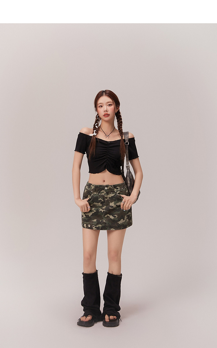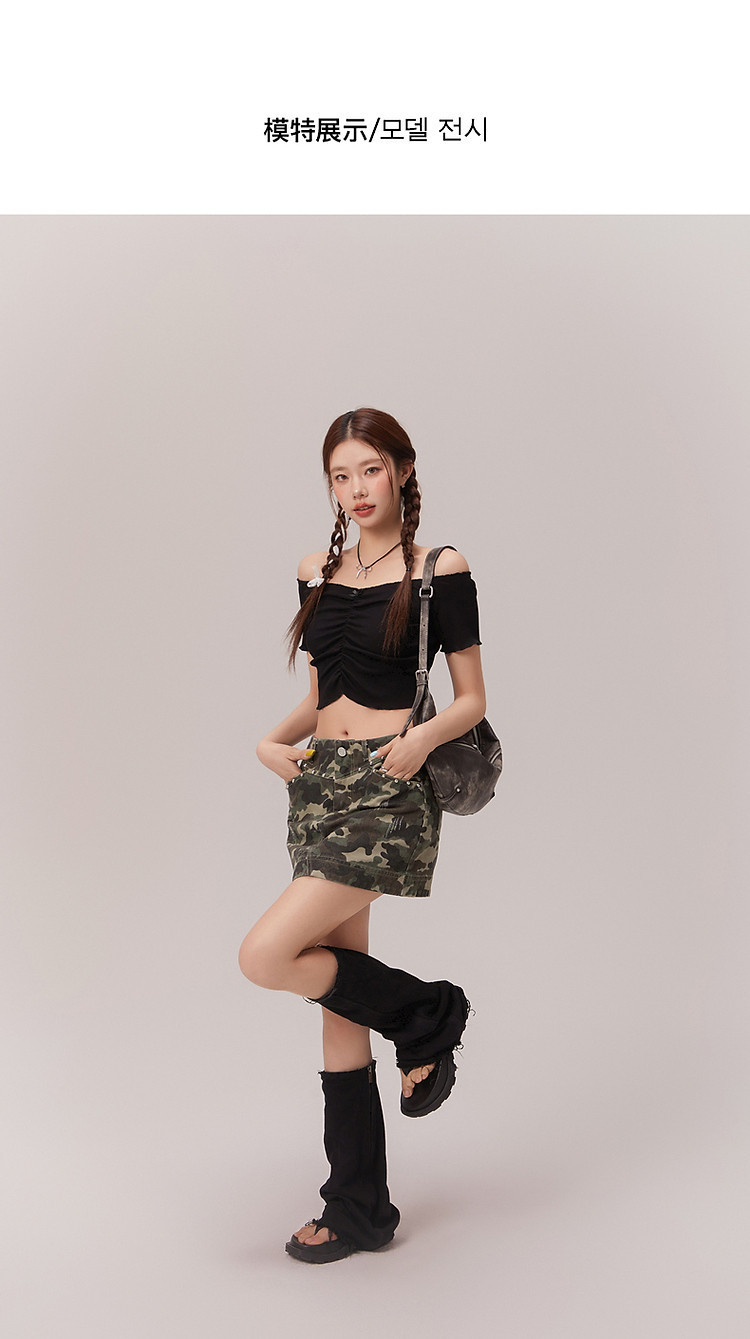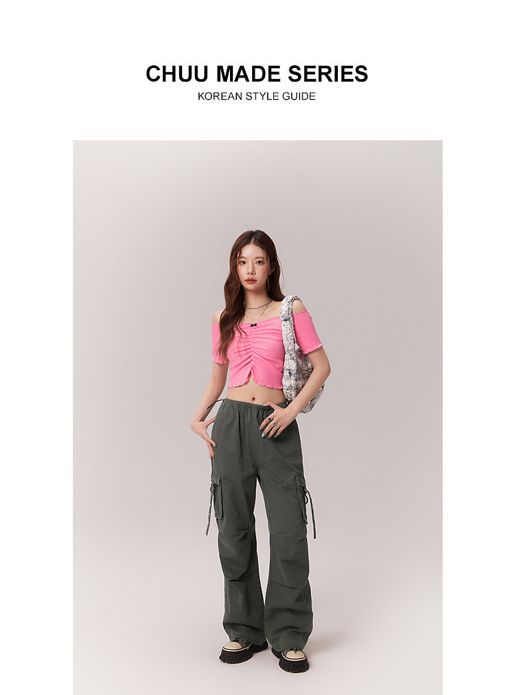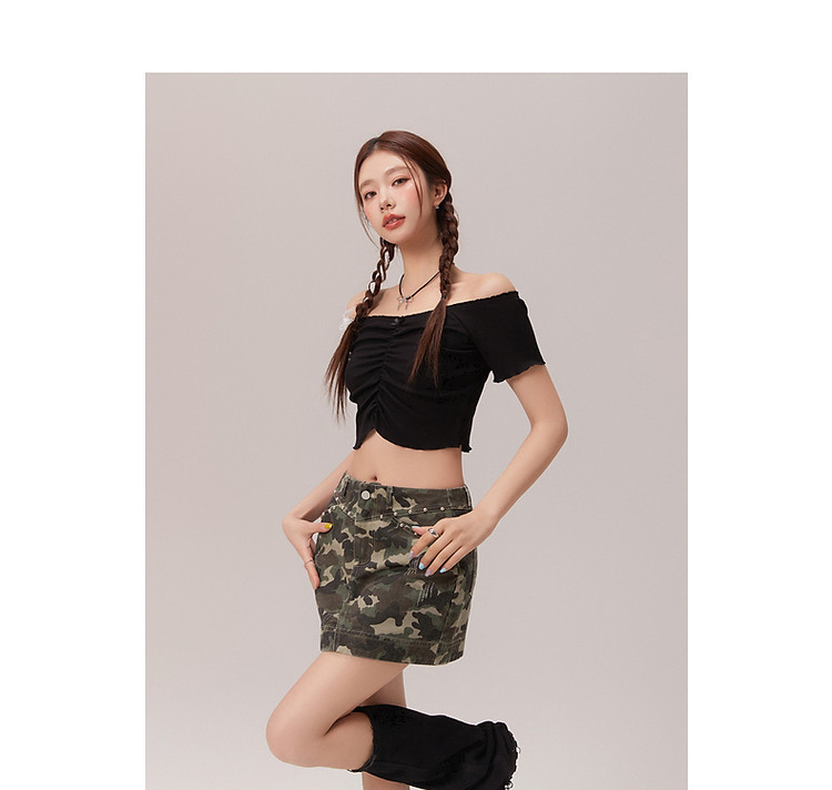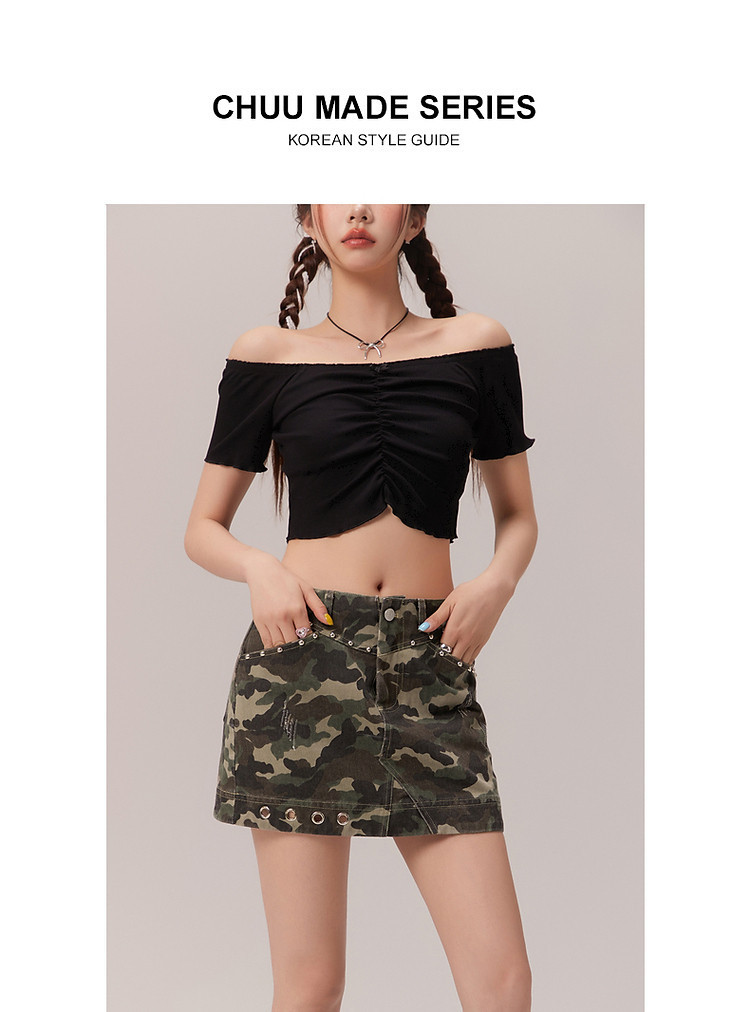 商品名称:蝴蝶结褶皱一字肩T恤女2025夏辣妹性感baby蓝短袖上衣 119827