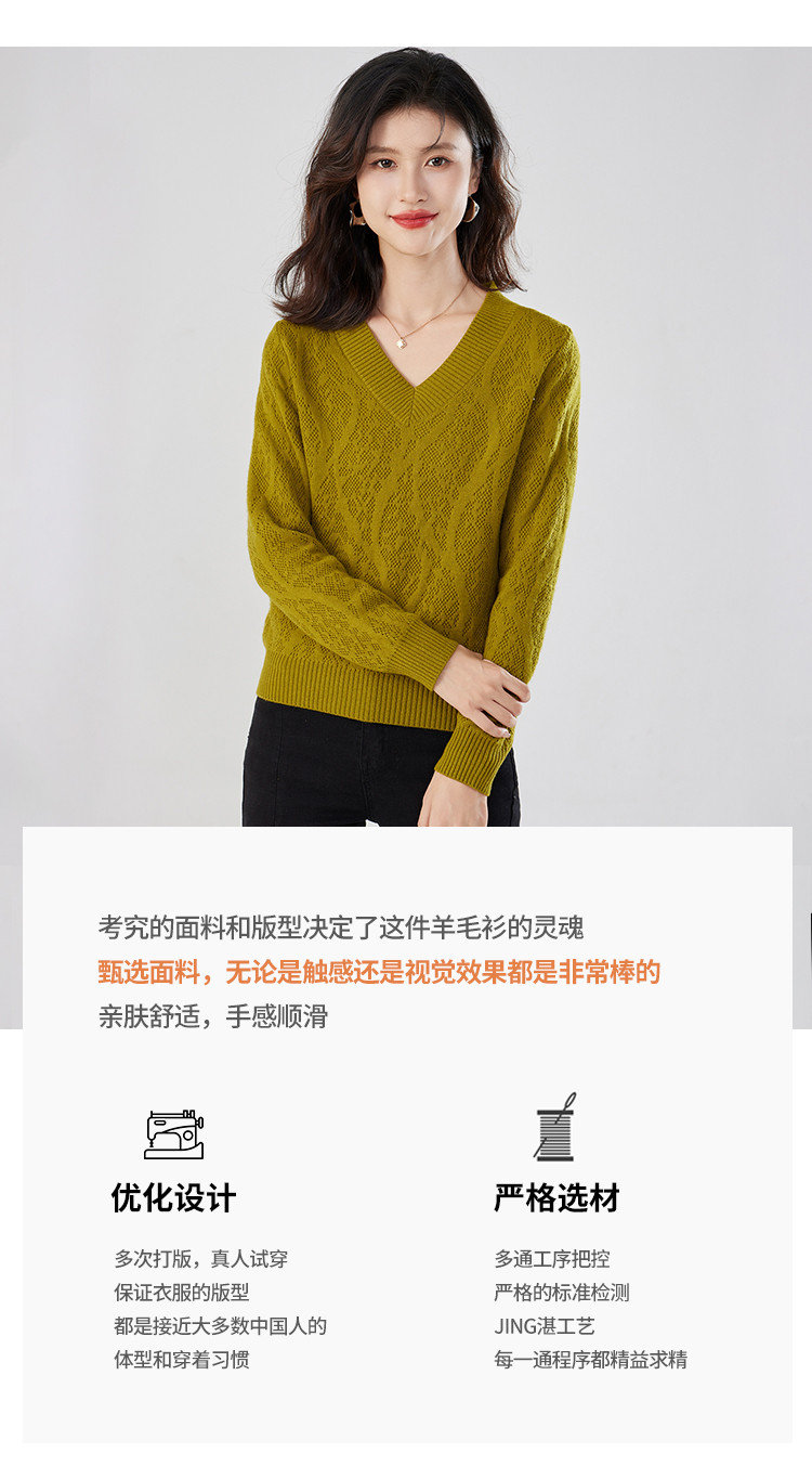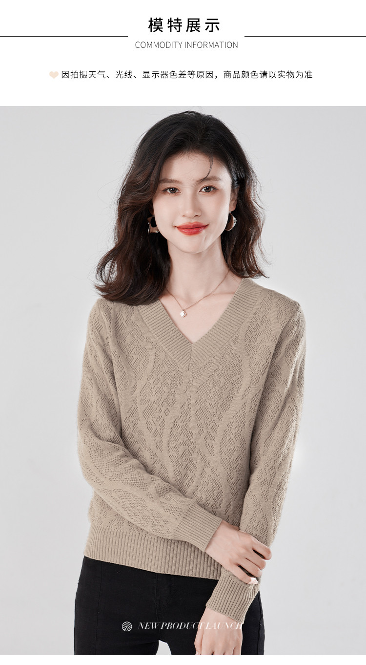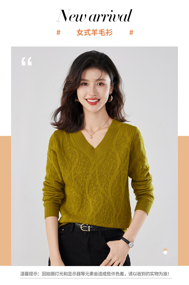 商品名称:【含羊毛】简约休闲纯色气质V领羊毛衫女复古通勤百搭套头毛衣 840031