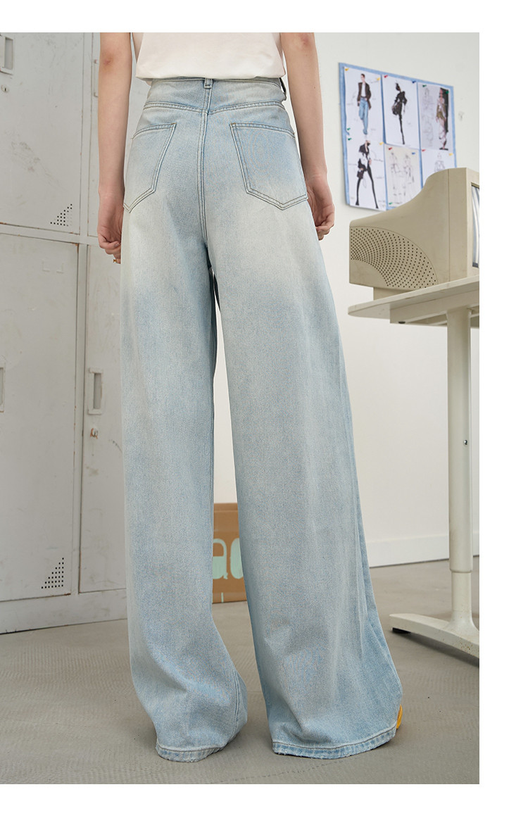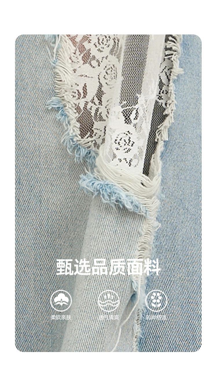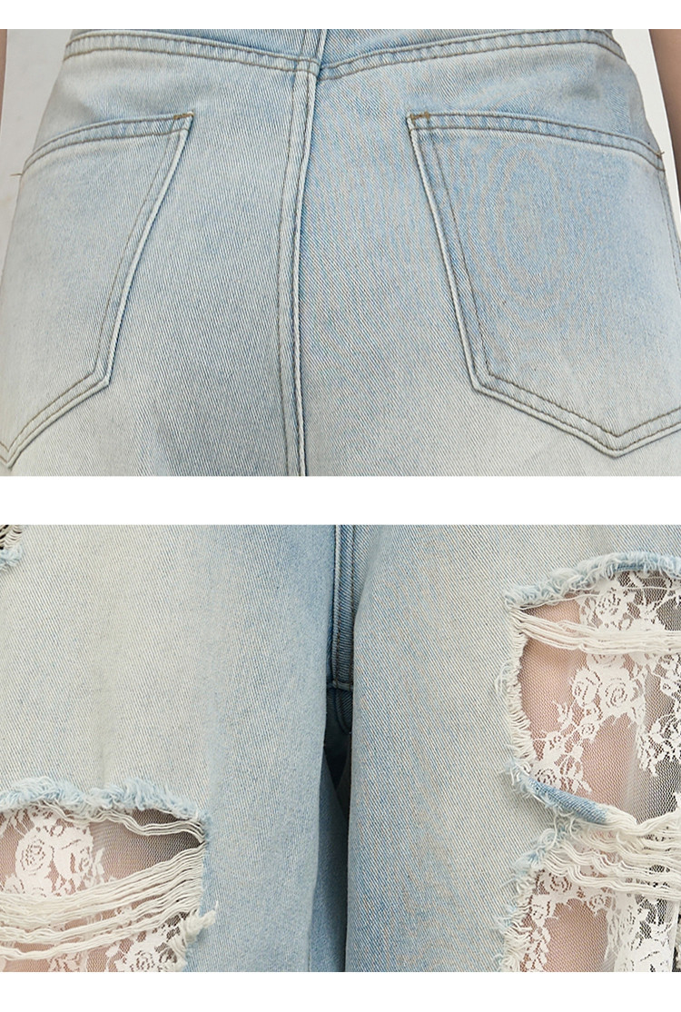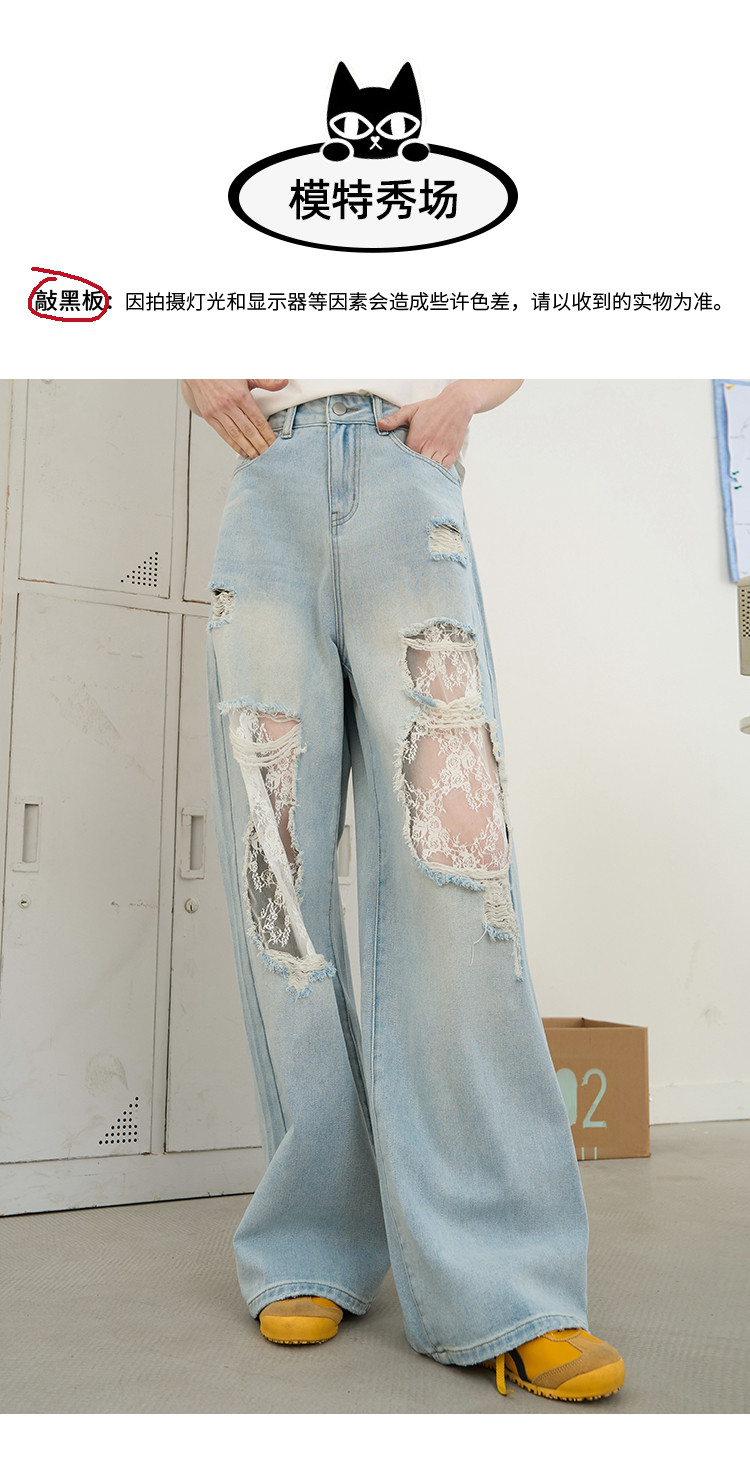 商品名称:蕾丝拼接破洞宽松高腰阔腿裤2025夏季百搭休闲女式牛仔裤 496989