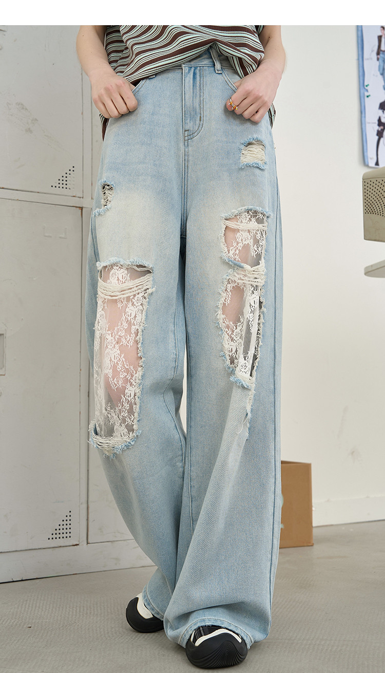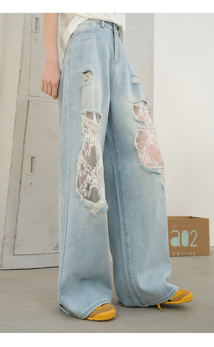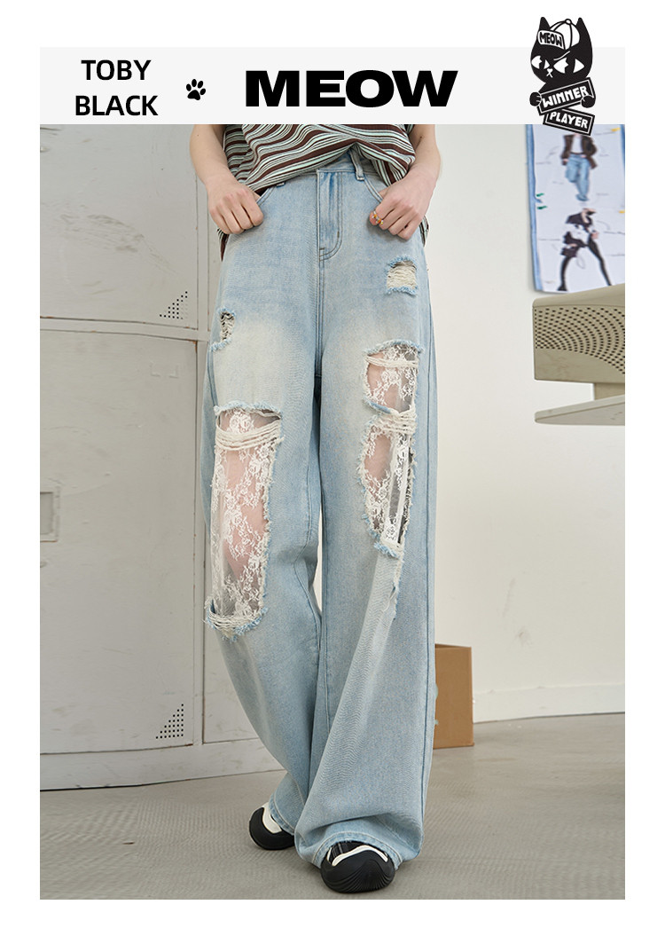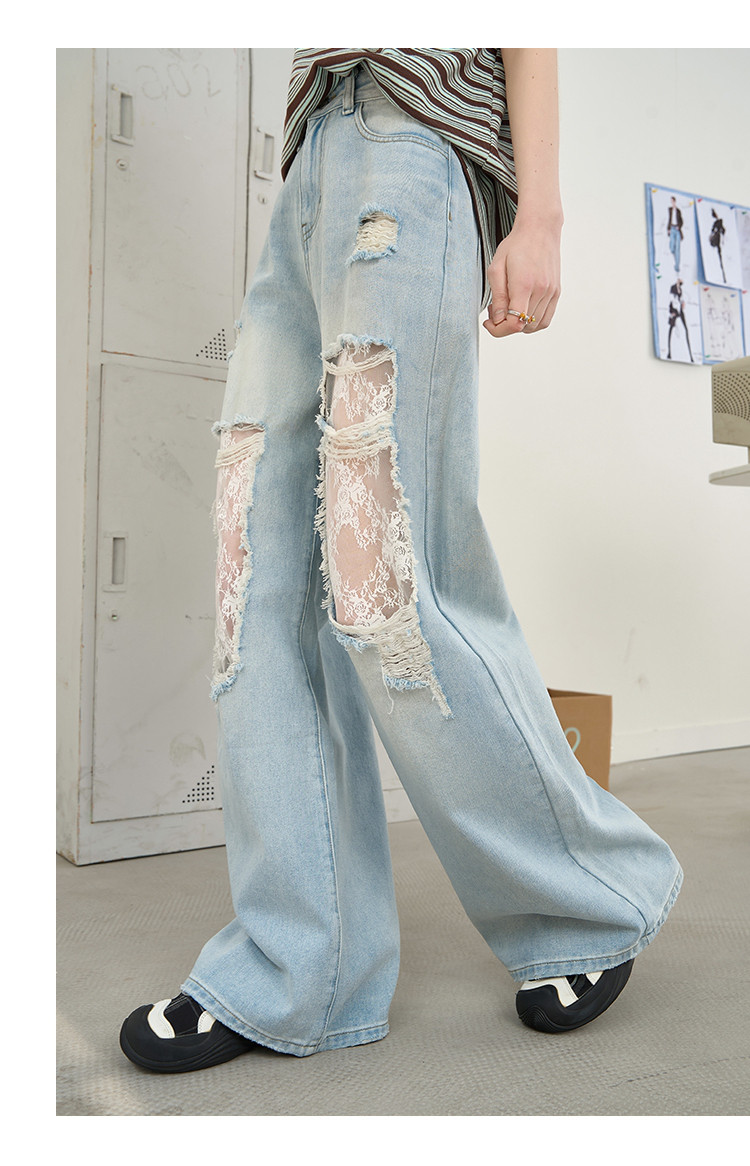 蕾丝拼接破洞宽松高腰阔腿裤2025夏季百搭休闲女式牛仔裤 496989