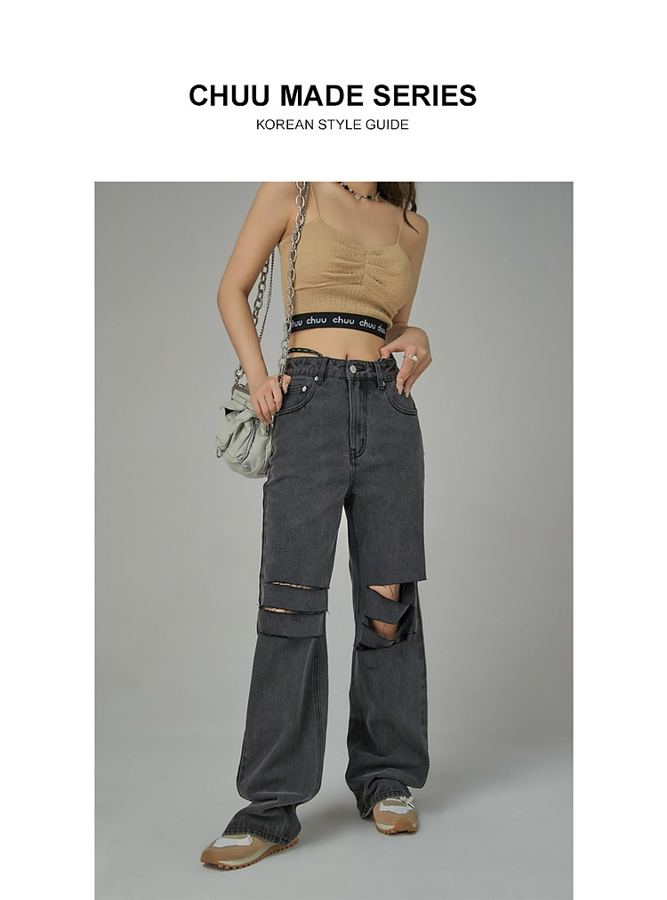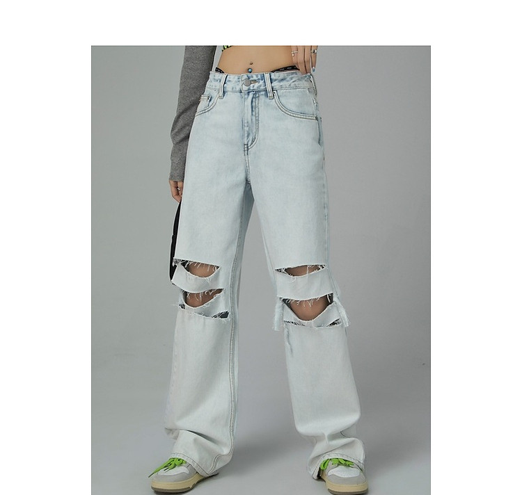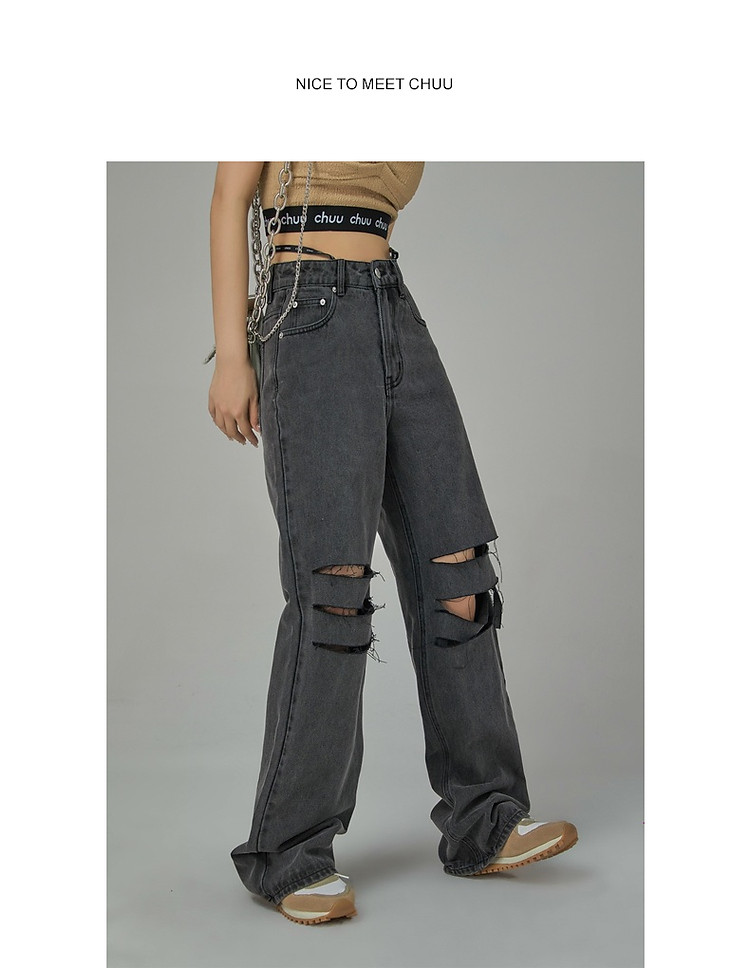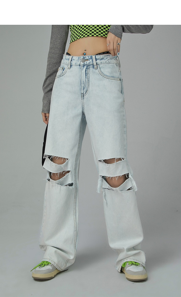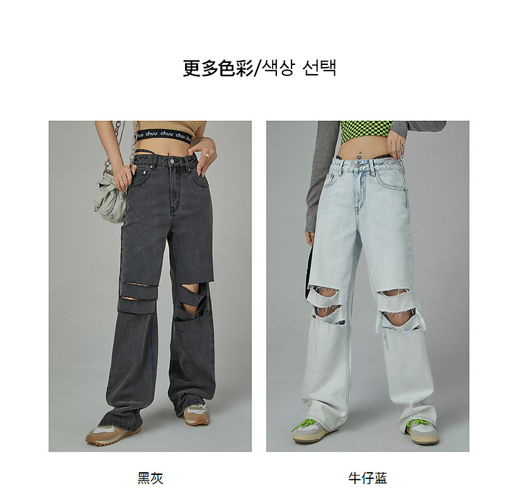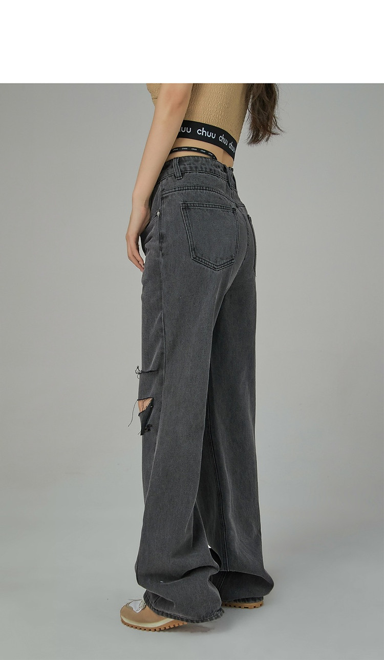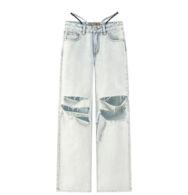 商品名称:破洞牛仔裤女2025夏设计感小众高腰阔腿宽松长裤 733011