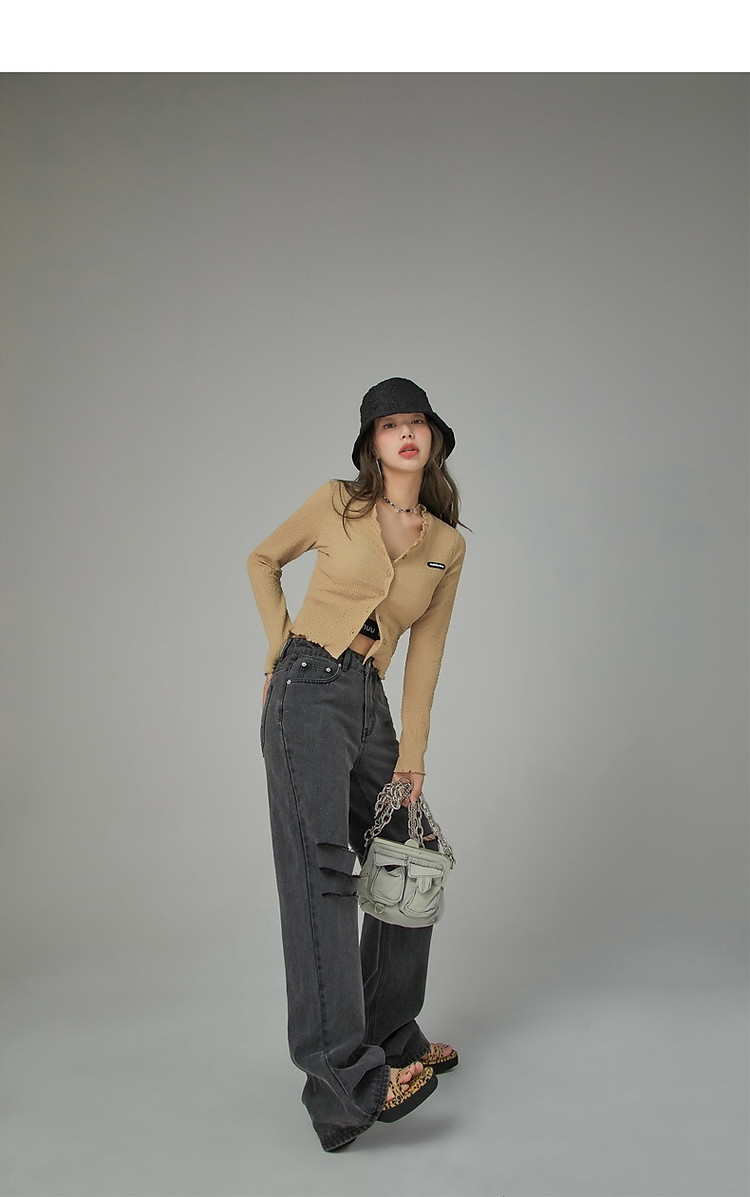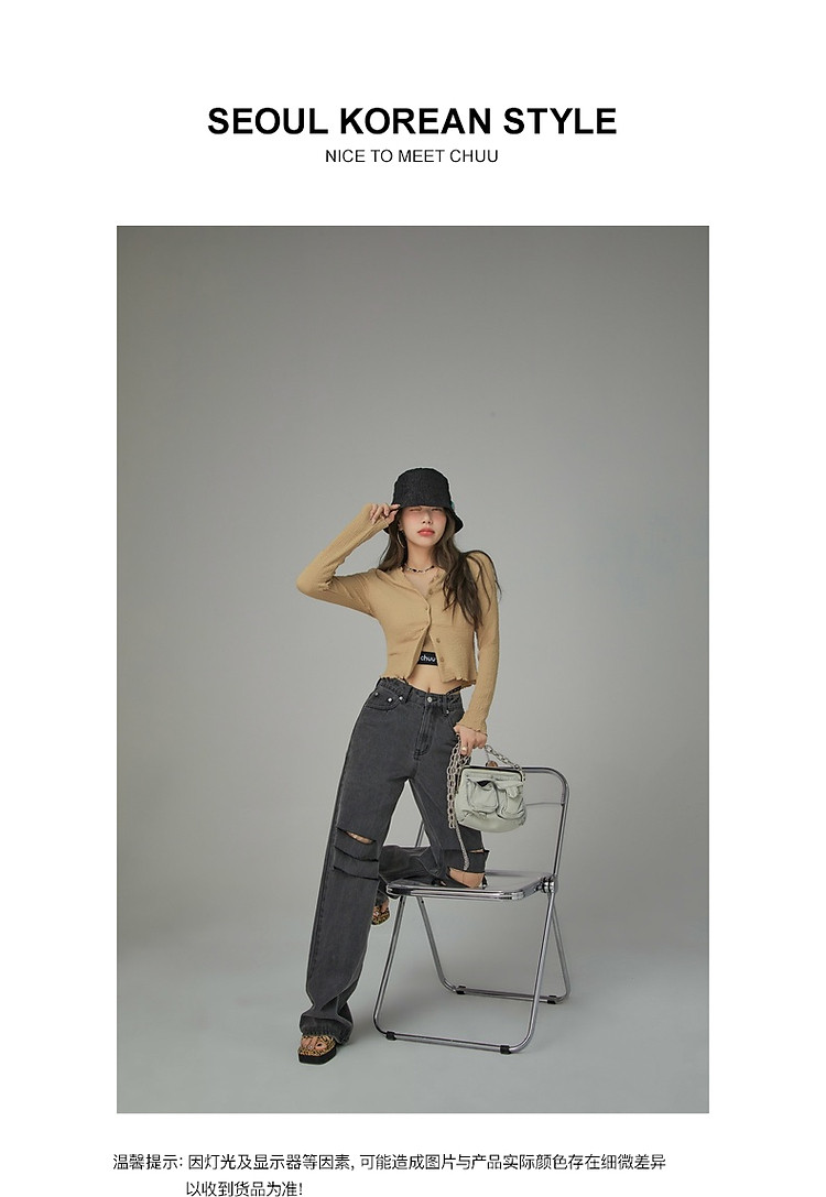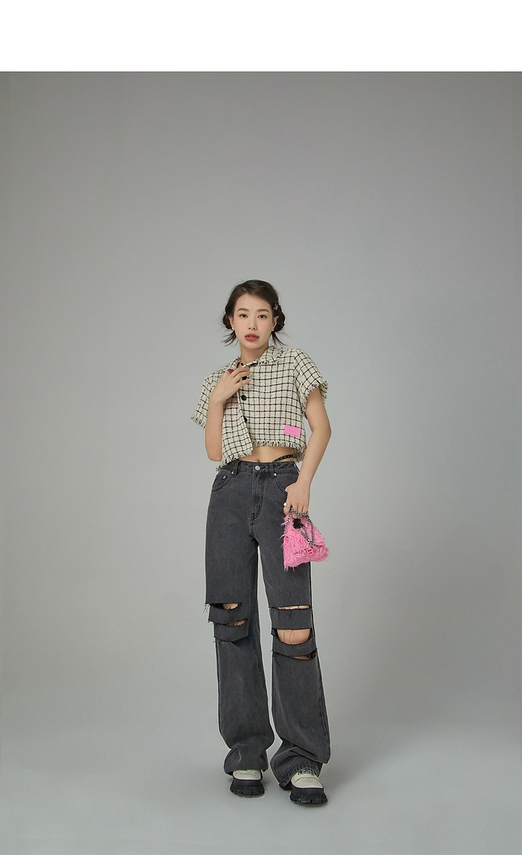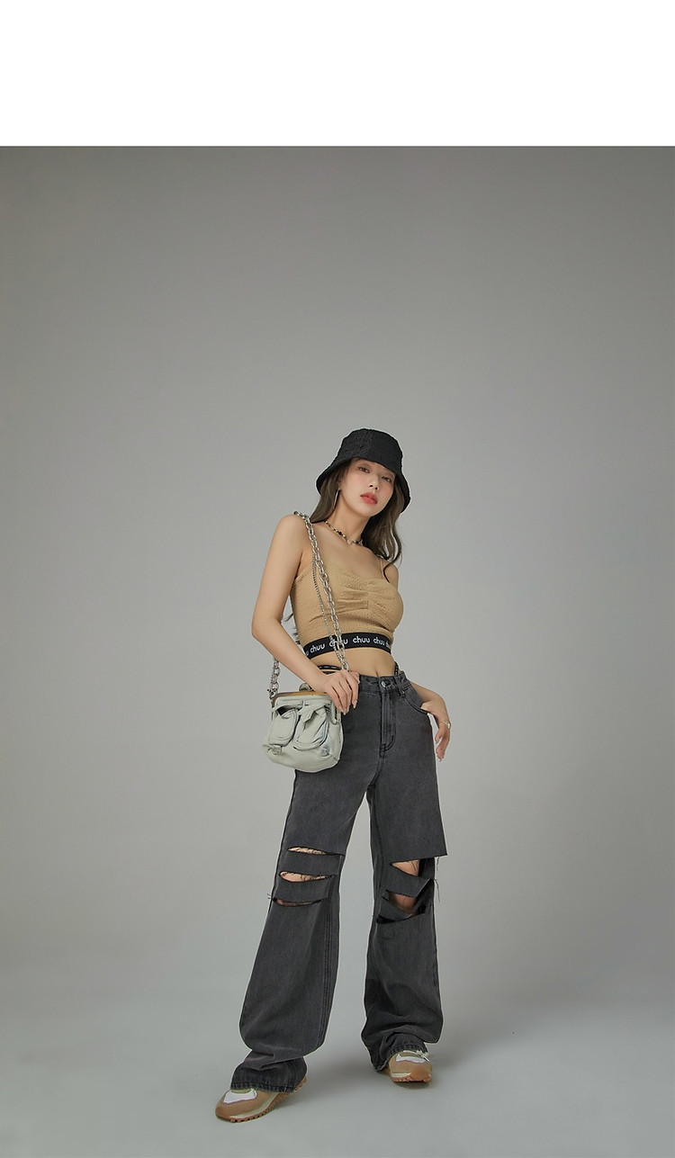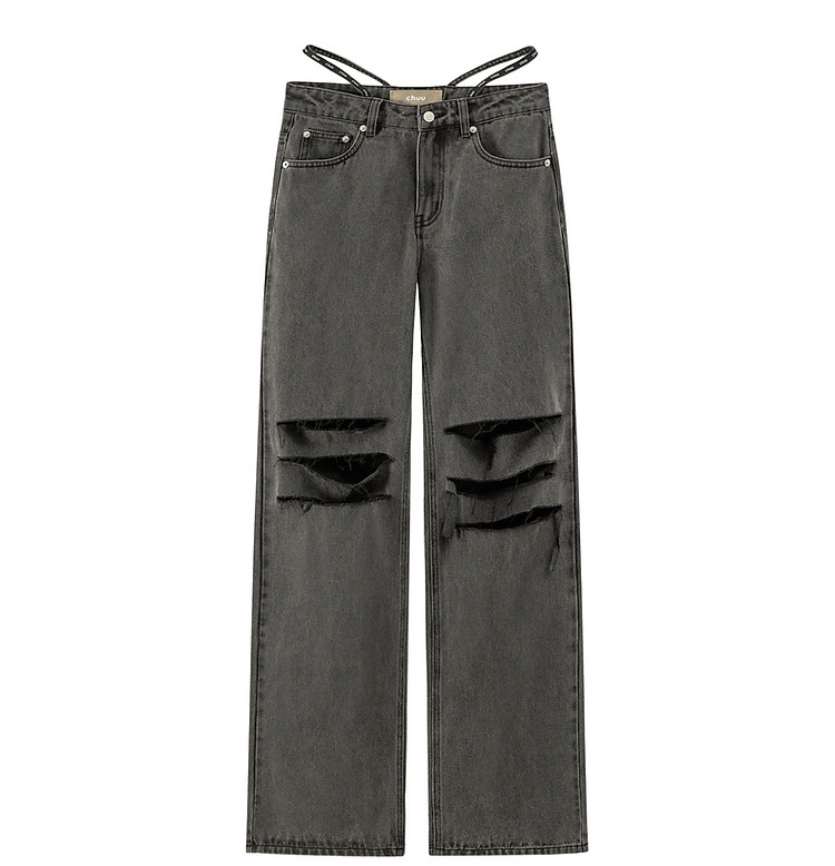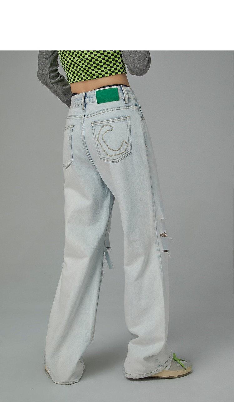 商品名称:破洞牛仔裤女2025夏设计感小众高腰阔腿宽松长裤 733011