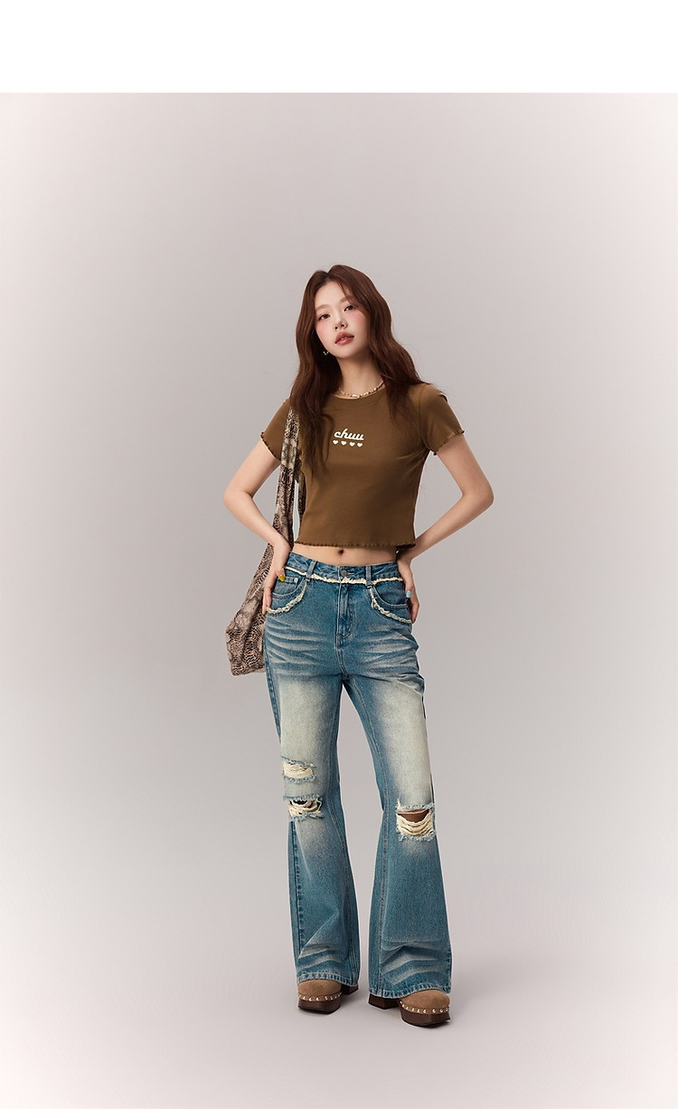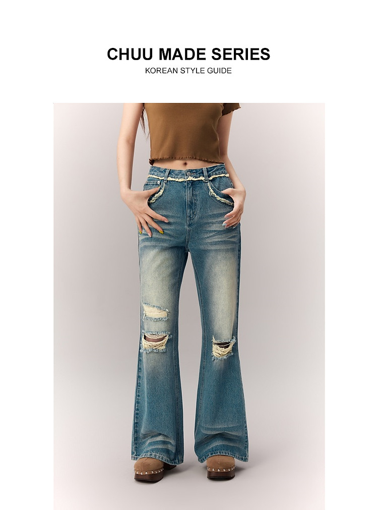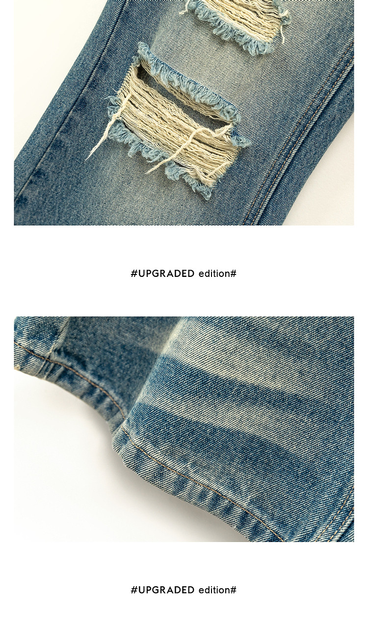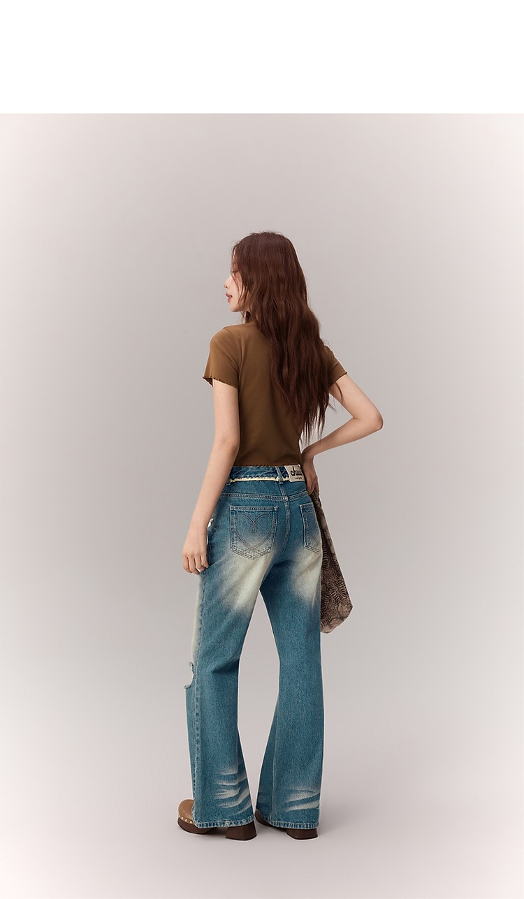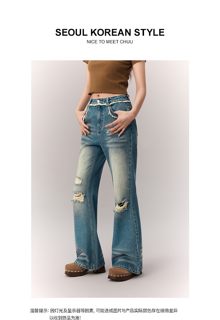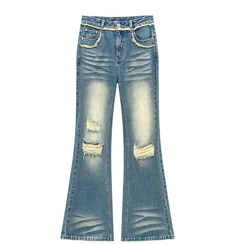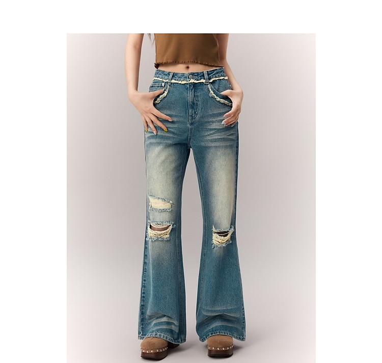 商品名称:破洞微喇牛仔裤女2025夏高腰显瘦百搭设计感个性长裤 189779