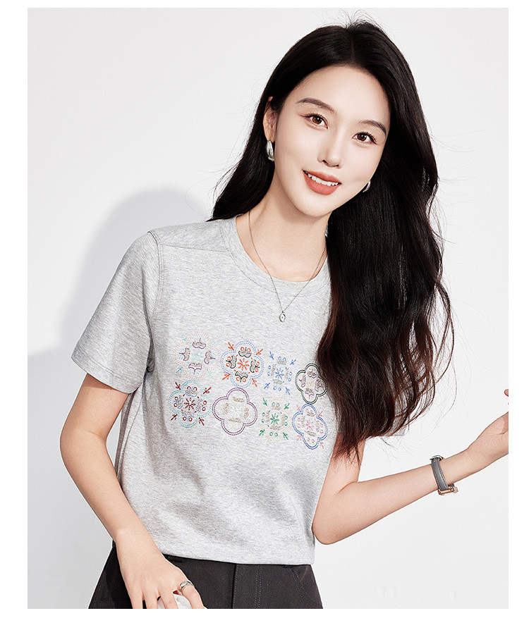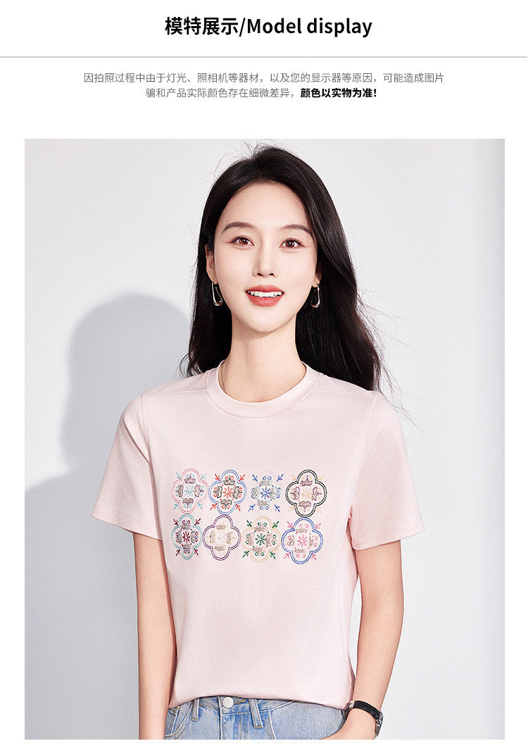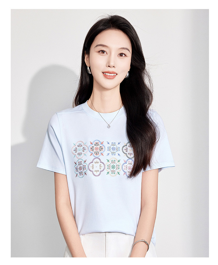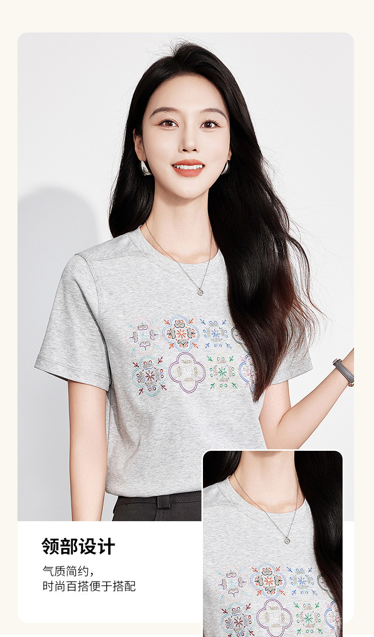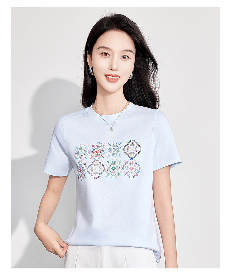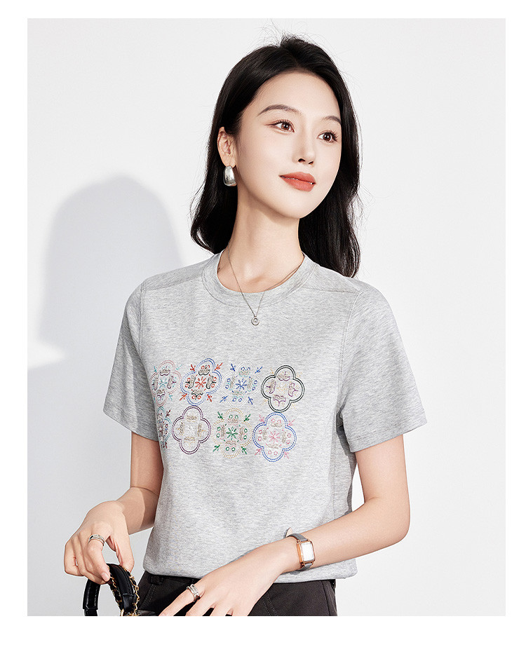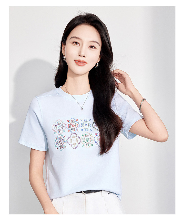 商品名称:25夏季新款时尚温柔刺绣钉珠短袖上衣女式休闲日常通勤微弹T恤 969439