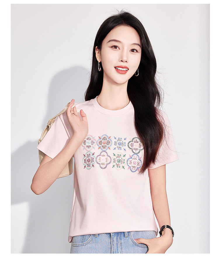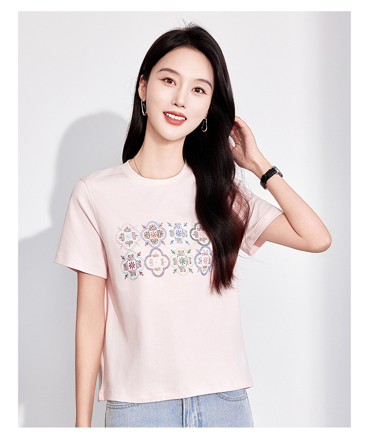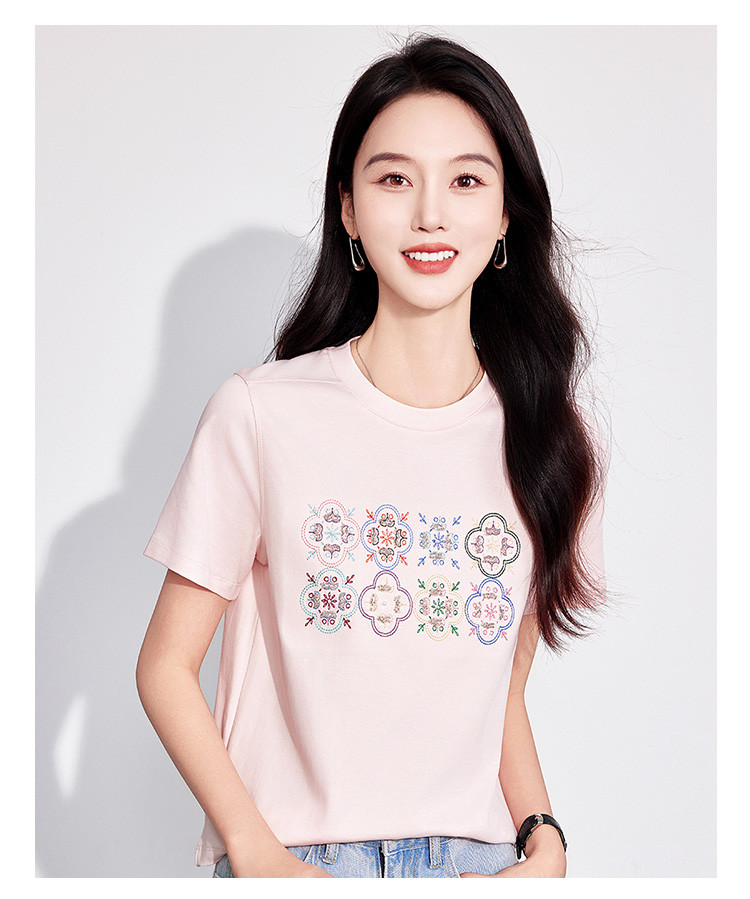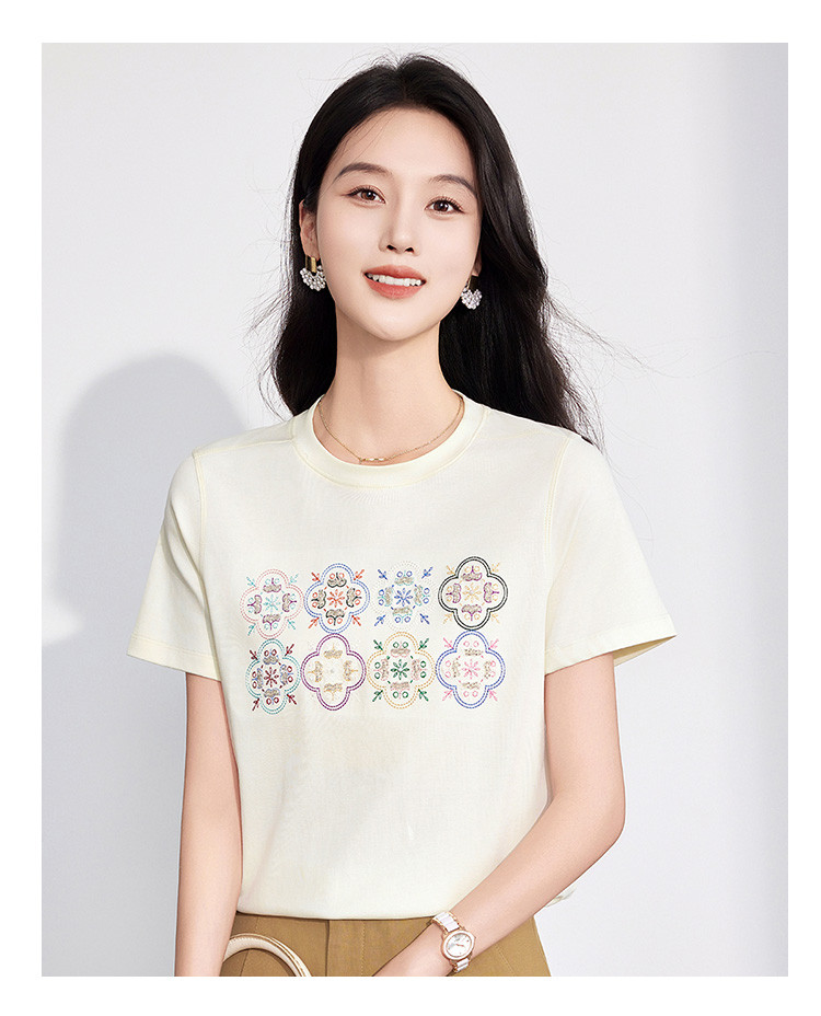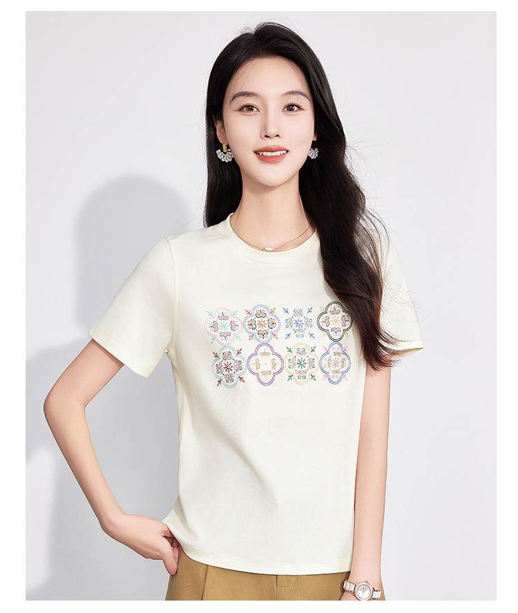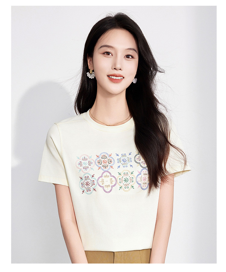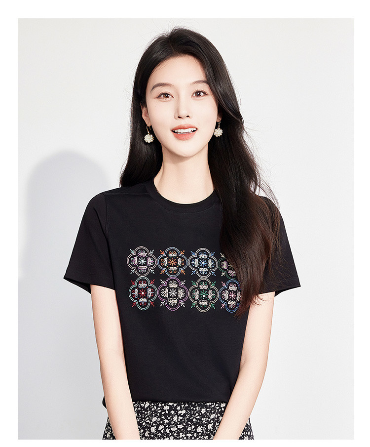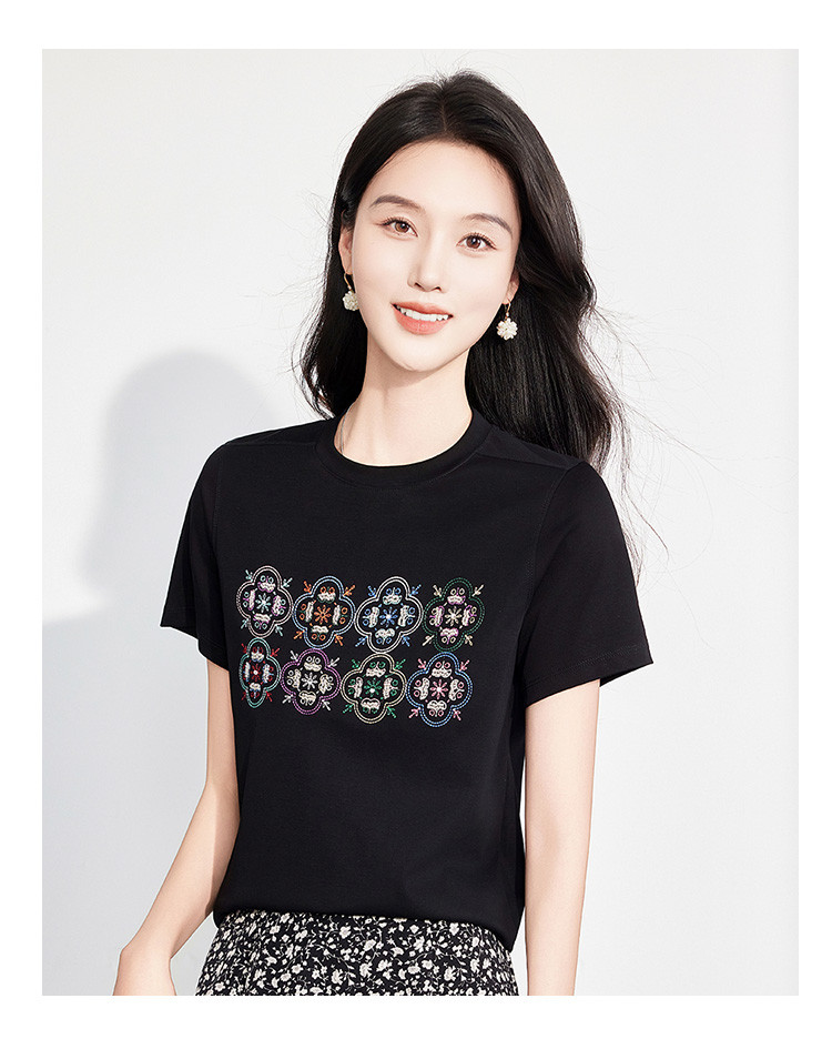 25夏季新款时尚温柔刺绣钉珠短袖上衣女式休闲日常通勤微弹T恤 969439