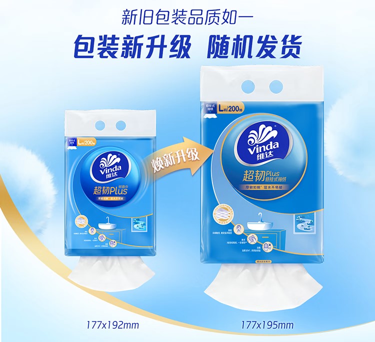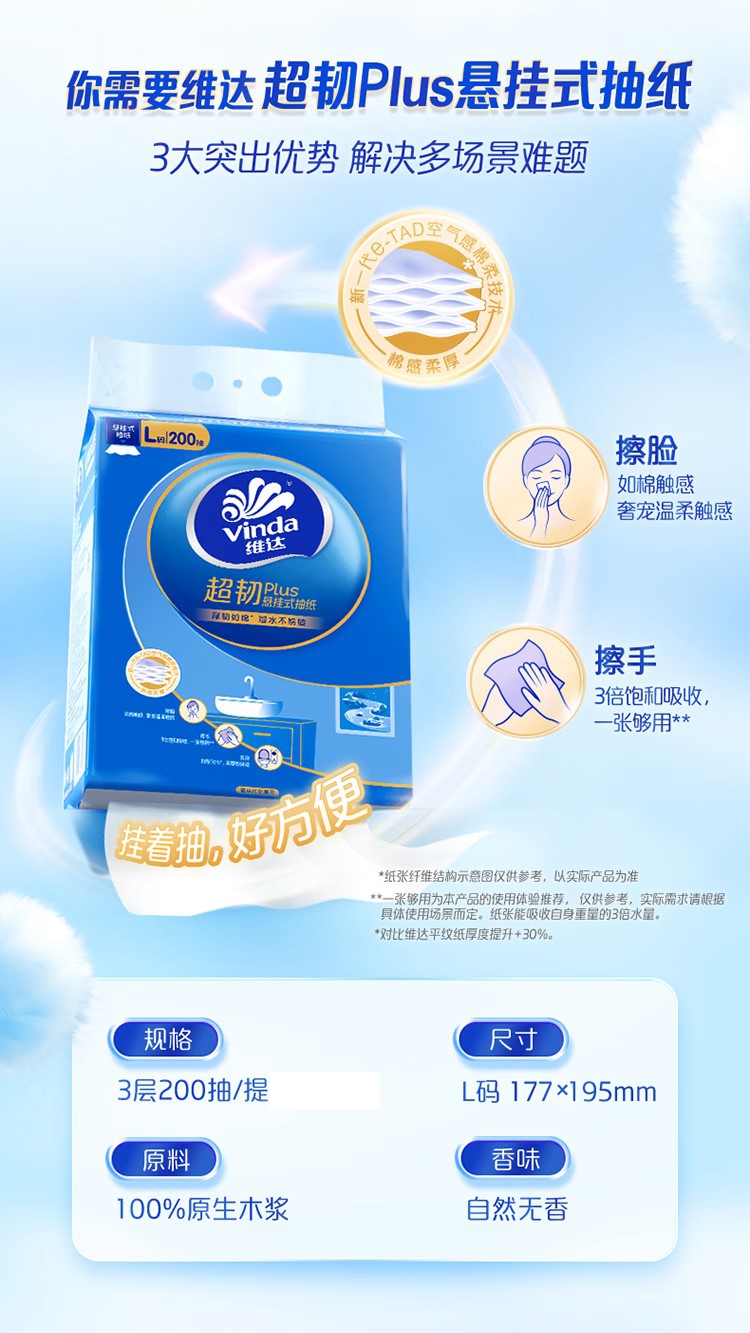 商品名称:Vinda/维达超韧Plus悬挂式纸巾L码3层200抽/提V2588-A