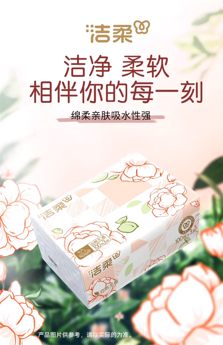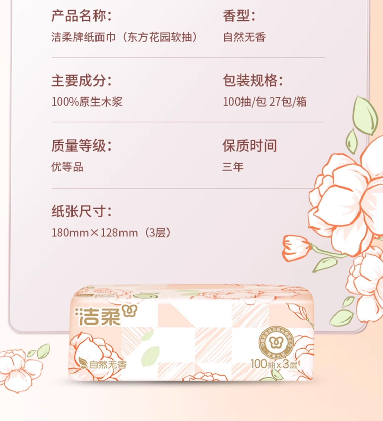 商品名称:C&S/洁柔东方花园软抽纸巾3层100抽*27包整箱装TR406-27E