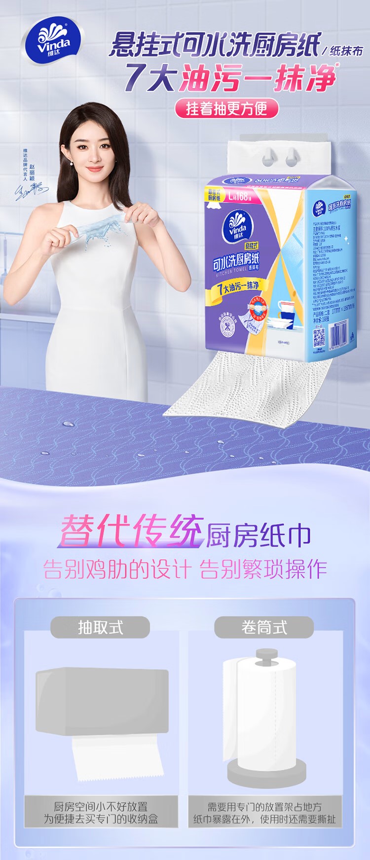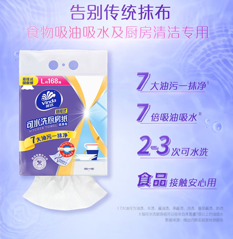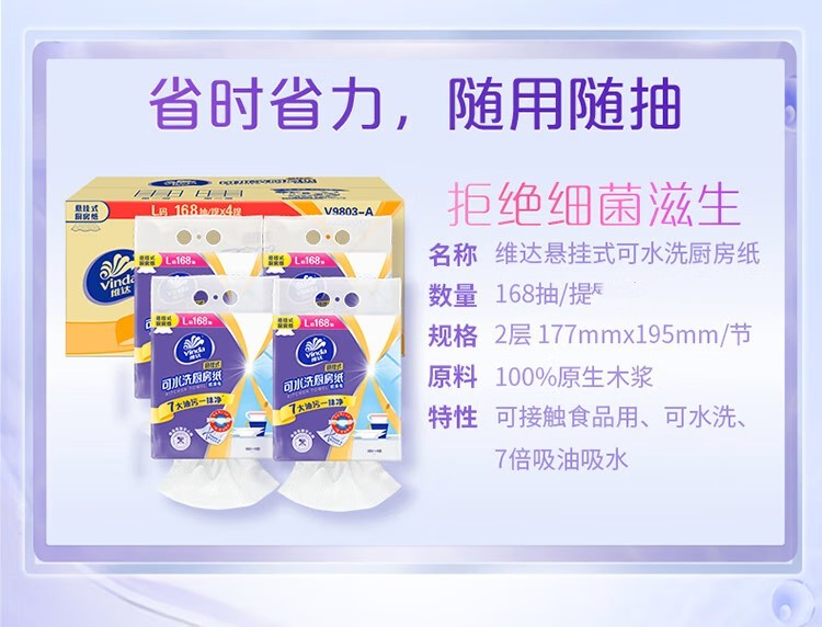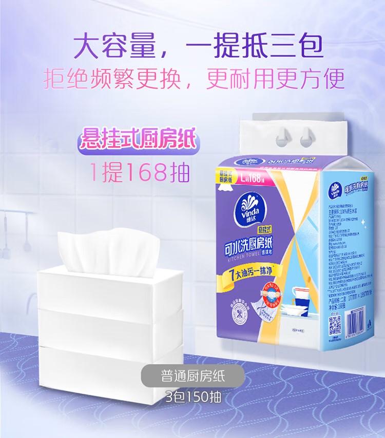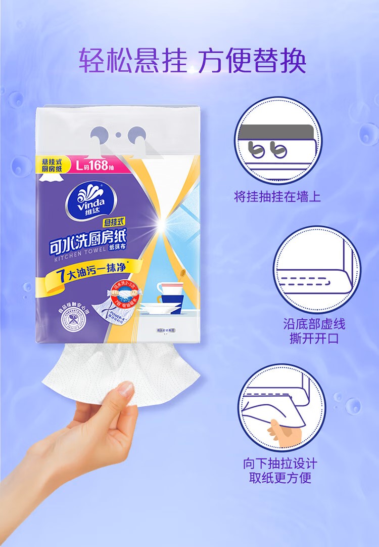 Vinda/维达可水洗悬挂式厨房抽纸2层L码168抽/提V9803-A