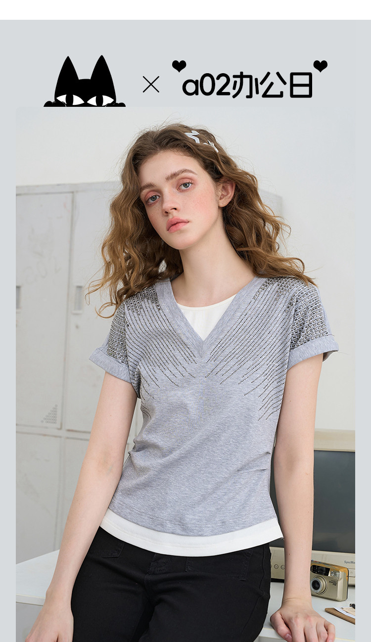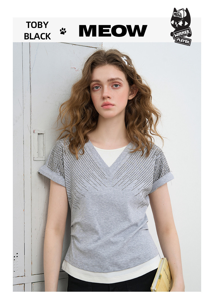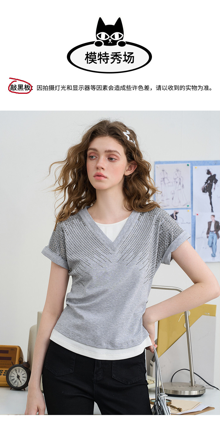 收腰遮肚假两件V领短款上衣2025夏季时尚百搭女式T恤 467805