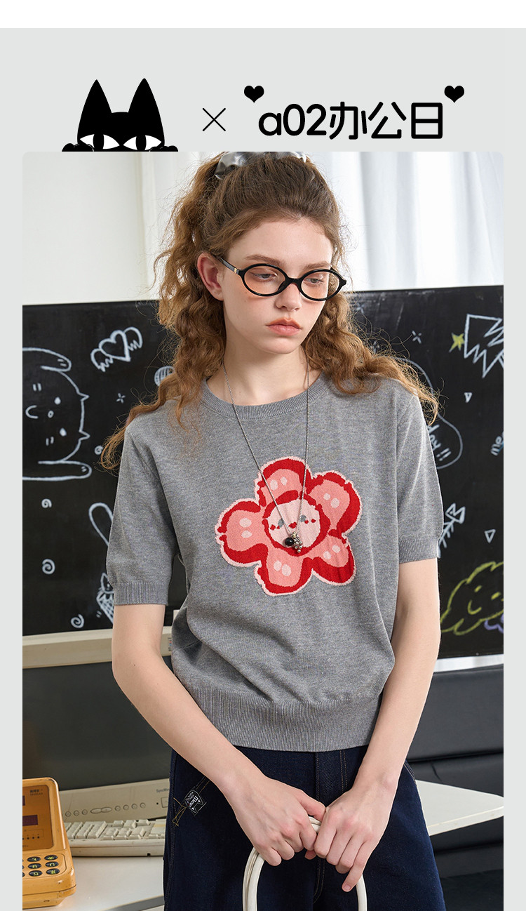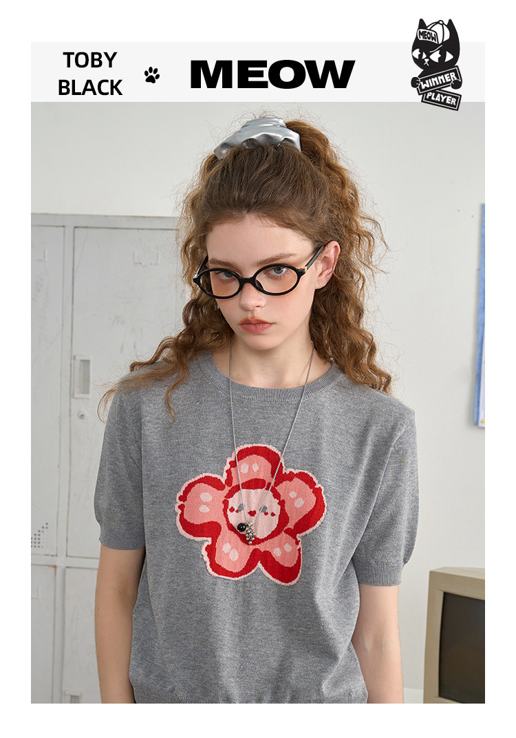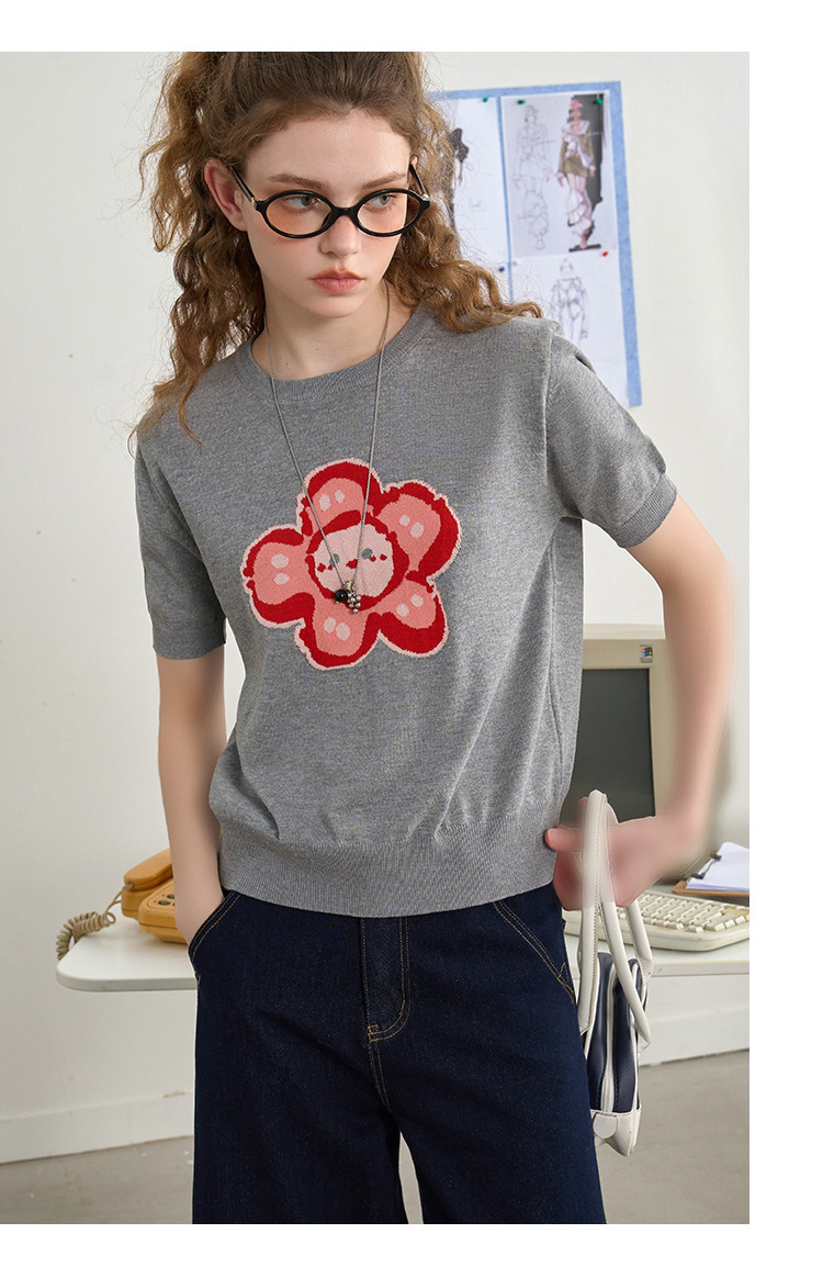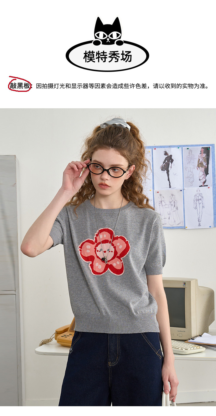 复古圆领童趣提花针织短袖上衣2025夏季休闲百搭女式针织衫 323549