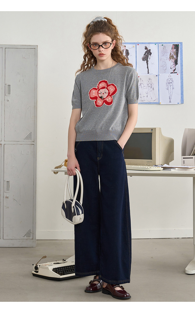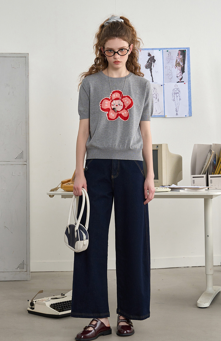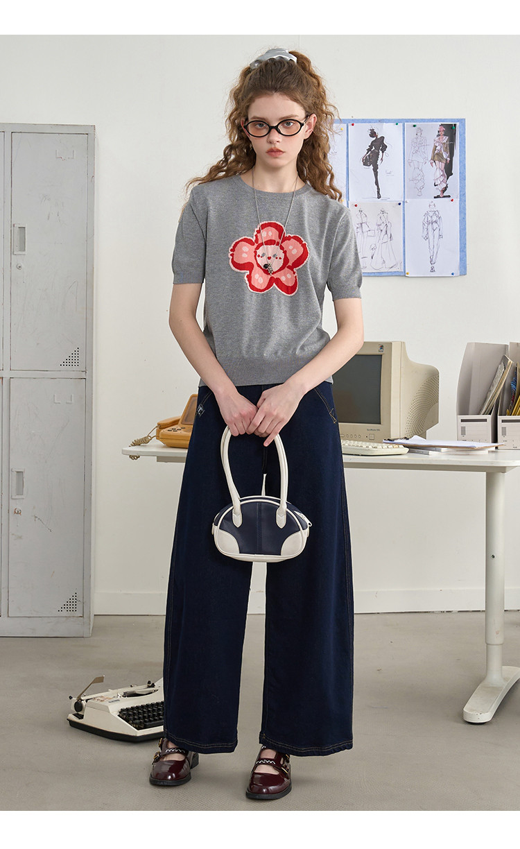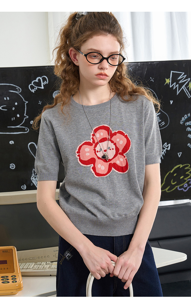 复古圆领童趣提花针织短袖上衣2025夏季休闲百搭女式针织衫 323549