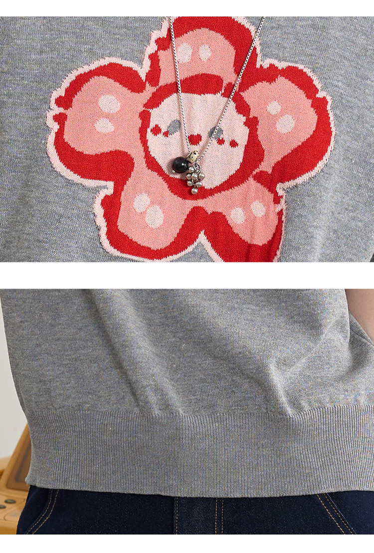 商品名称:复古圆领童趣提花针织短袖上衣2025夏季休闲百搭女式针织衫 323549