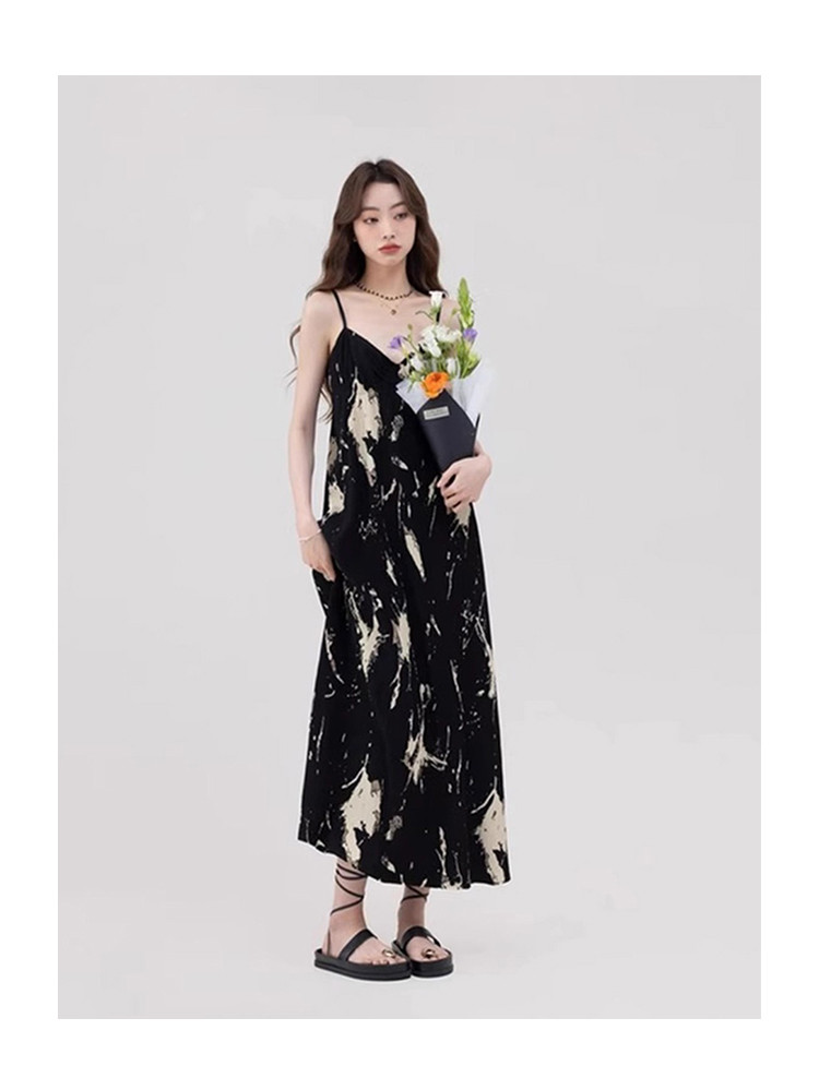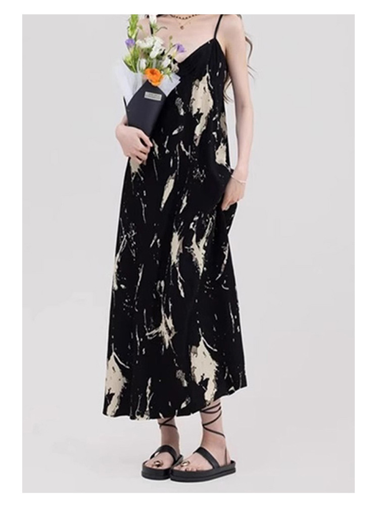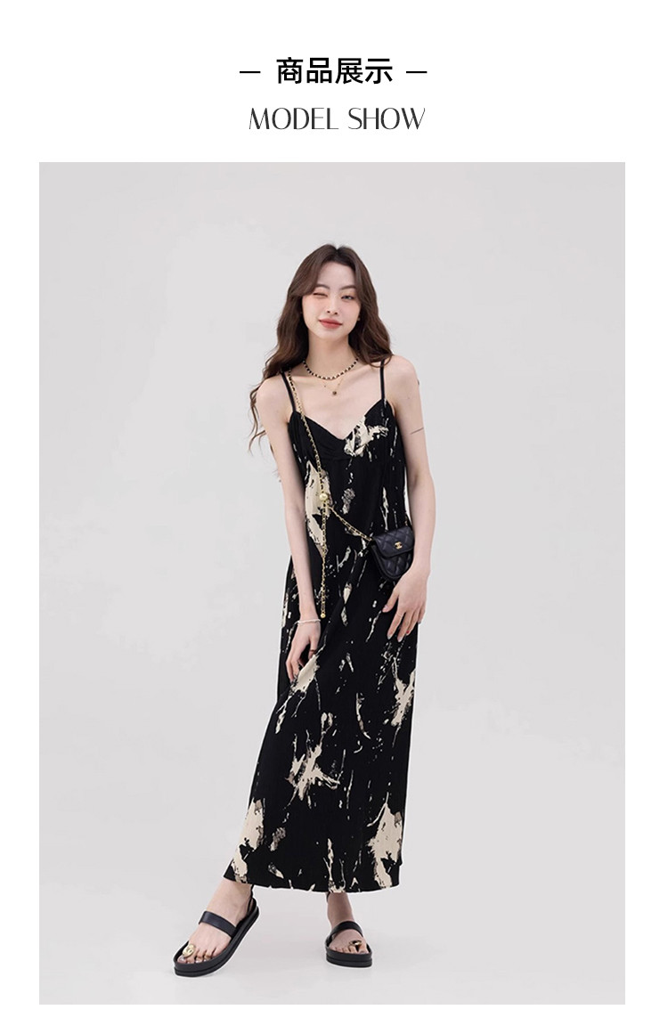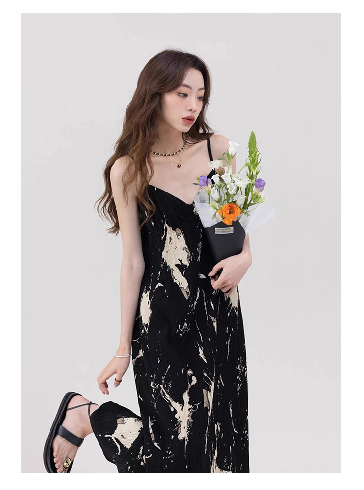 商品名称:法式温柔吊带裙女泼墨艺术感褶皱肌理印花a字长裙女 553923