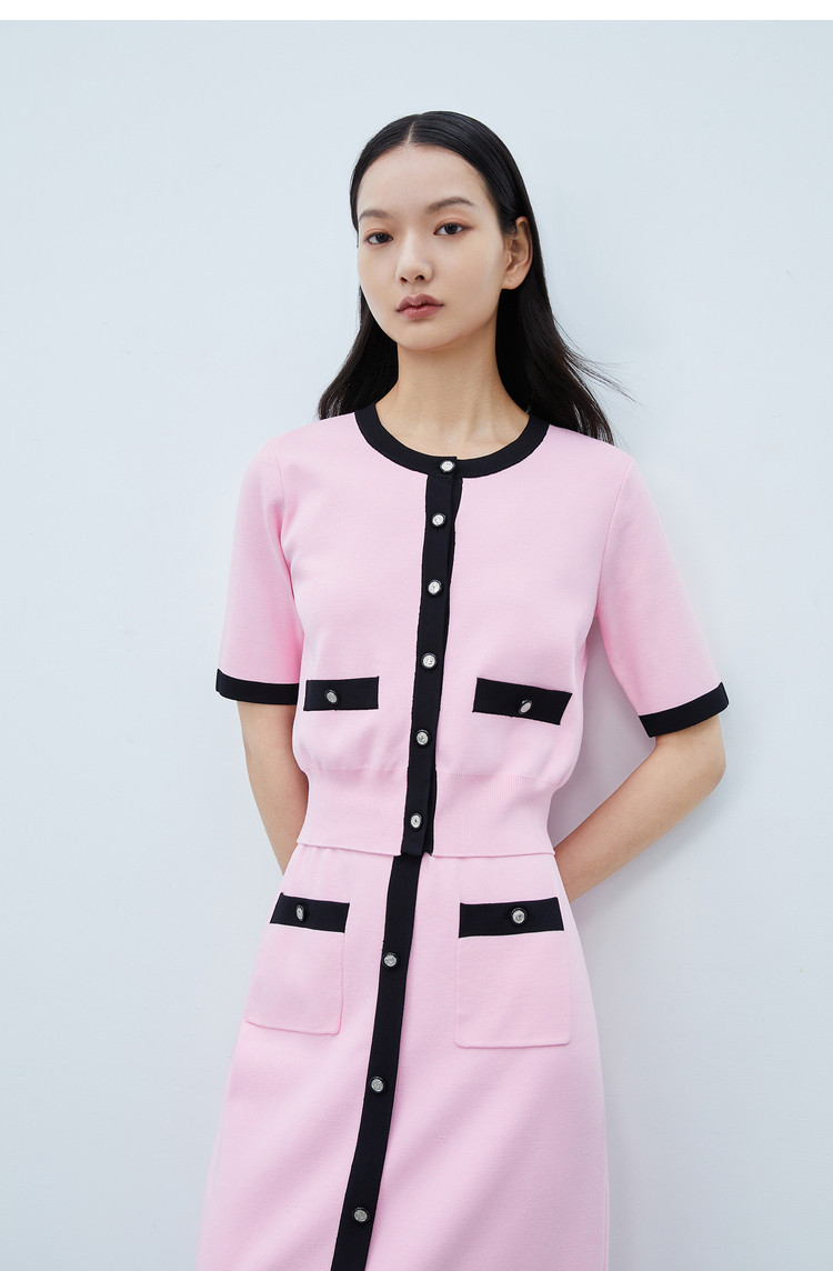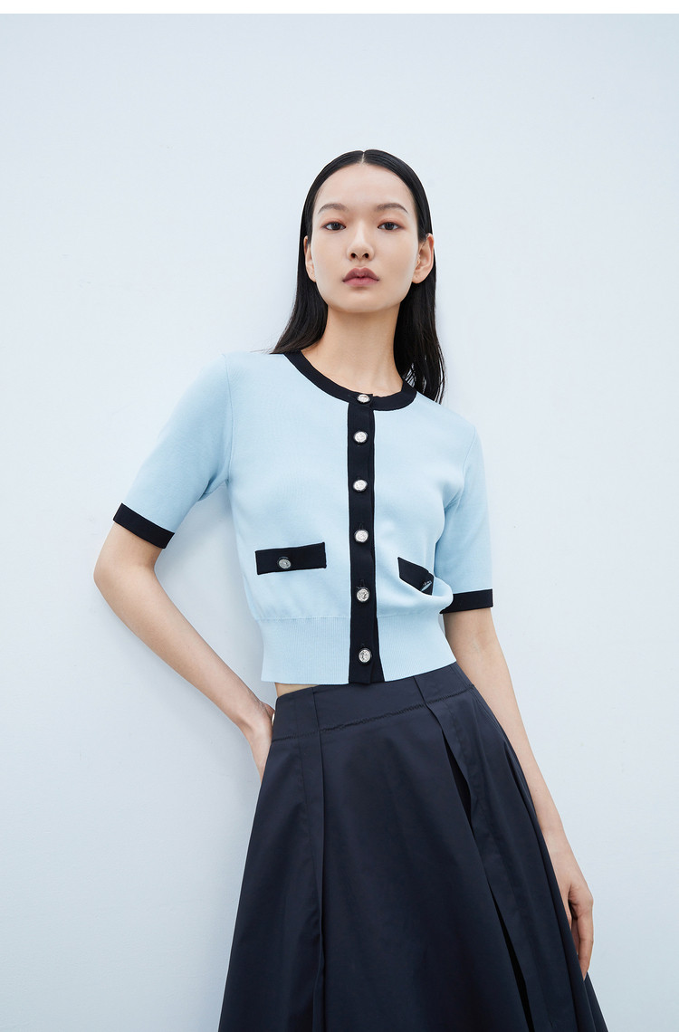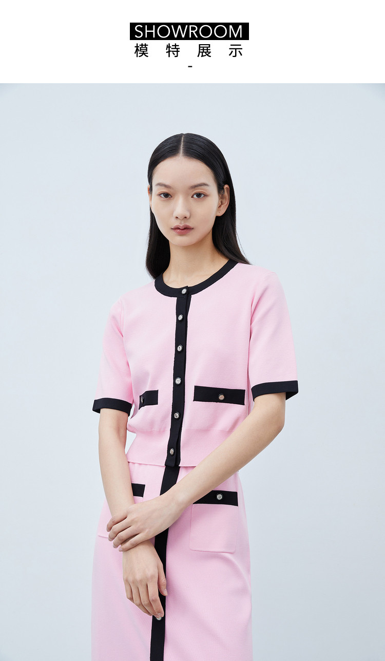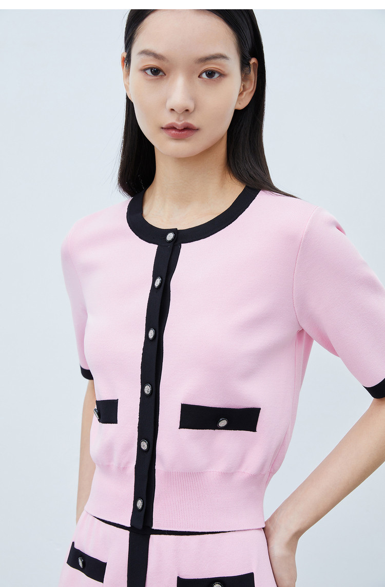 春季短袖上衣女法式小香风圆领薄款气质短袖针织开衫女 876827