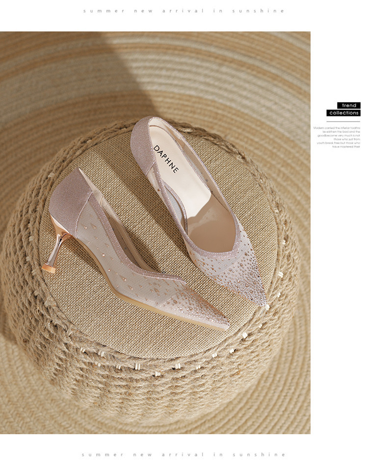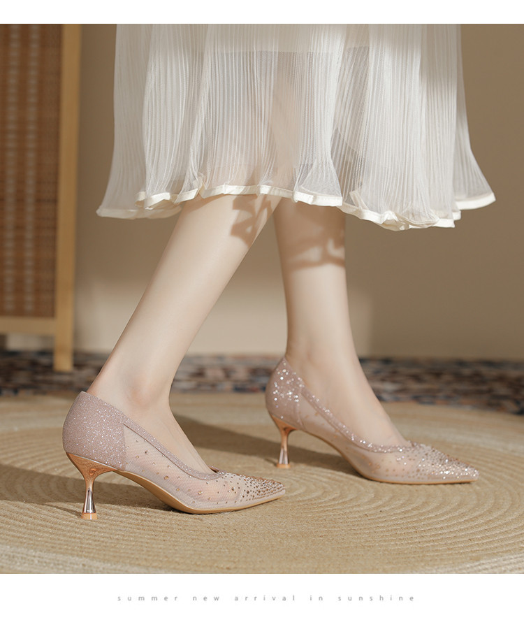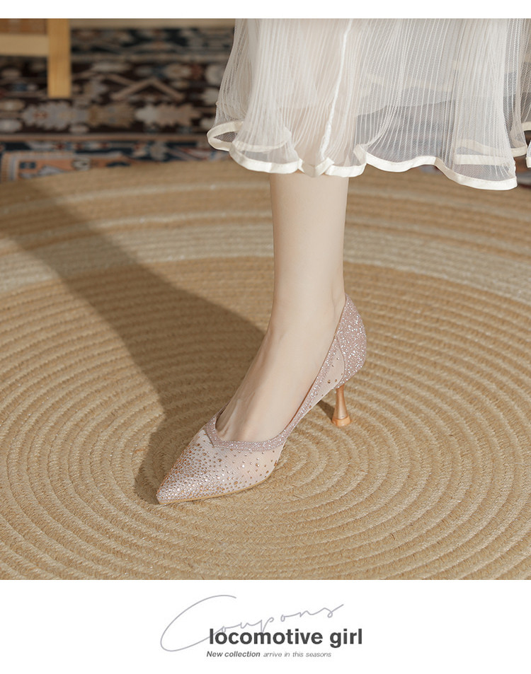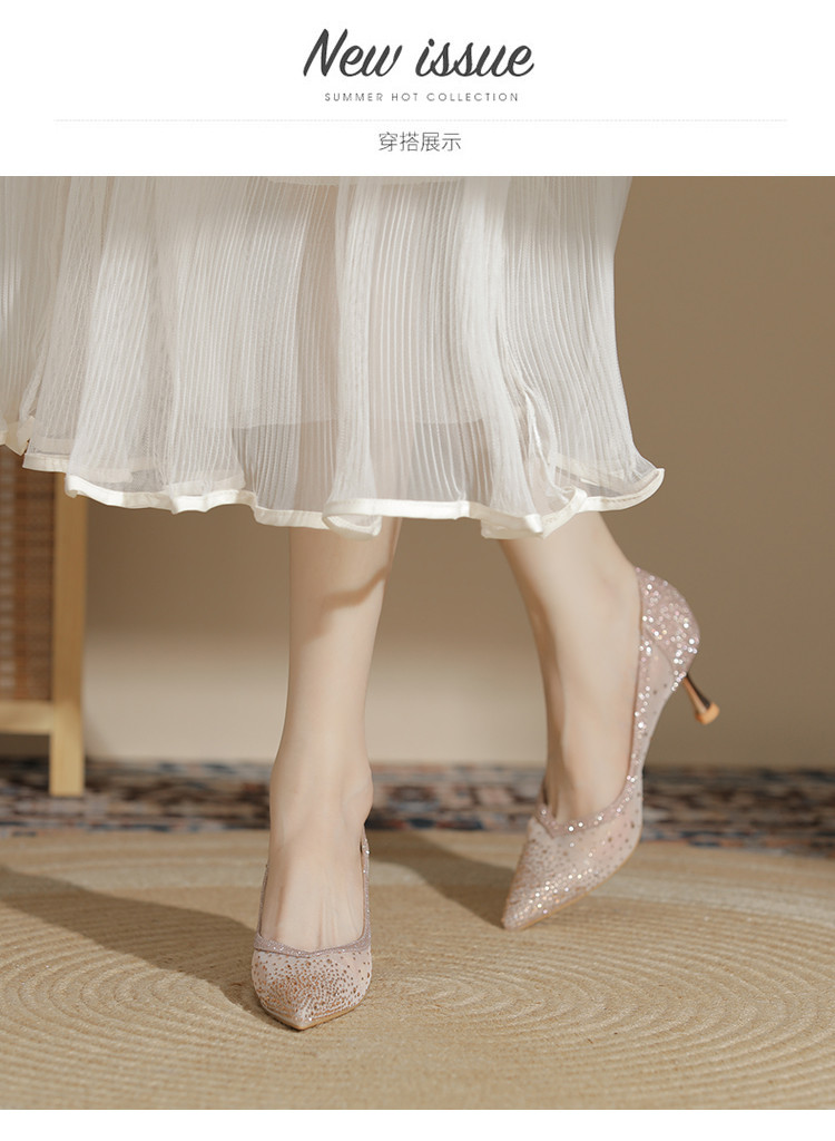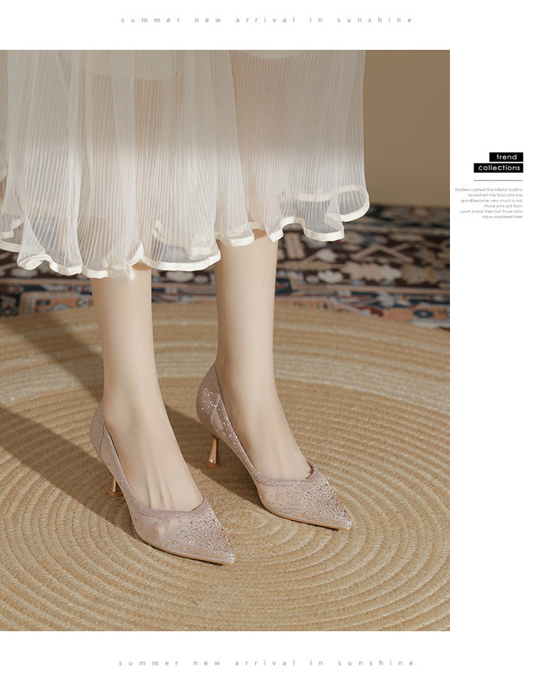 细跟高跟鞋女2025新款春夏网纱透气仙女风配裙水钻尖头单鞋女 498711