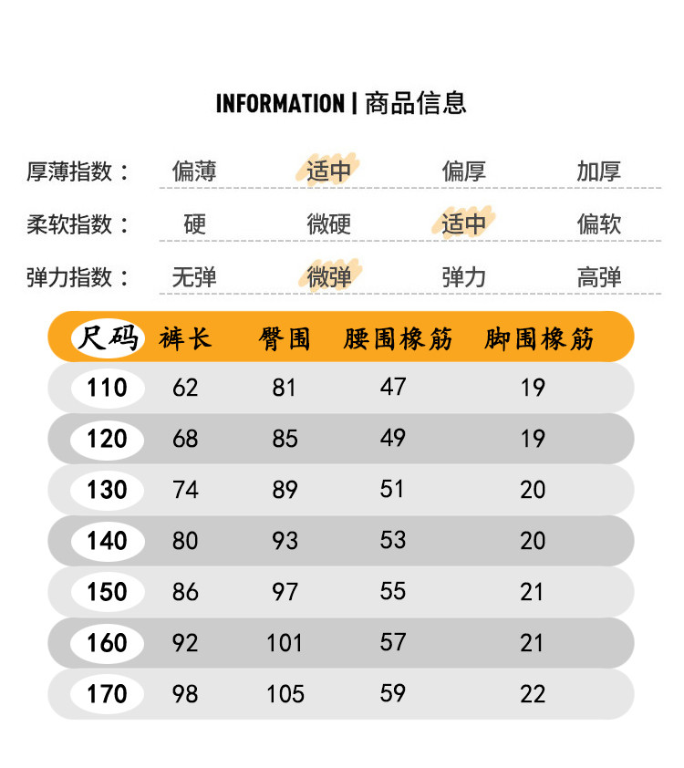 | 尺码 | 身高(cm) | 腰围(cm) | 裤长(cm) | 臀围(cm) | 适合年龄 | 号型 |
