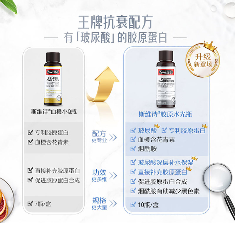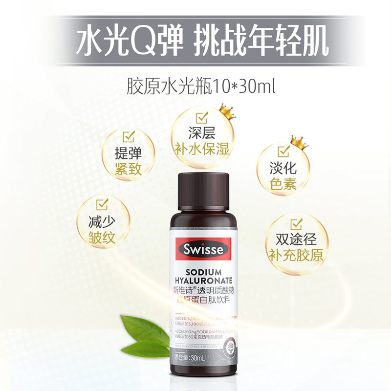 商品名称:【国内发货】Swisse/斯维诗 透明质酸钠胶原蛋白肽饮料【水光瓶】(30ml*10瓶/盒)