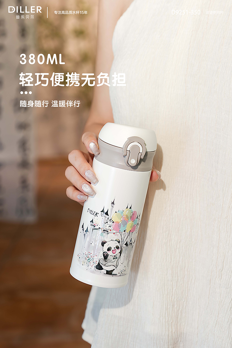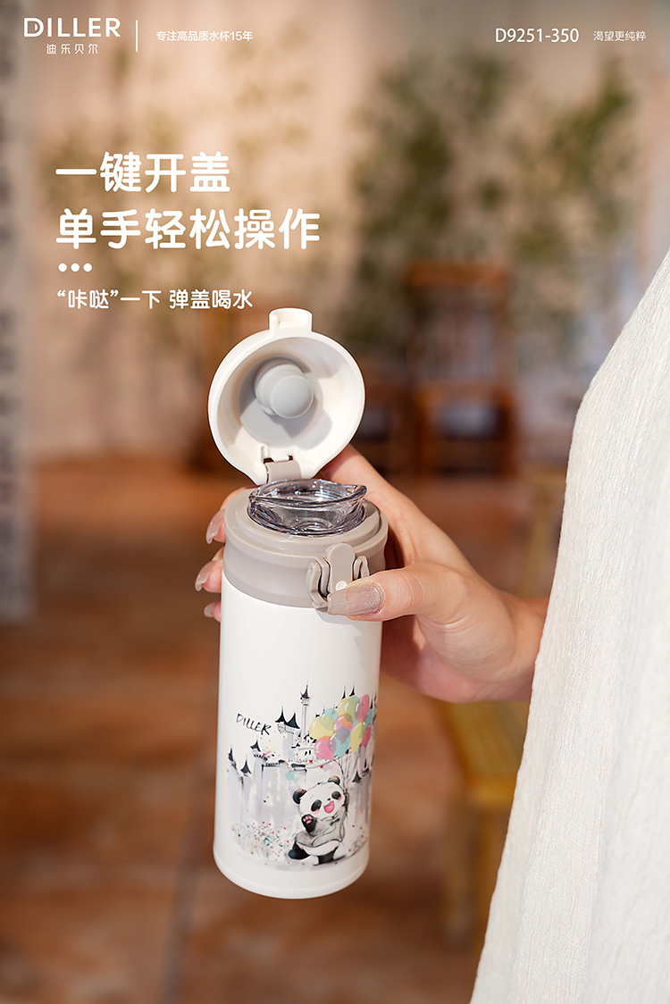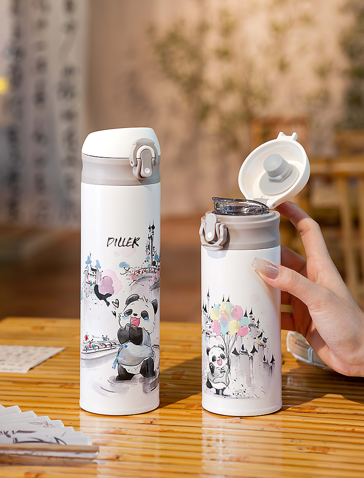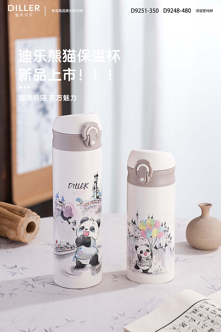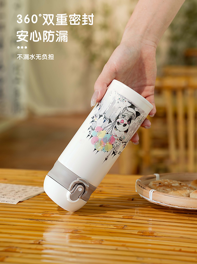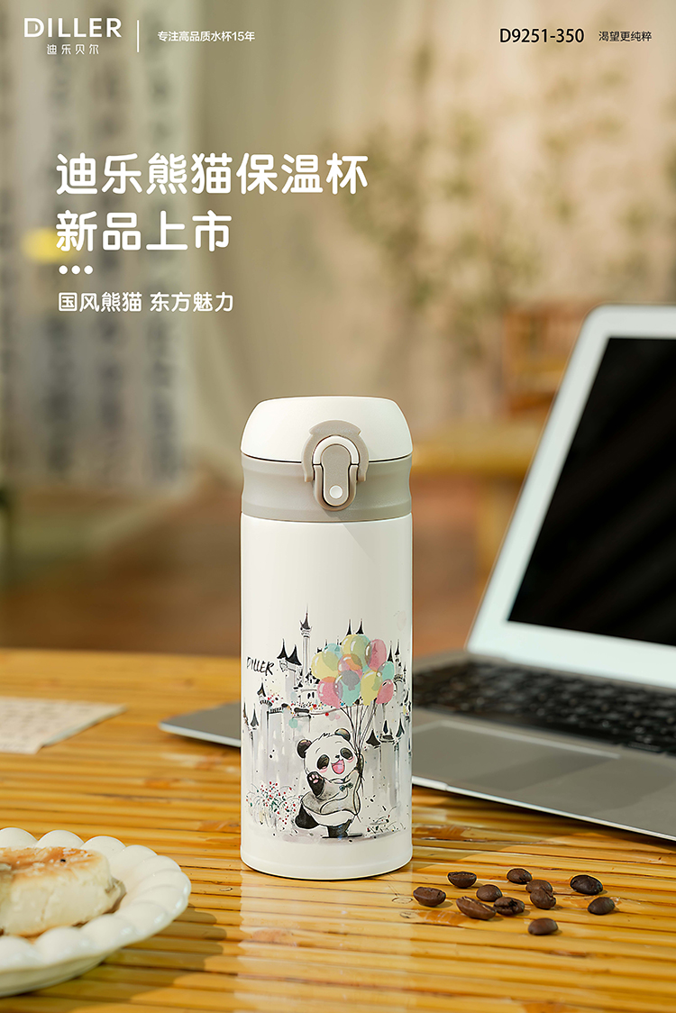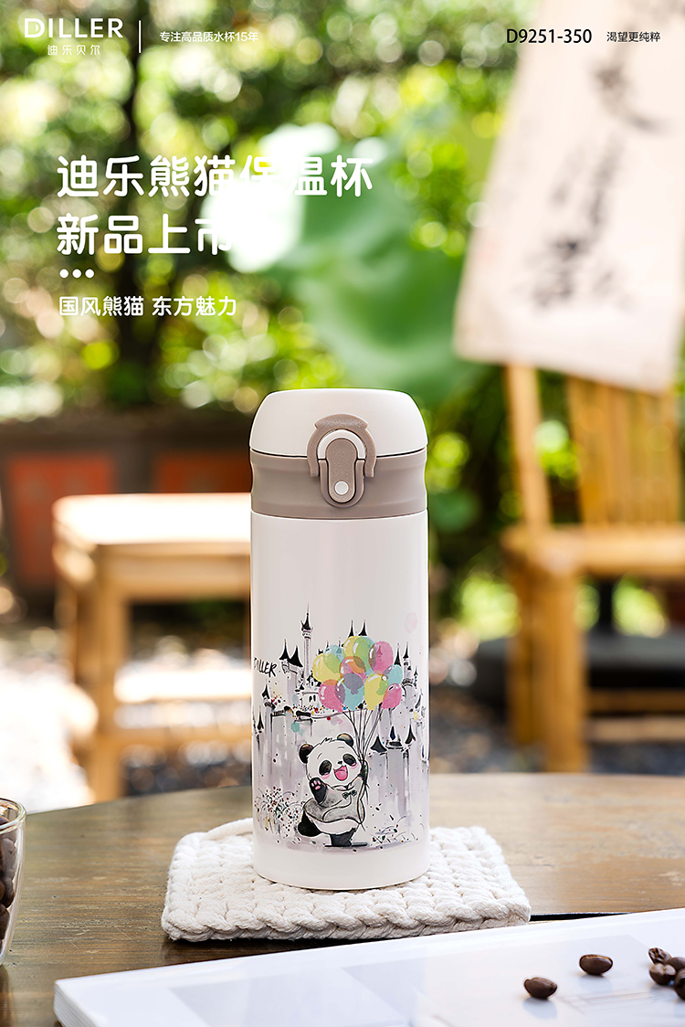 迪乐贝尔新品国风熊猫系列保温杯316不锈钢一键开盖带锁扣儿童上学喝水杯学生杯350ML