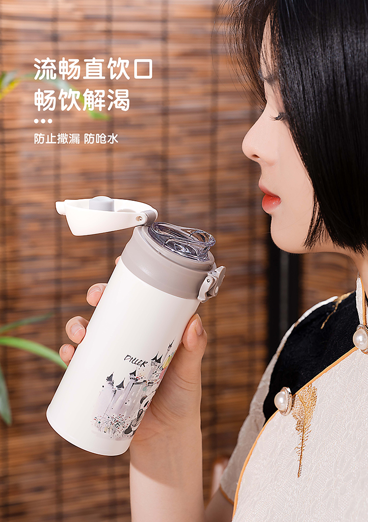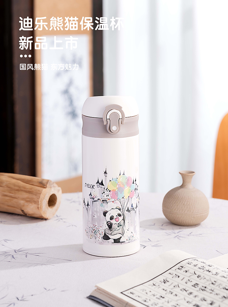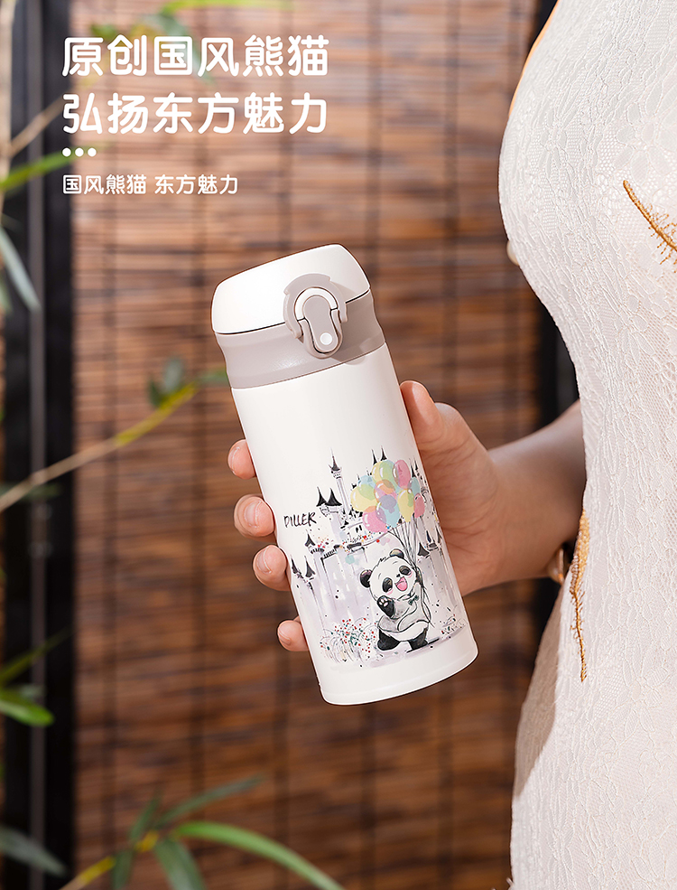 商品名称:迪乐贝尔新品国风熊猫系列保温杯316不锈钢一键开盖带锁扣儿童上学喝水杯学生杯350ML