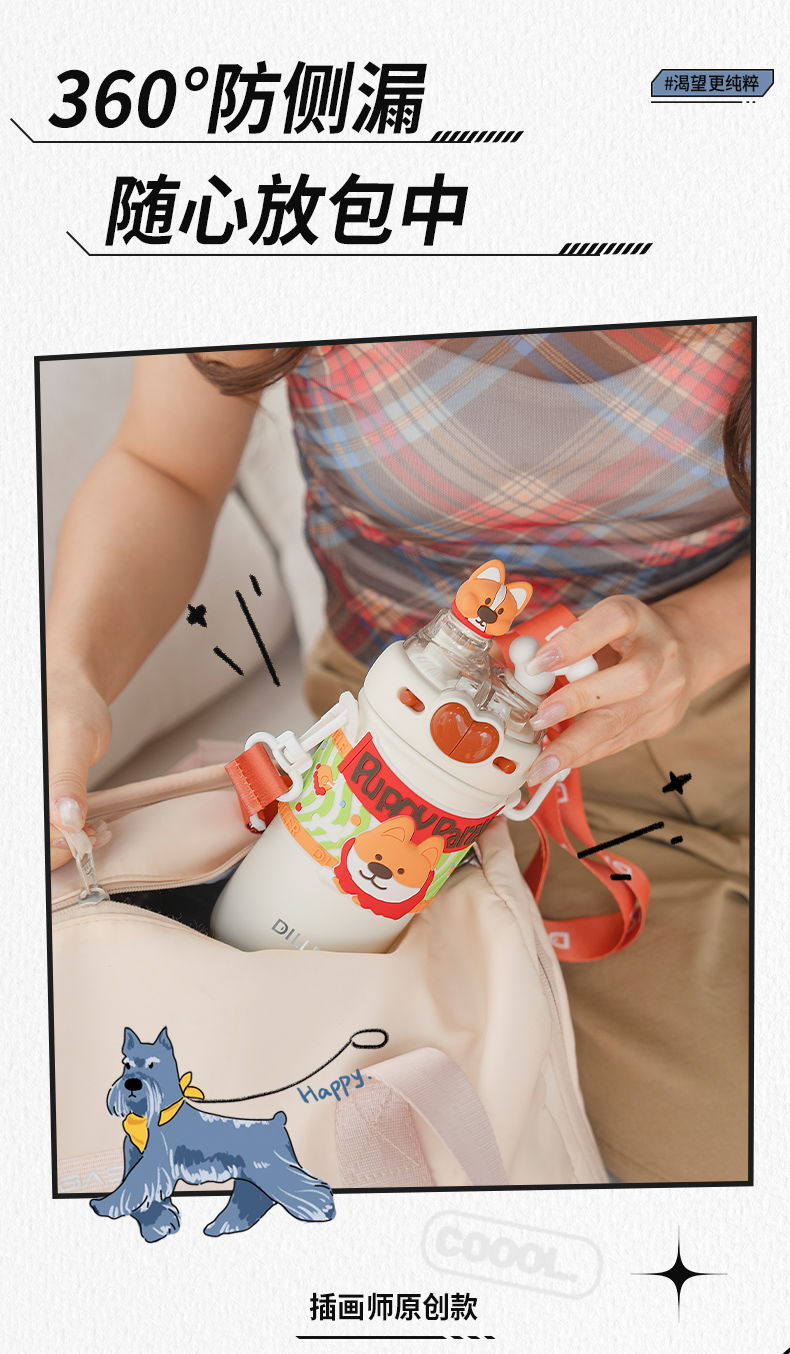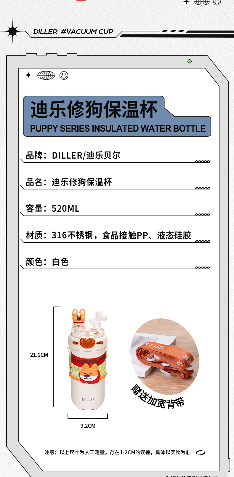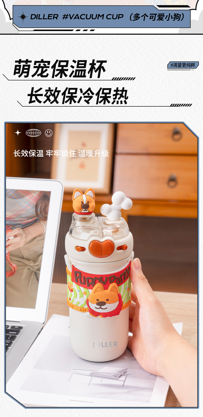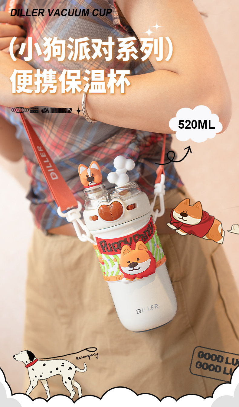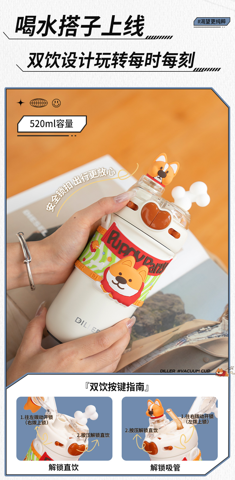 商品名称:迪乐贝尔新品修狗系列女士保温杯儿童便携提绳弹跳杯316不锈钢学生双饮可爱水杯520ML