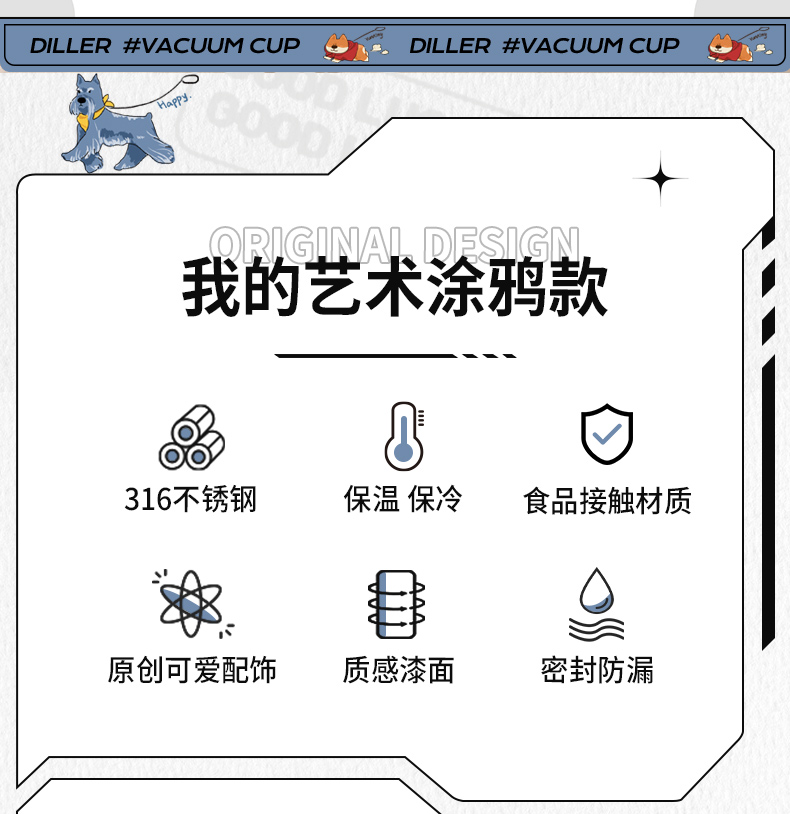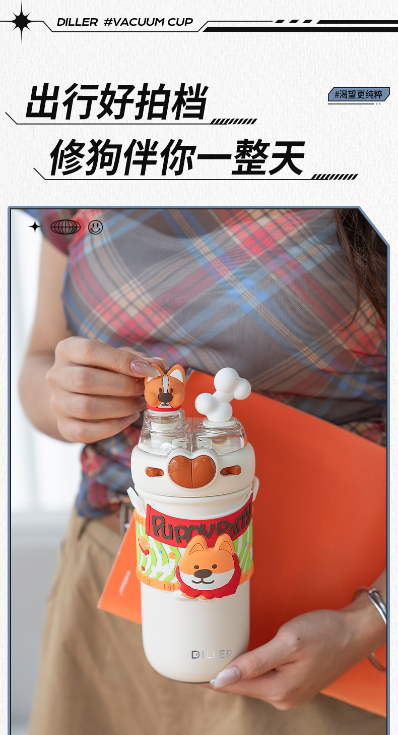 迪乐贝尔新品修狗系列女士保温杯儿童便携提绳弹跳杯316不锈钢学生双饮可爱水杯520ML