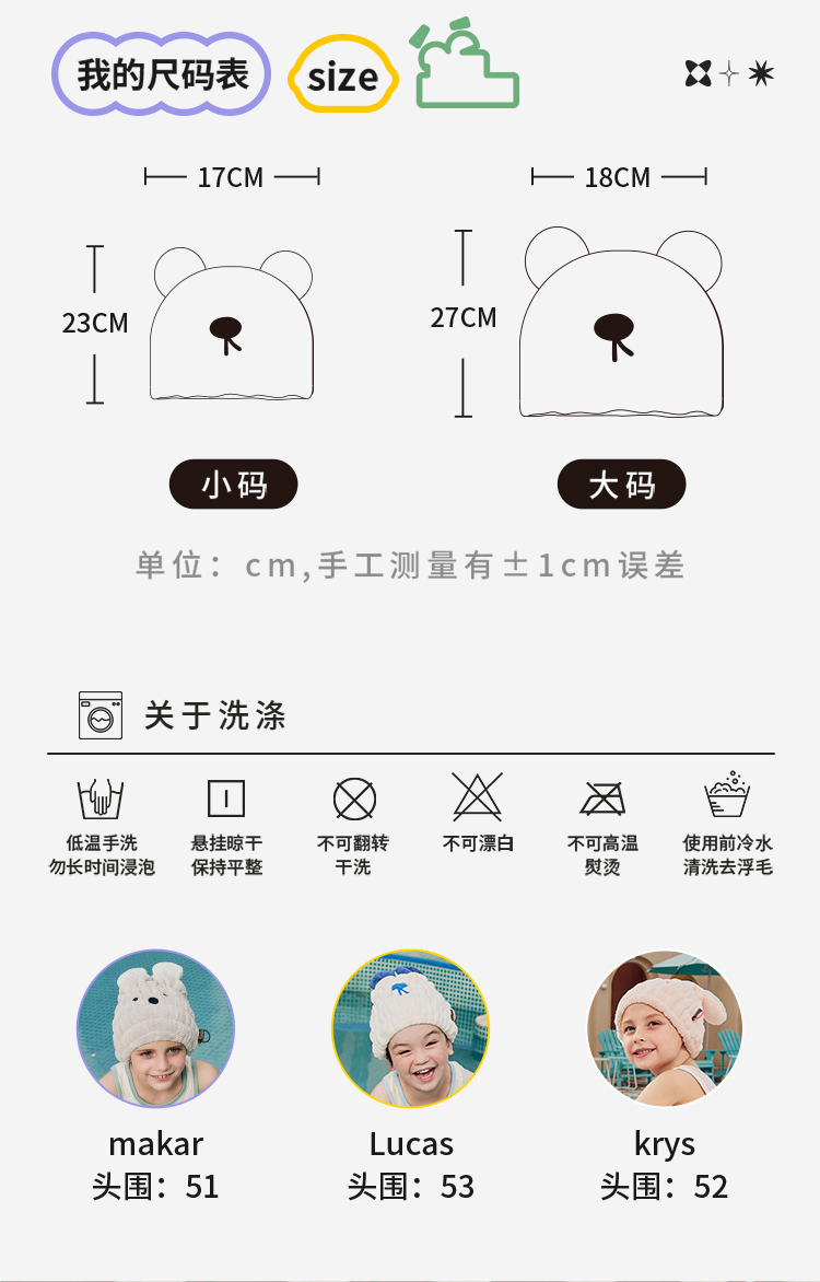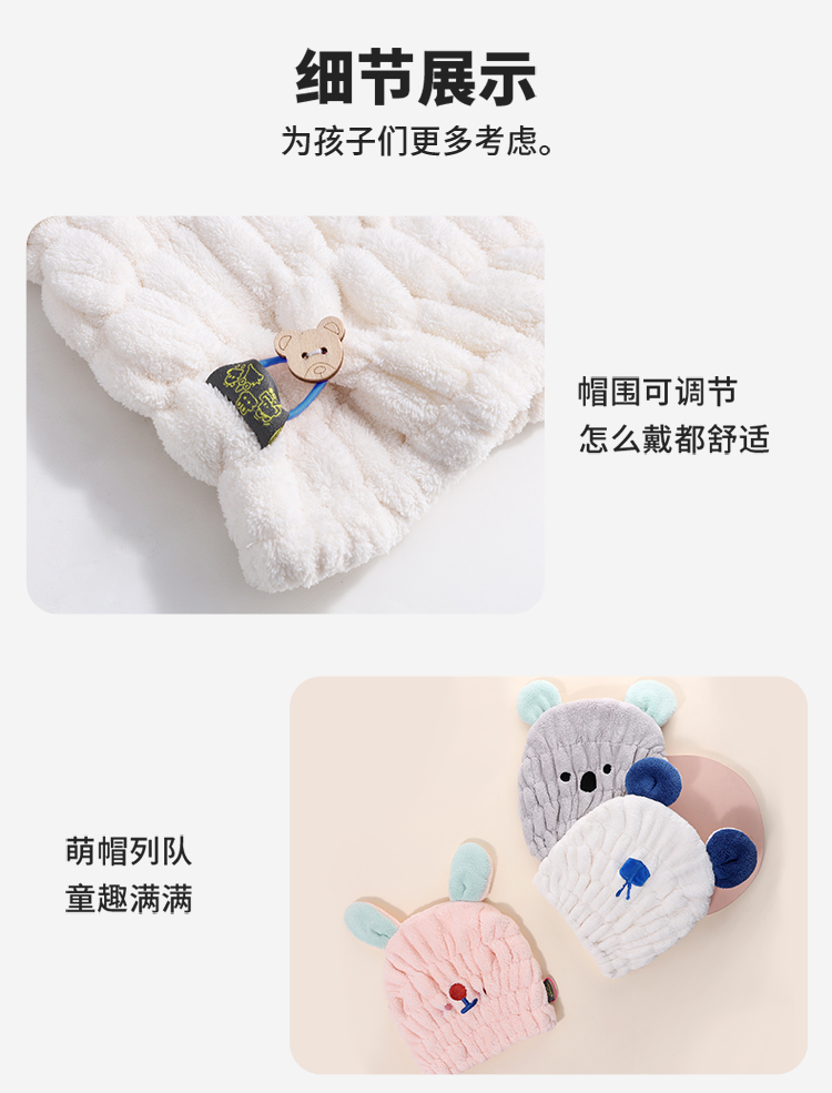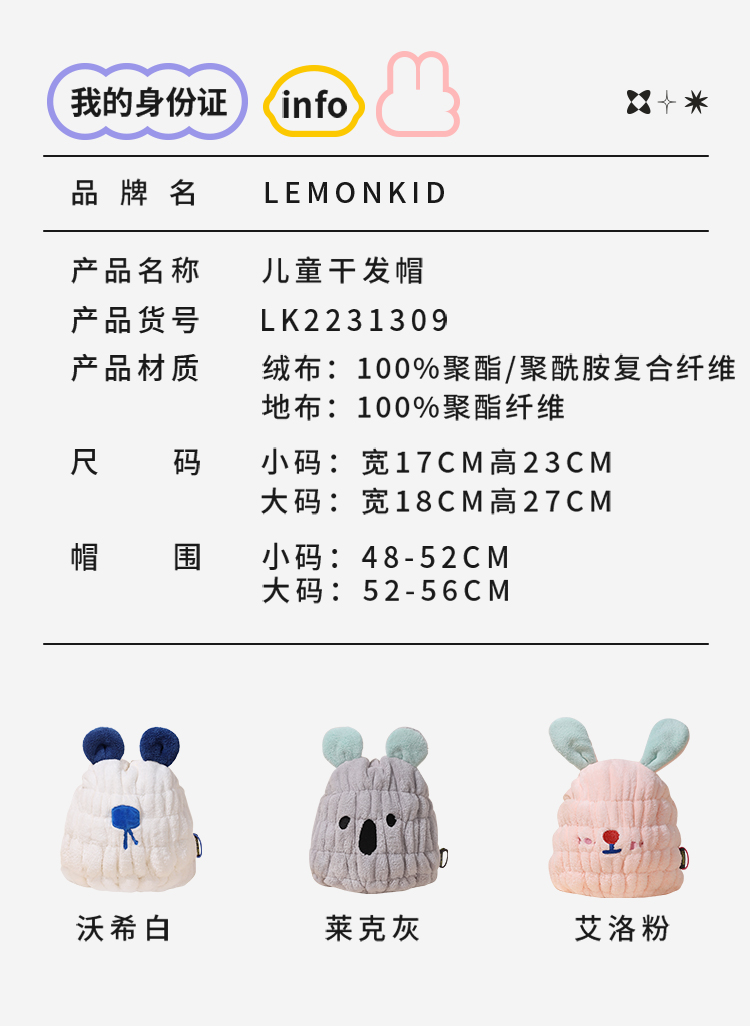 商品名称:柠檬宝宝 Lemonkid干发帽 加厚珊瑚绒吸水速干包头巾 儿童卡通干发毛巾舒适温柔不勒头