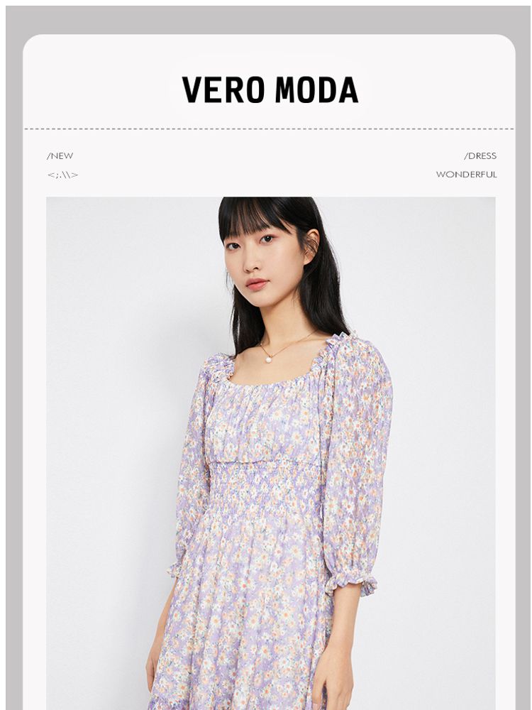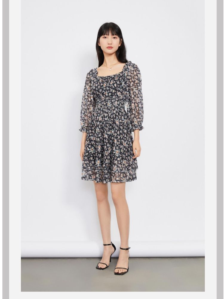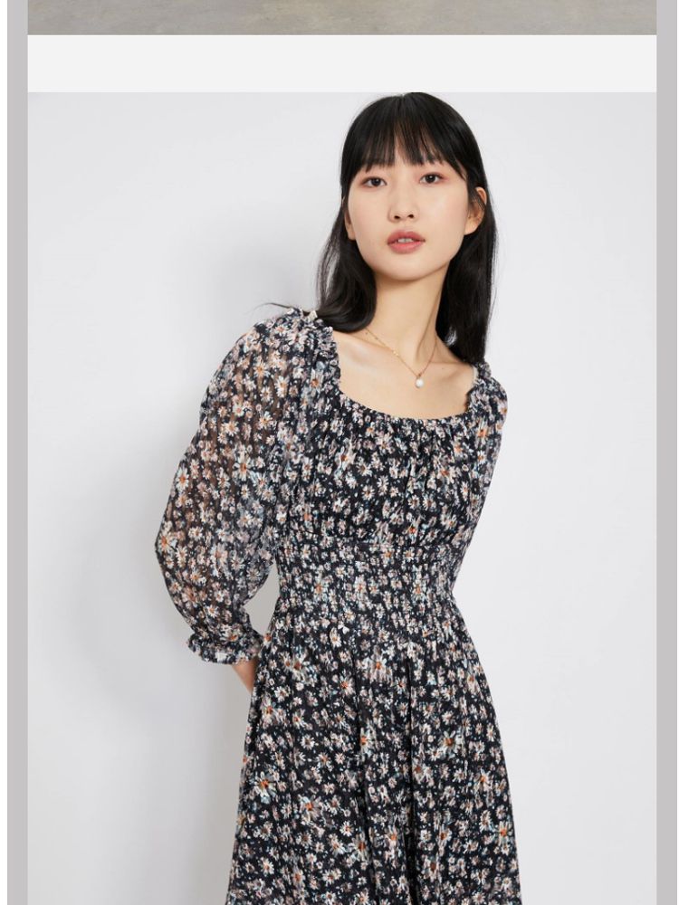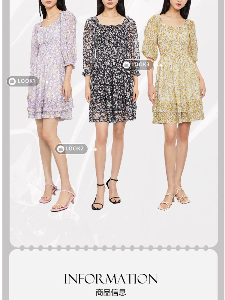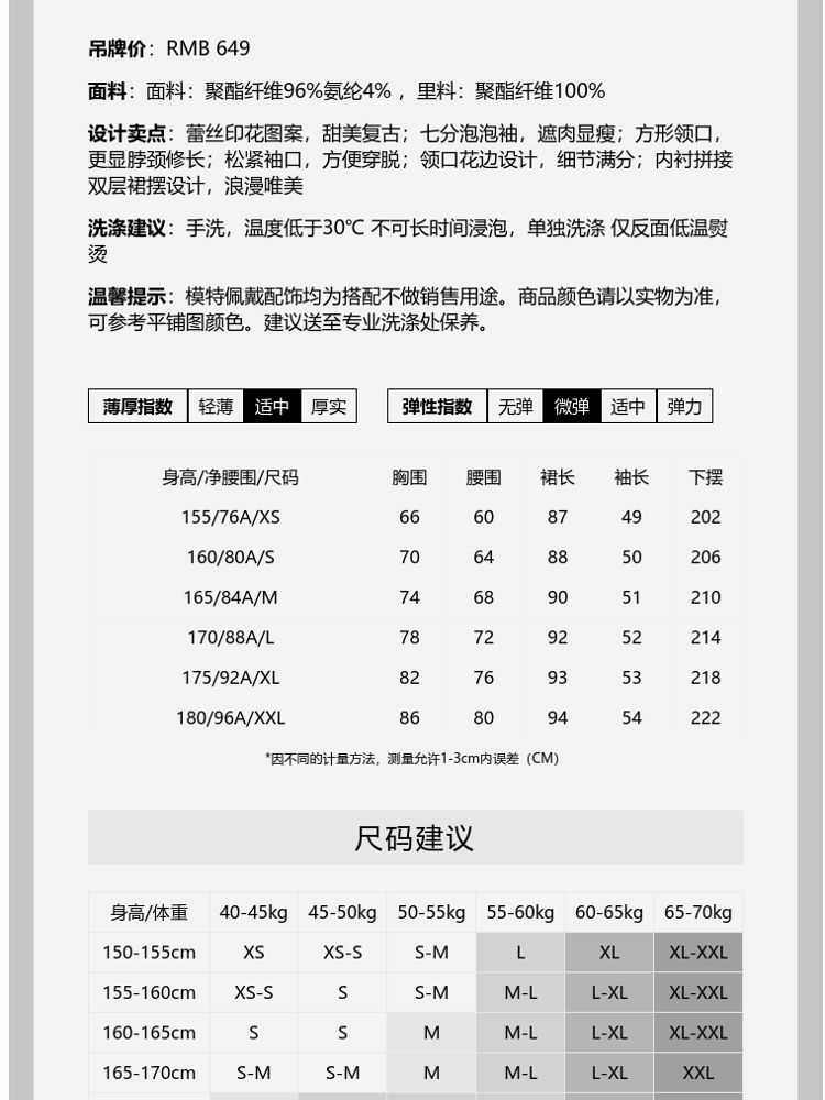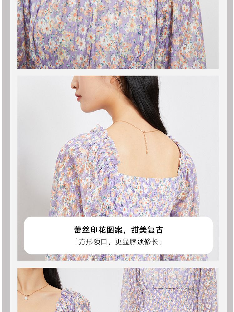 商品名称:【甜美复古小清新】春夏专柜同款方领七分袖蕾丝印花连衣裙百搭 689809