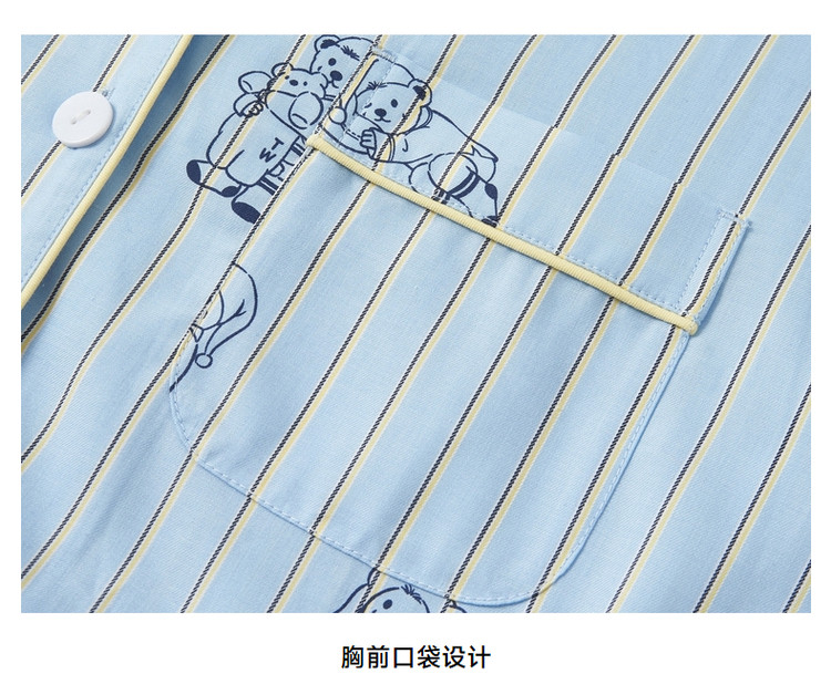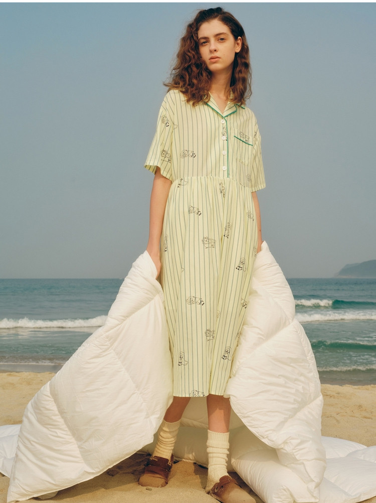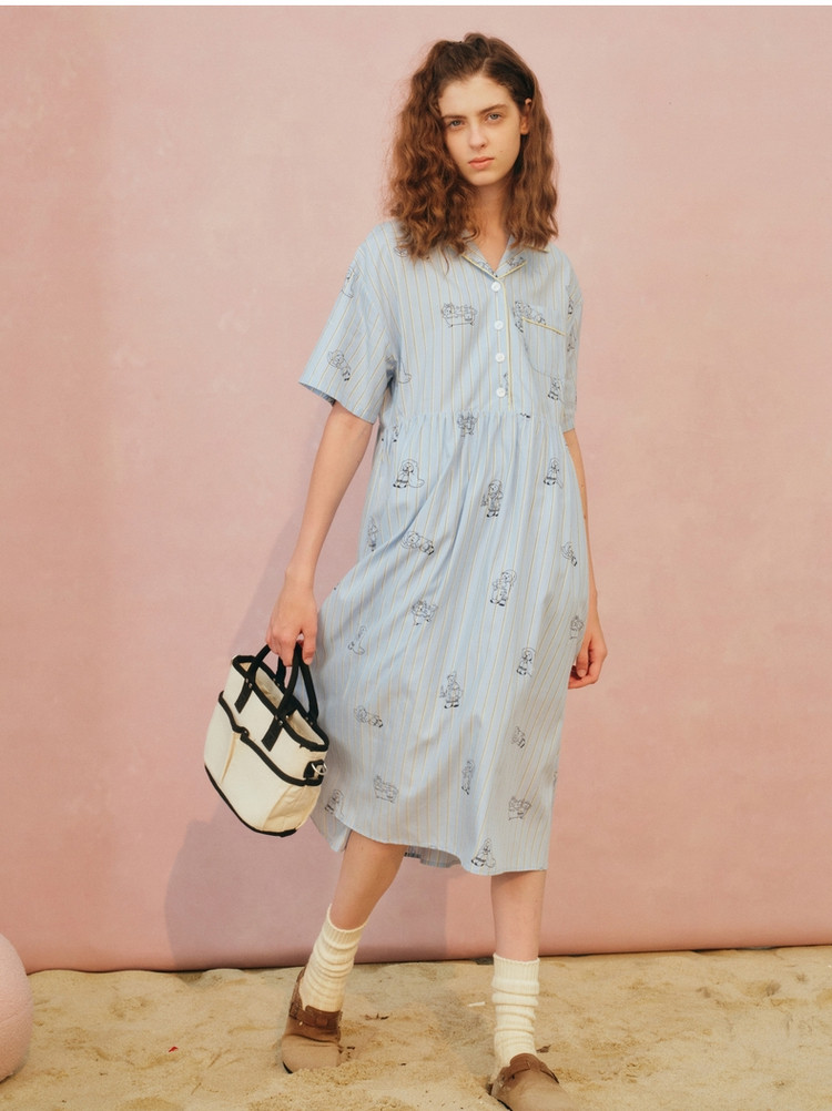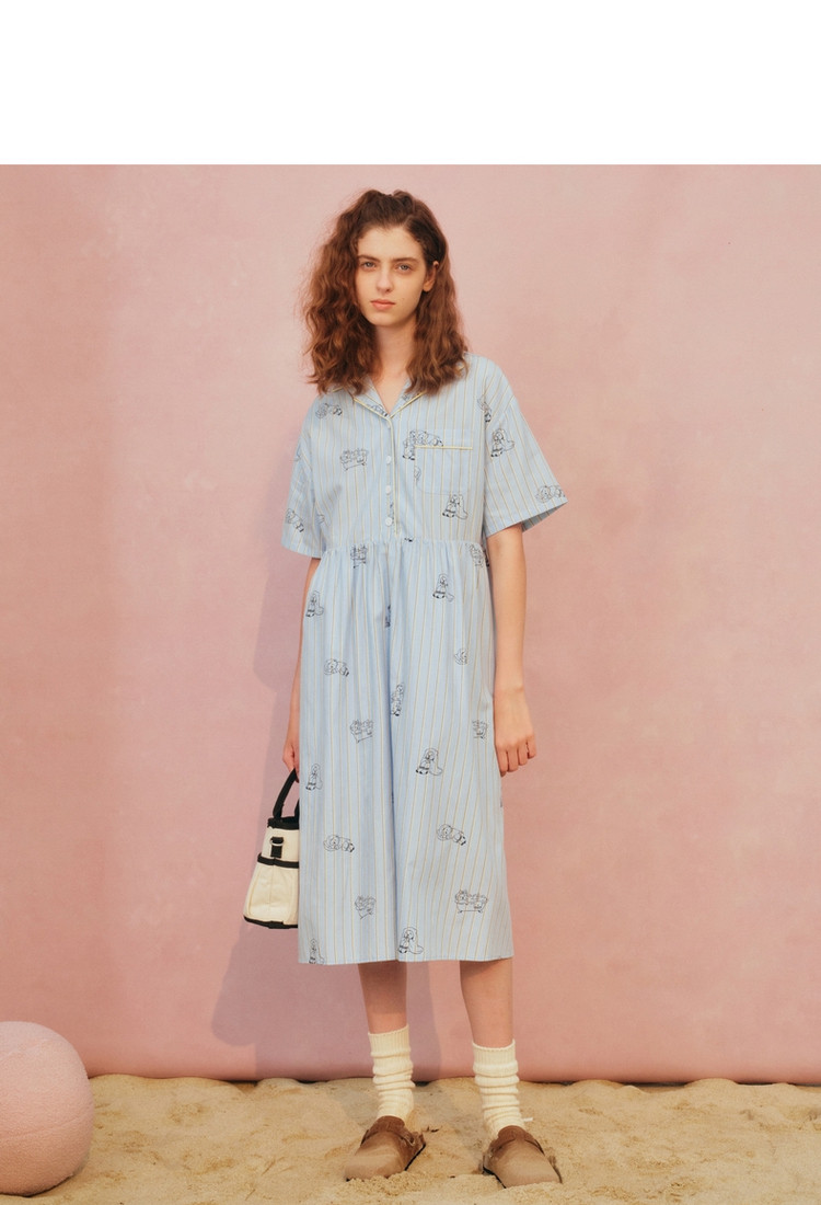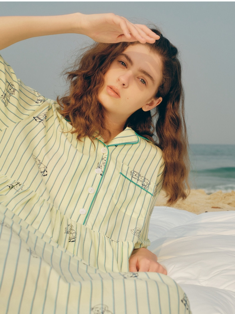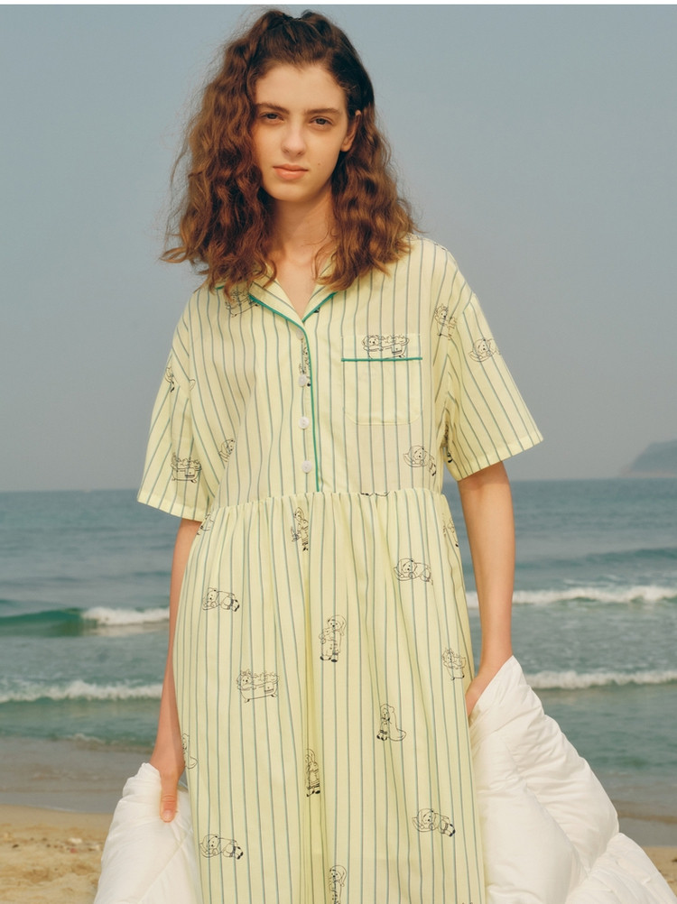 小熊半袖满身刺绣条纹连衣裙家居服女夏休闲舒适睡衣 255169