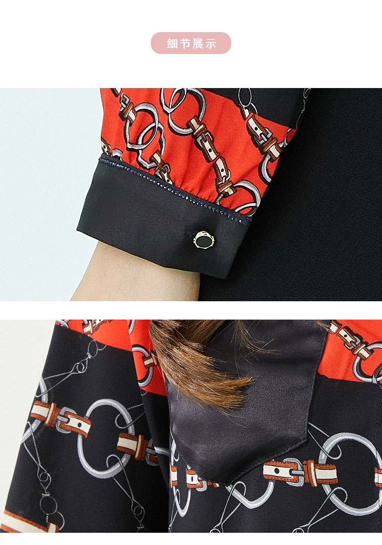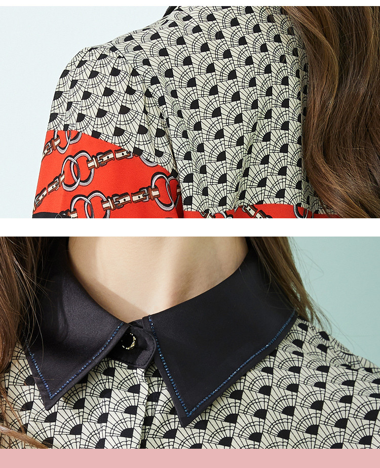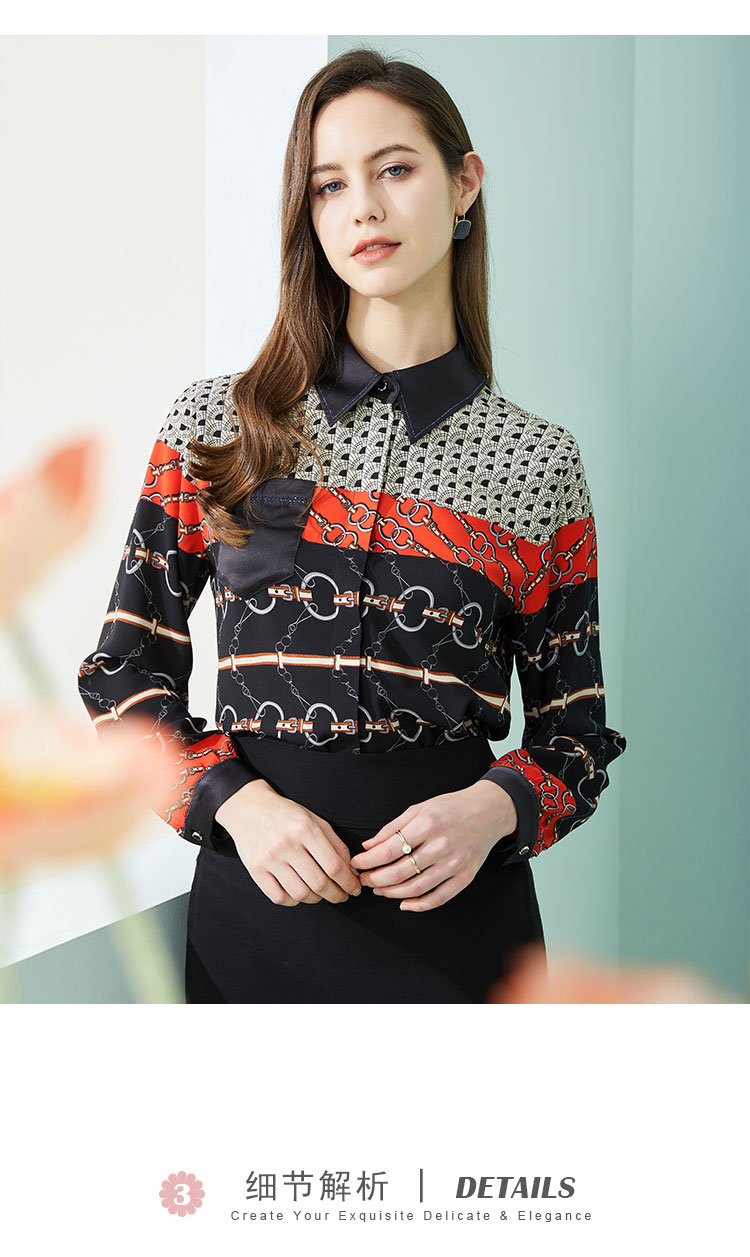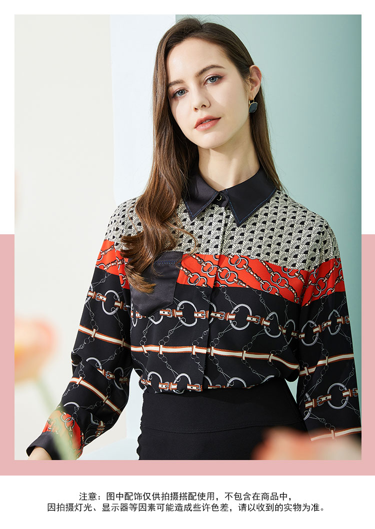 商品名称:春季复古链条印花撞色领子和口袋烫钻长袖女式衬衫 210591